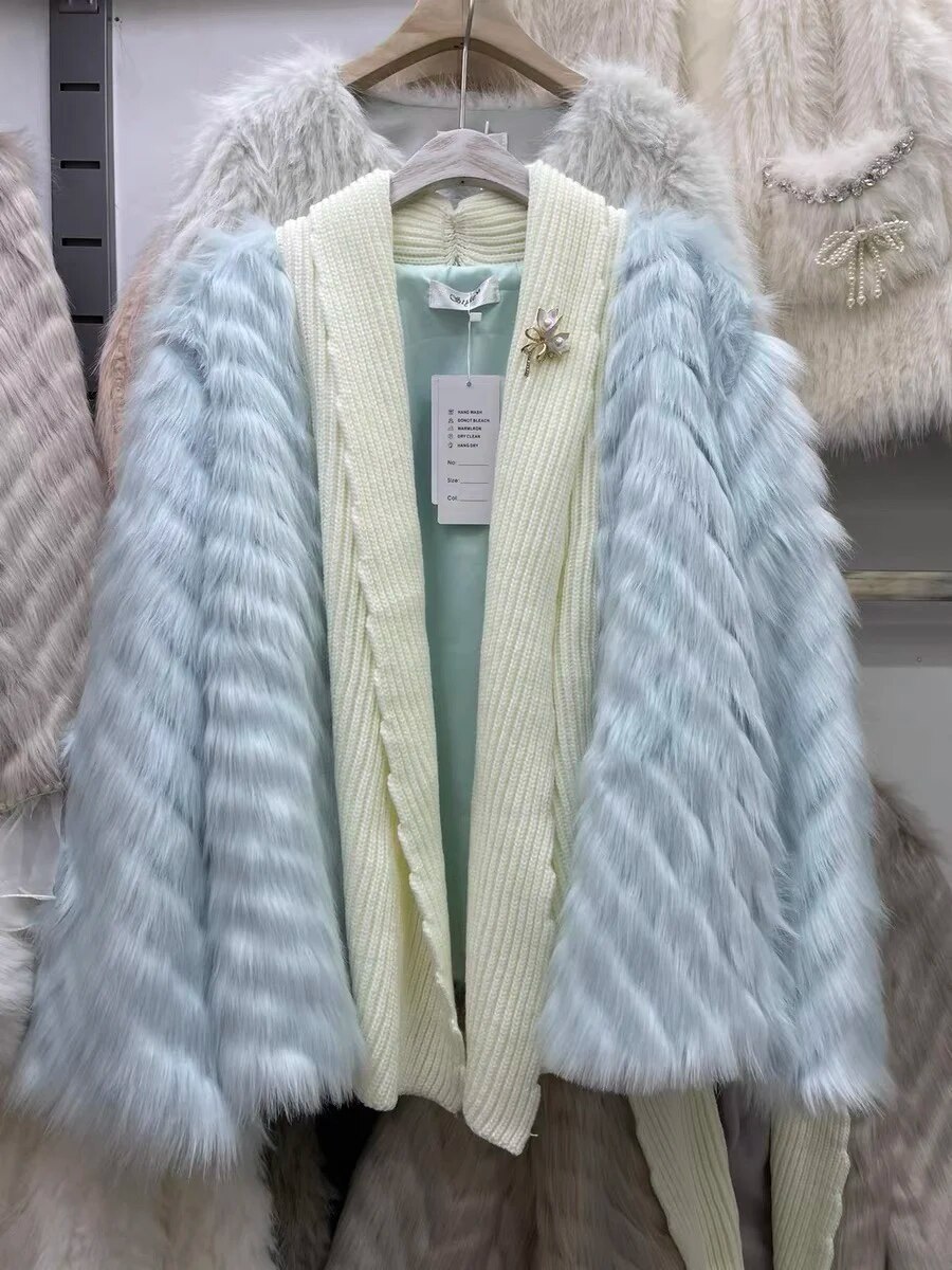 Cashmere Patchwork Cardigans Faux Fur Overcoat