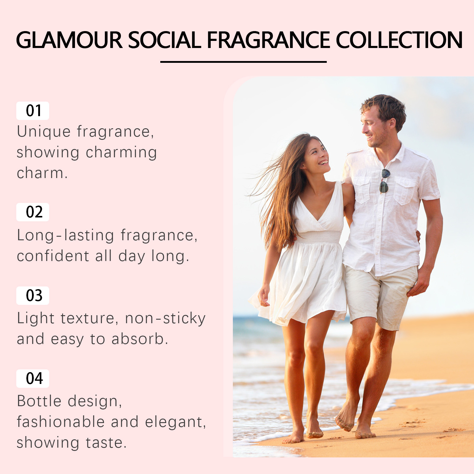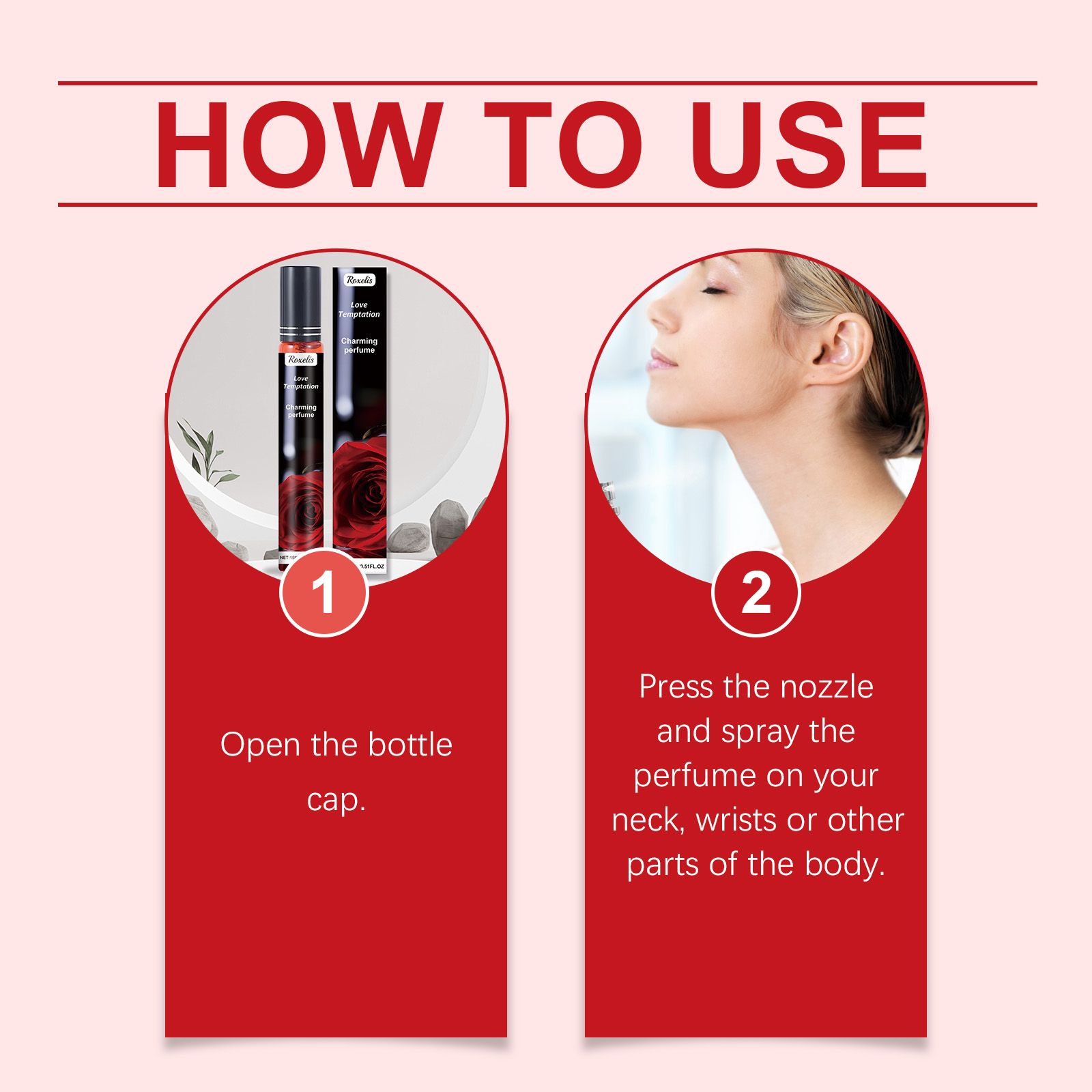 Our Charm Perfume (Rose) contains nicotinamide, rose oil, ellagic acid. It brightens the skin and makes it glow. Gently protects the skin and keeps it moist; Moisturize and rejuvenate skin. How to use it is very simple: 1. Open the bottle cap. 2. Press the nozzle and spray the perfume on your neck, wrists or other parts of your body. Perfect for any occasion and outfit. It can last a long time, ensuring that you can maintain the charming scent all day long.
