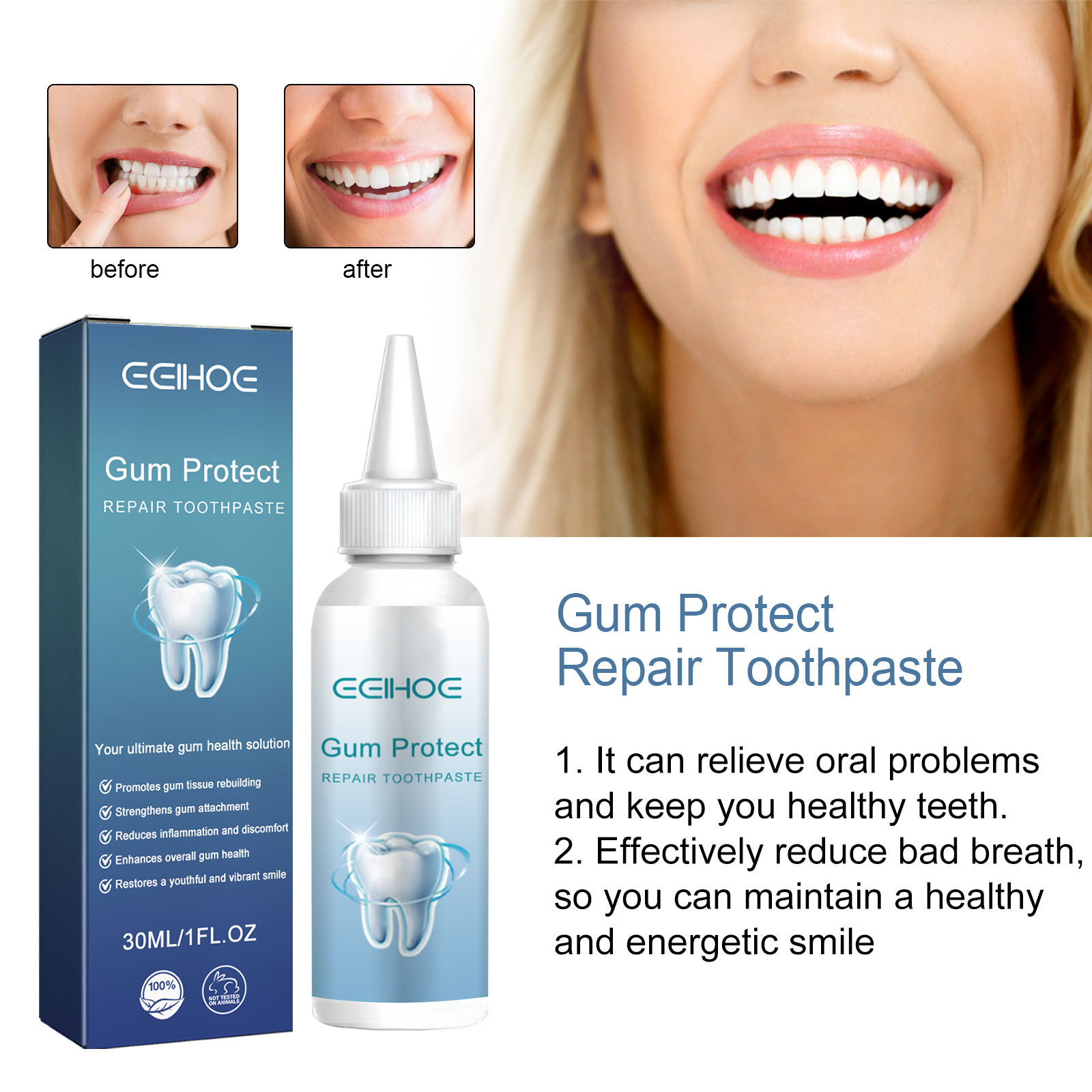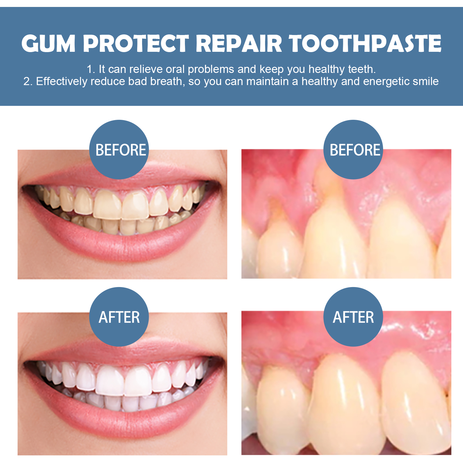 Our gum repair toothpaste contains honeysuckle flower extract and field mint extract. It relieves irritation, swollen gums, effectively reduces bad breath, prevents receding gums, and supports your overall oral health. The way to use it is very simple: squeeze the appropriate amount of toothpaste onto the toothbrush, brush gently for 1-2 minutes, and then rinse with water until the mouth is clean. It can effectively relieve oral problems, make your teeth healthier, and give you a bright smile.