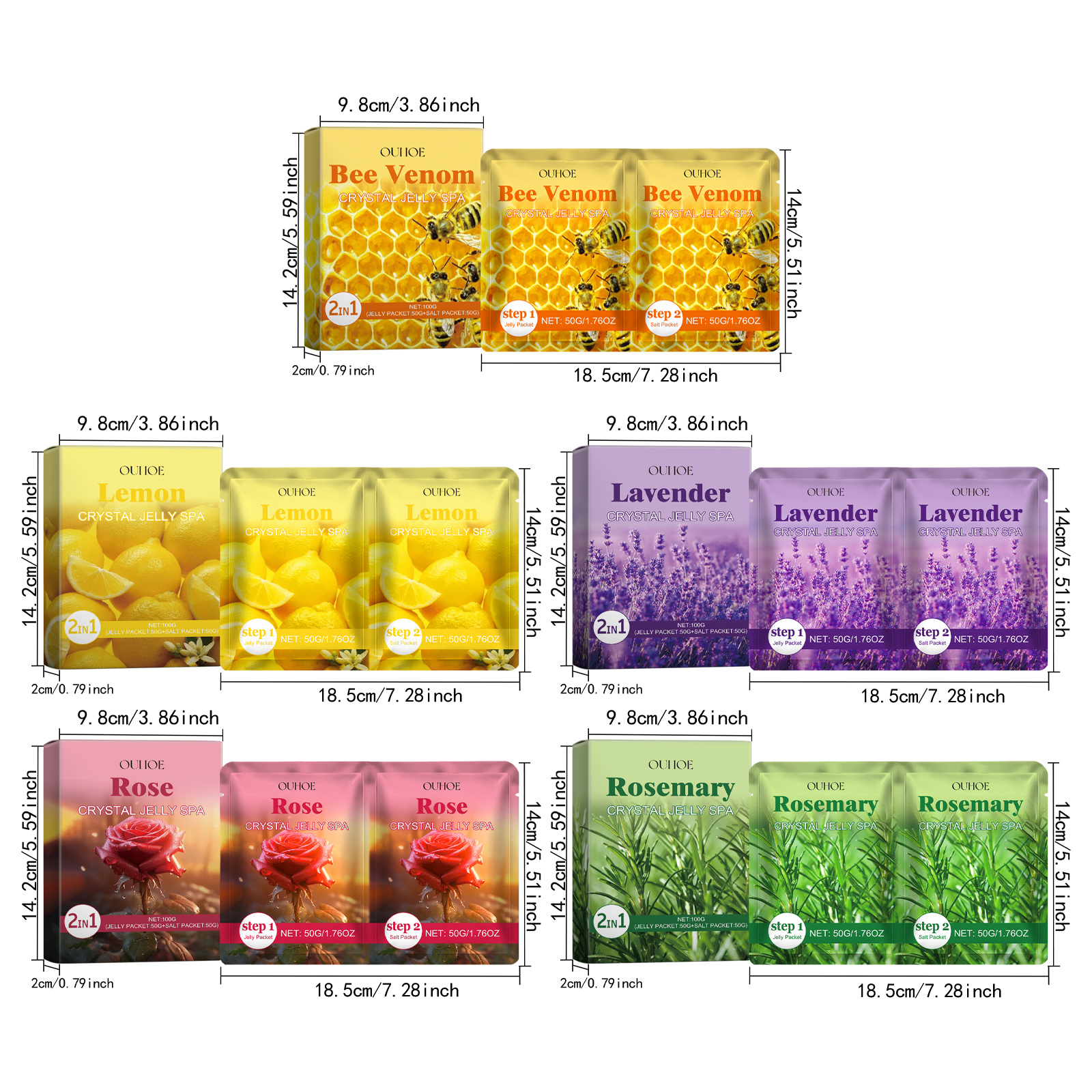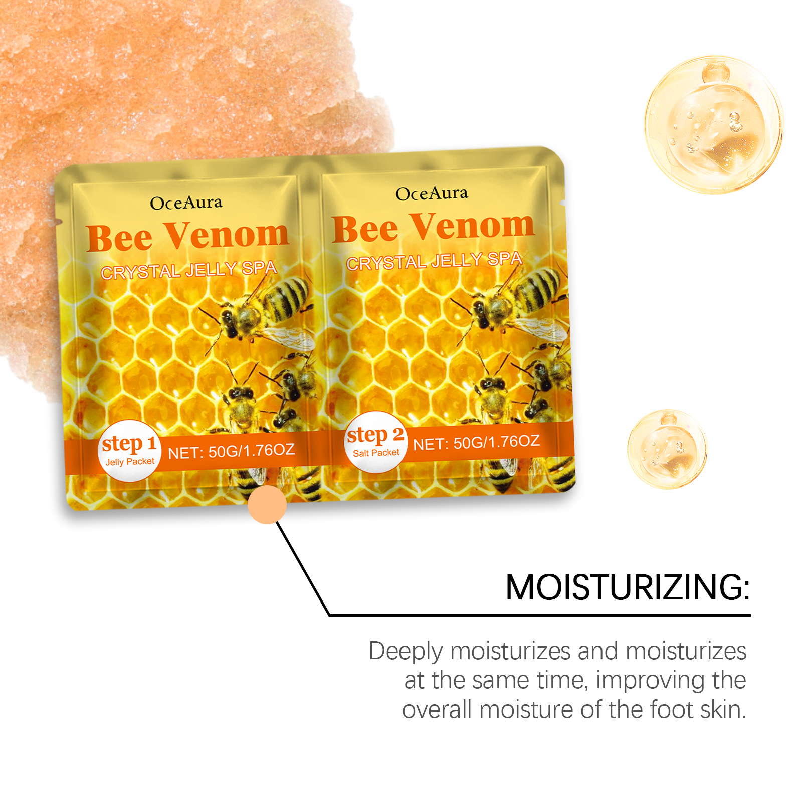 Our exfoliating crystal puree contains jelly packs: polyacrylic, essence; Salt package: Sodium chloride, disodium EDTA. It can exude a light honey aroma to provide you with a soothing and relaxing effect, helping to reduce foot fatigue and tension. Its use is simple: Pour the jelly packet into warm water and stir until it turns. Like jelly, soak your feet for 10-15 minutes. Pour the salt packet into the jelly to dilute. Soak your feet for 3-5 minutes and then wash them with water. It also helps form a protective layer that locks in moisture and improves skin elasticity.
