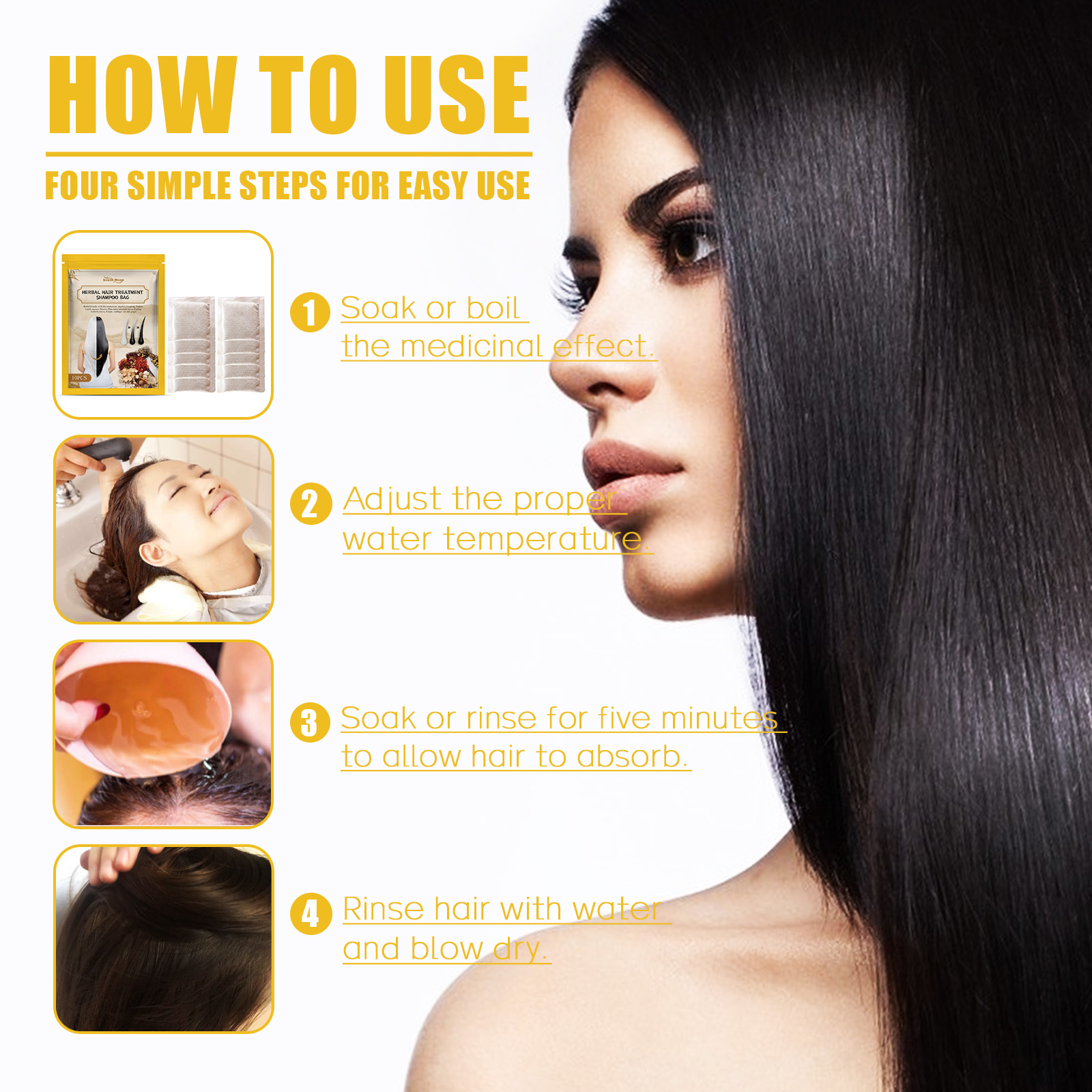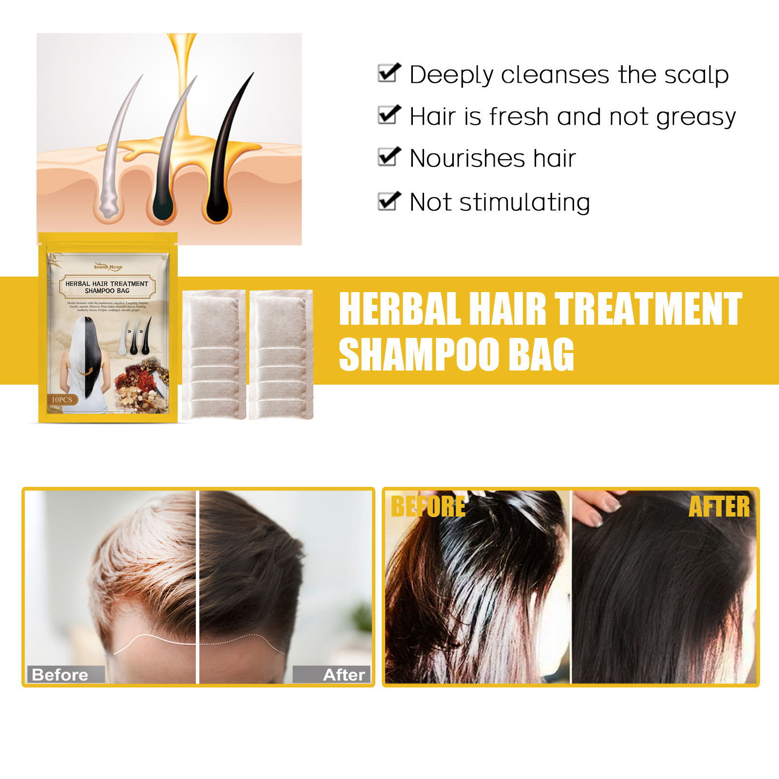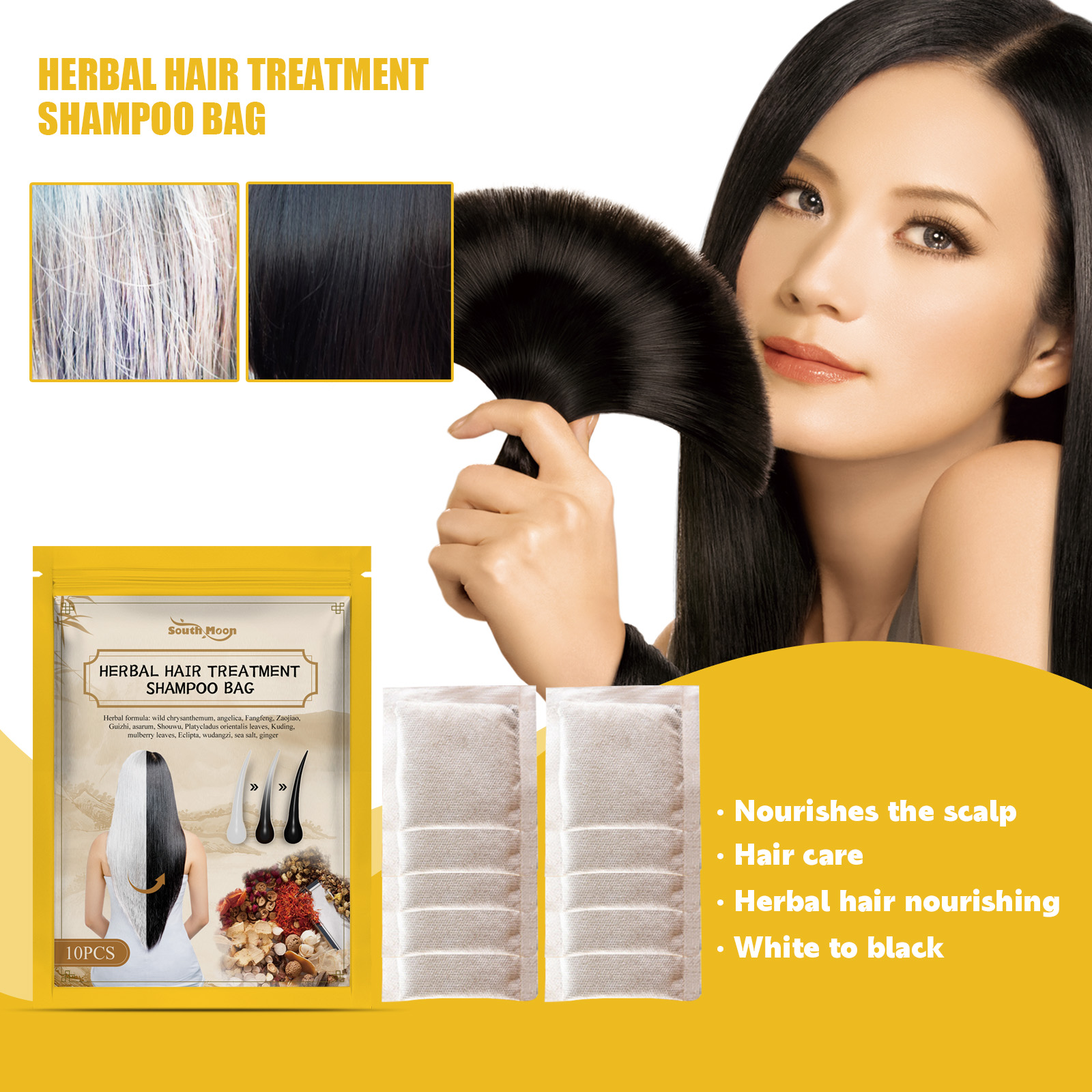 Our black hair shampoo contains wild chrysanthemum, ginger, and platycysts. It nourishes the scalp, promotes blood circulation to the head, and promotes hair growth. Nourish deep scalp and repair damaged hair roots. Balance scalp oil and help blackheads grow. Its use method is very simple: 1. soaking or boiling efficacy; 2. Adjust the water temperature of the propeller; 3. Soak or rinse for five minutes. Make the hair absorb. 4. Rinse and dry your hair with water. Dark hair shampoo package deeply cleans scalp, refreshing hair without greasy, nourishing hair.