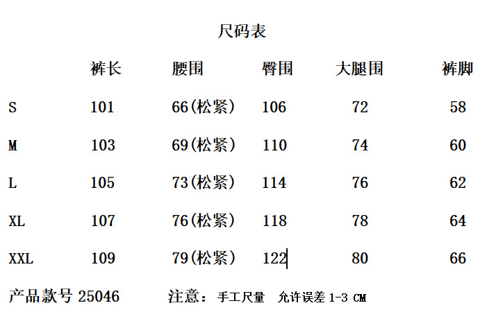 | Size | Pants Length | Waist Size | Hip Size | Thigh Size | Cuff |
