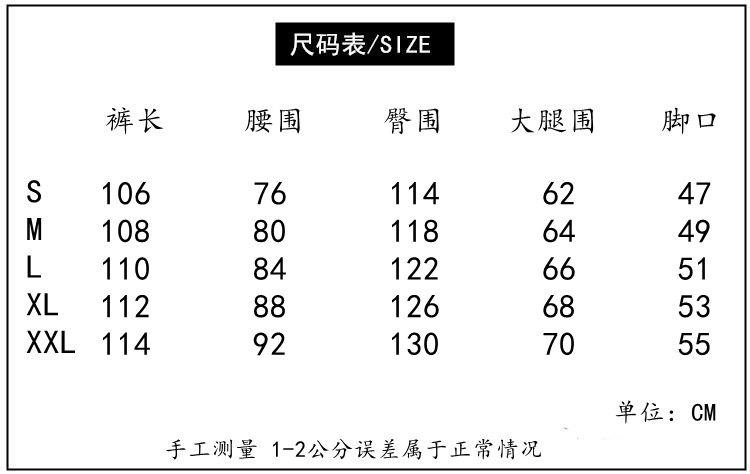 | Size | Pants Length | Waist Size | Hip Size | Thigh Circumference | Ankle Opening |