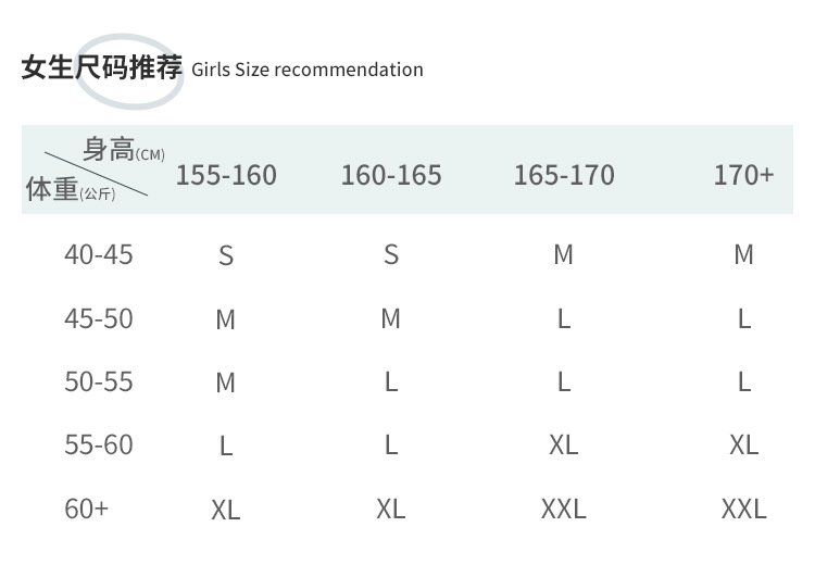 | Weight (kg) | Height (cm) | 155-160 | 160-165 | 165-170 | 170+ |