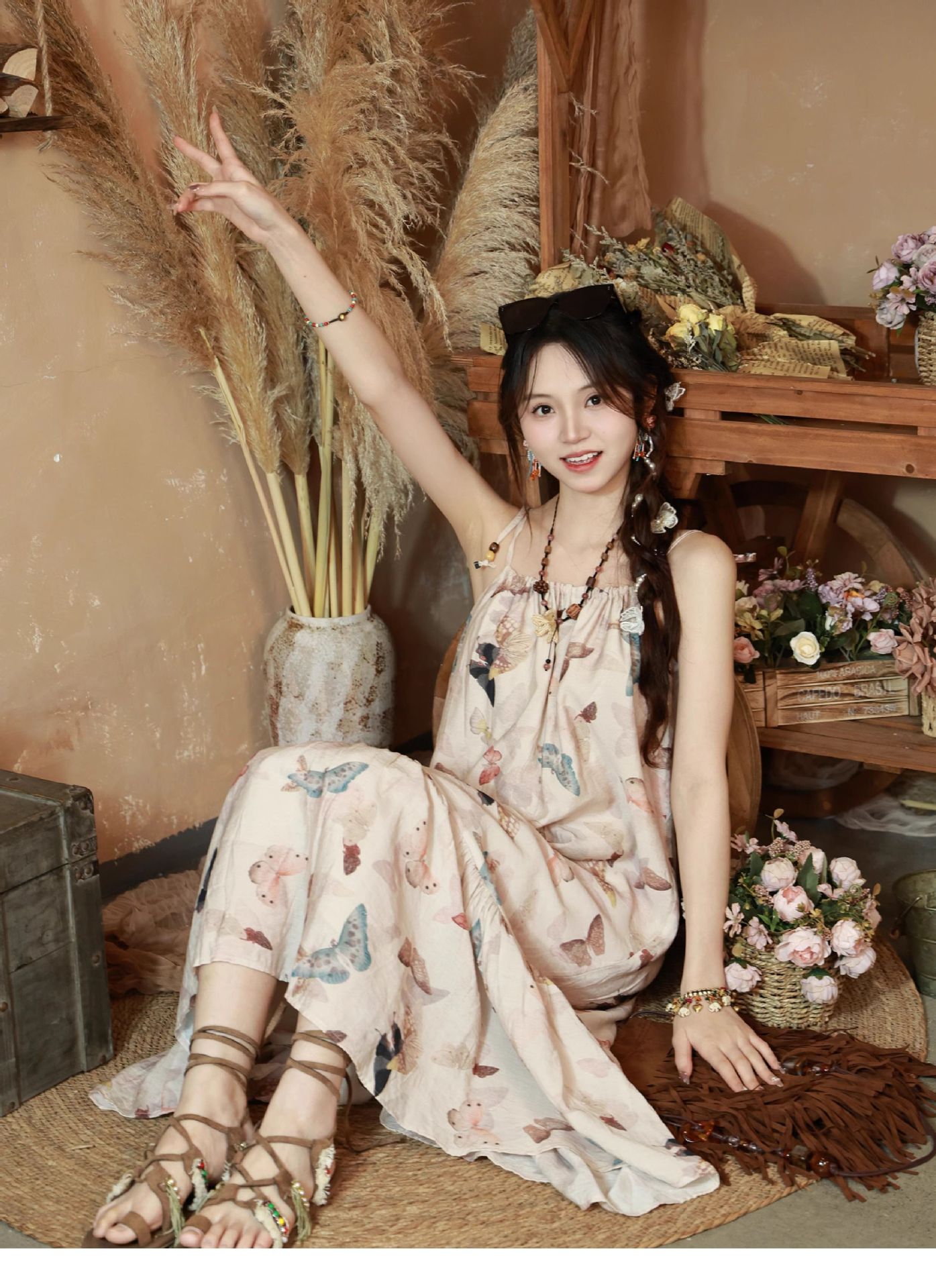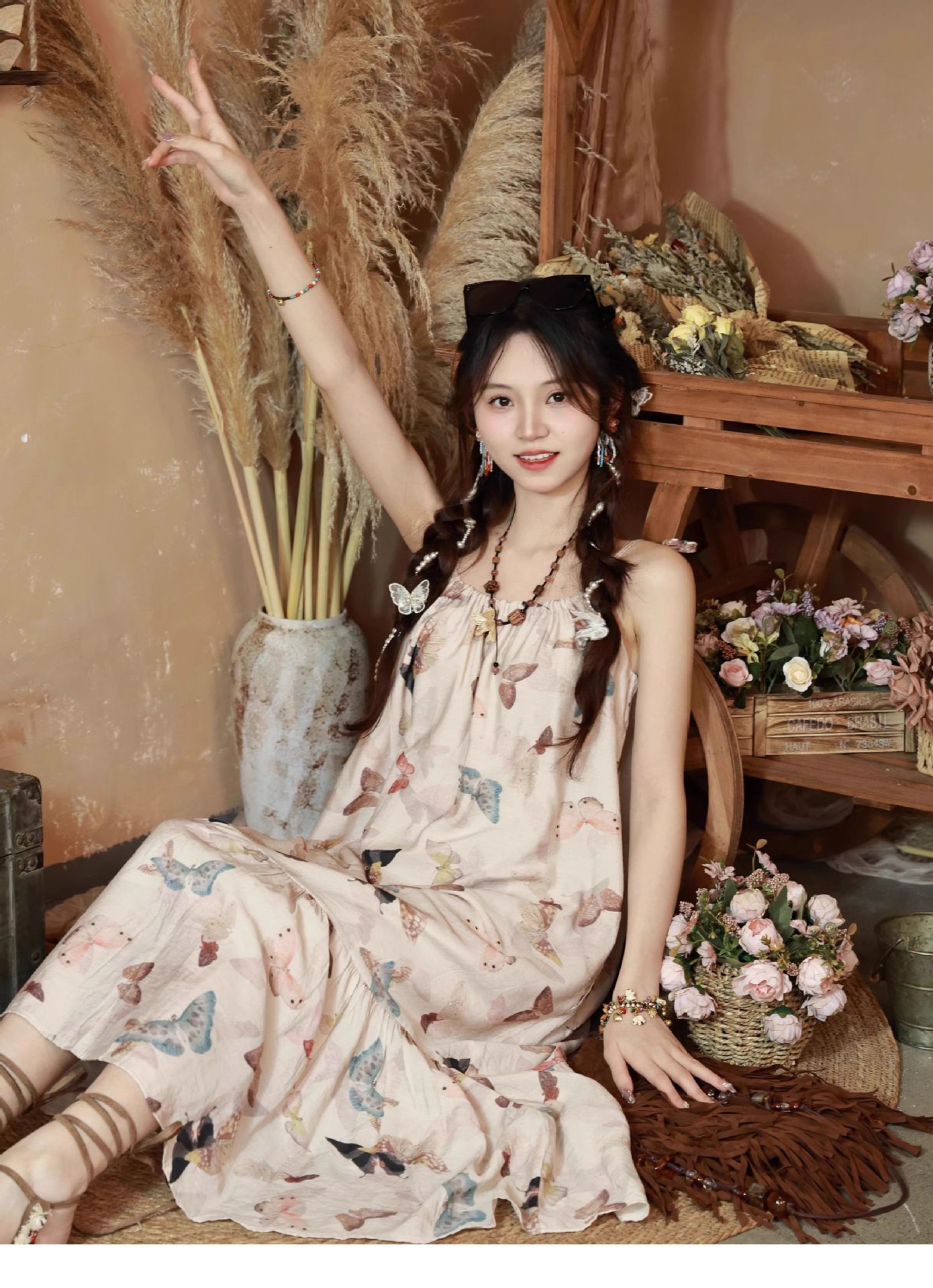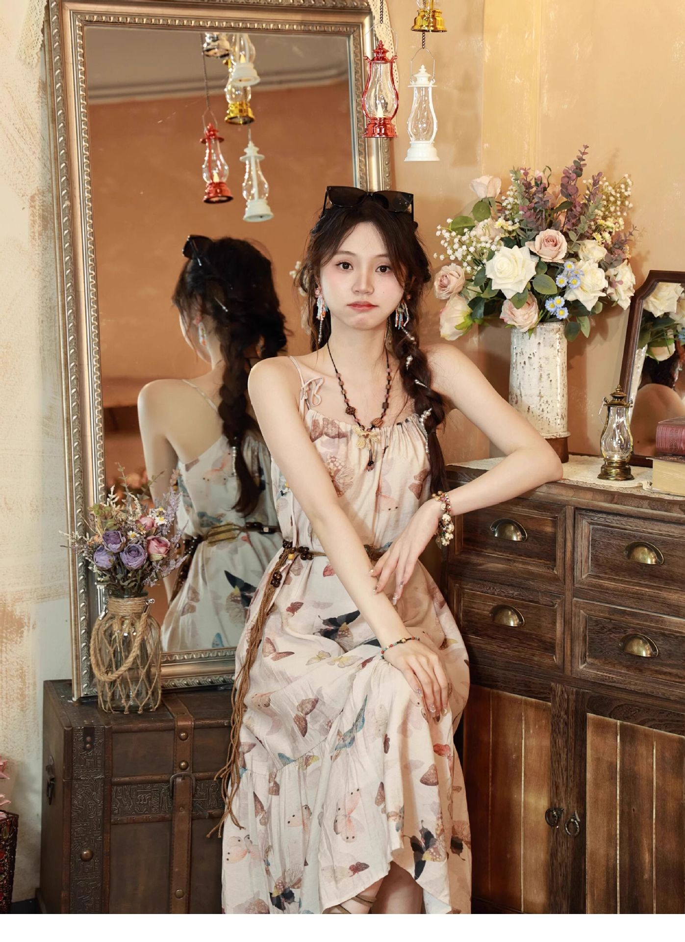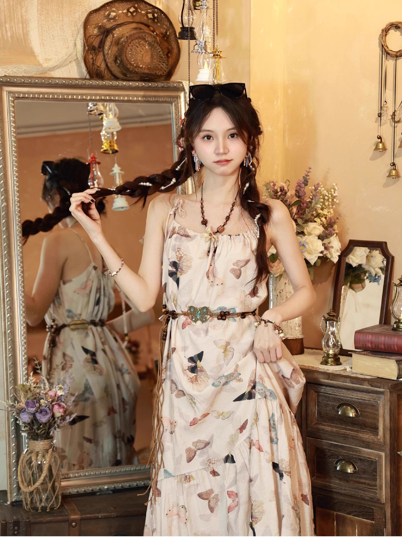 All Products Fashion & Clothing Dresses Bohemian Vintage Sweet Long Dress with Butterfly Print, Floral Beaded Loose Slimming Strap Dress