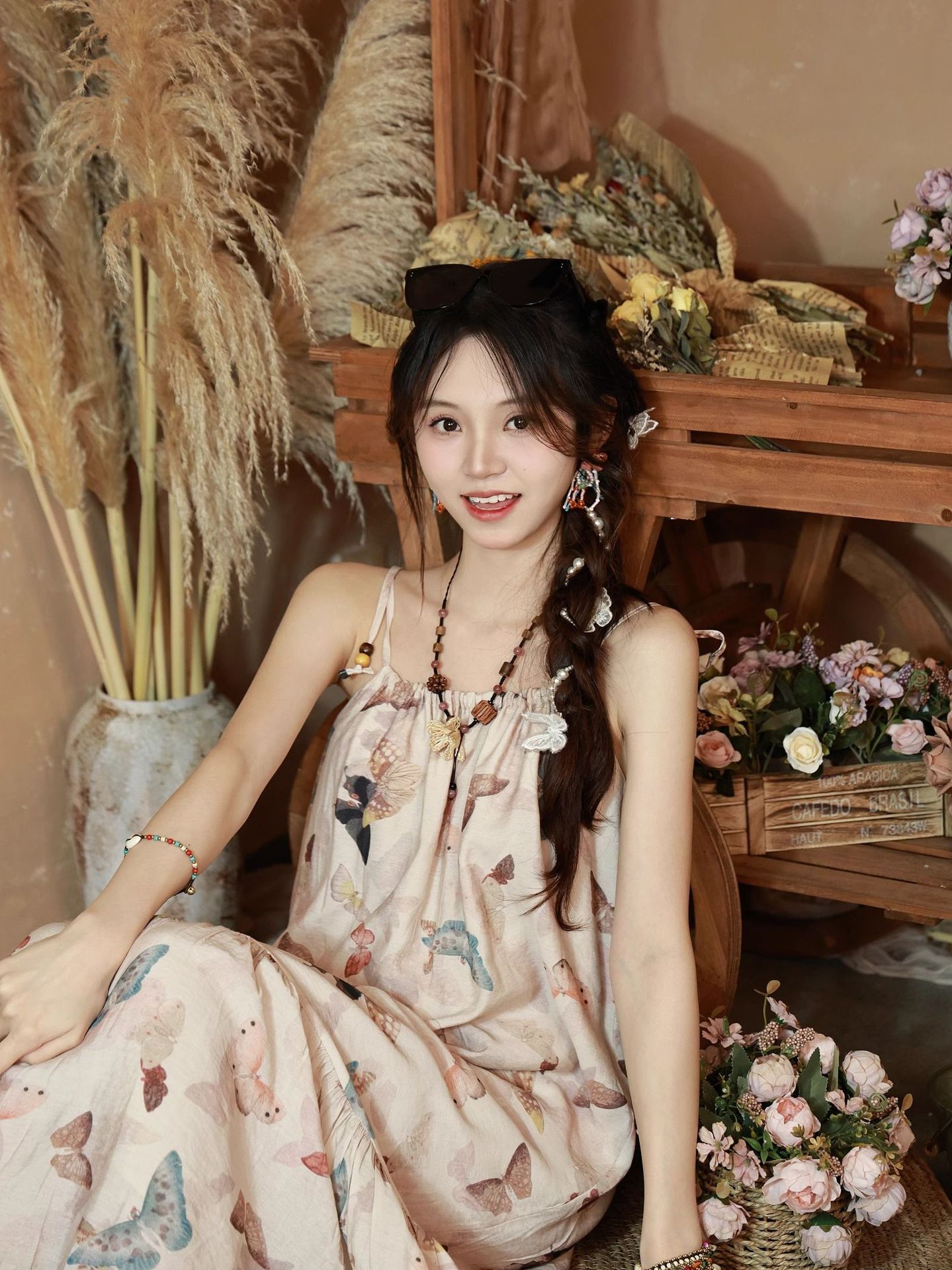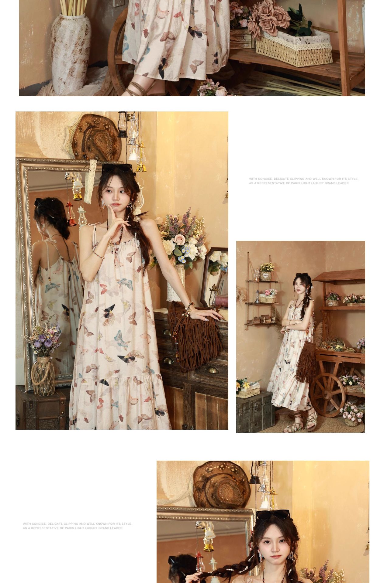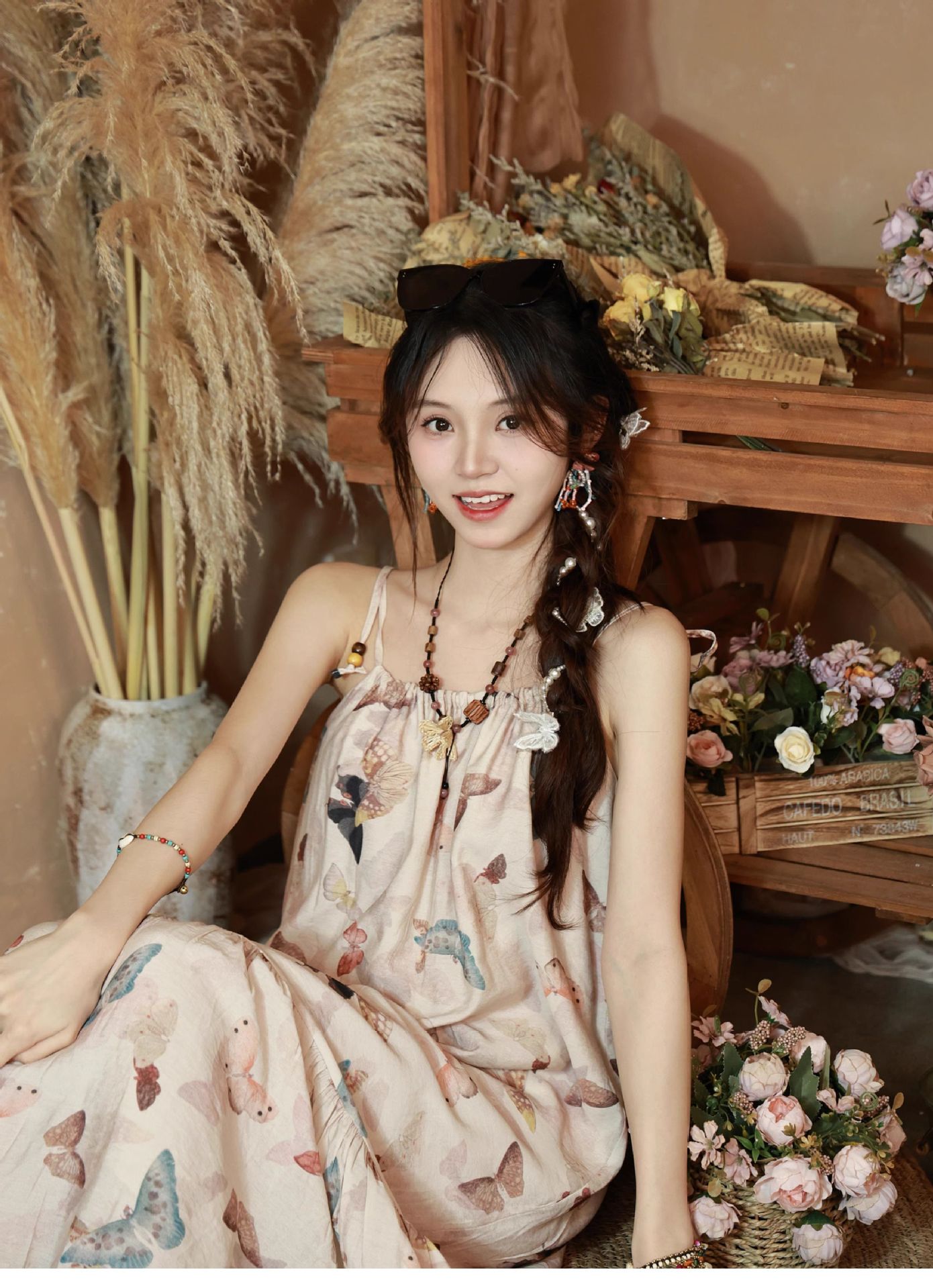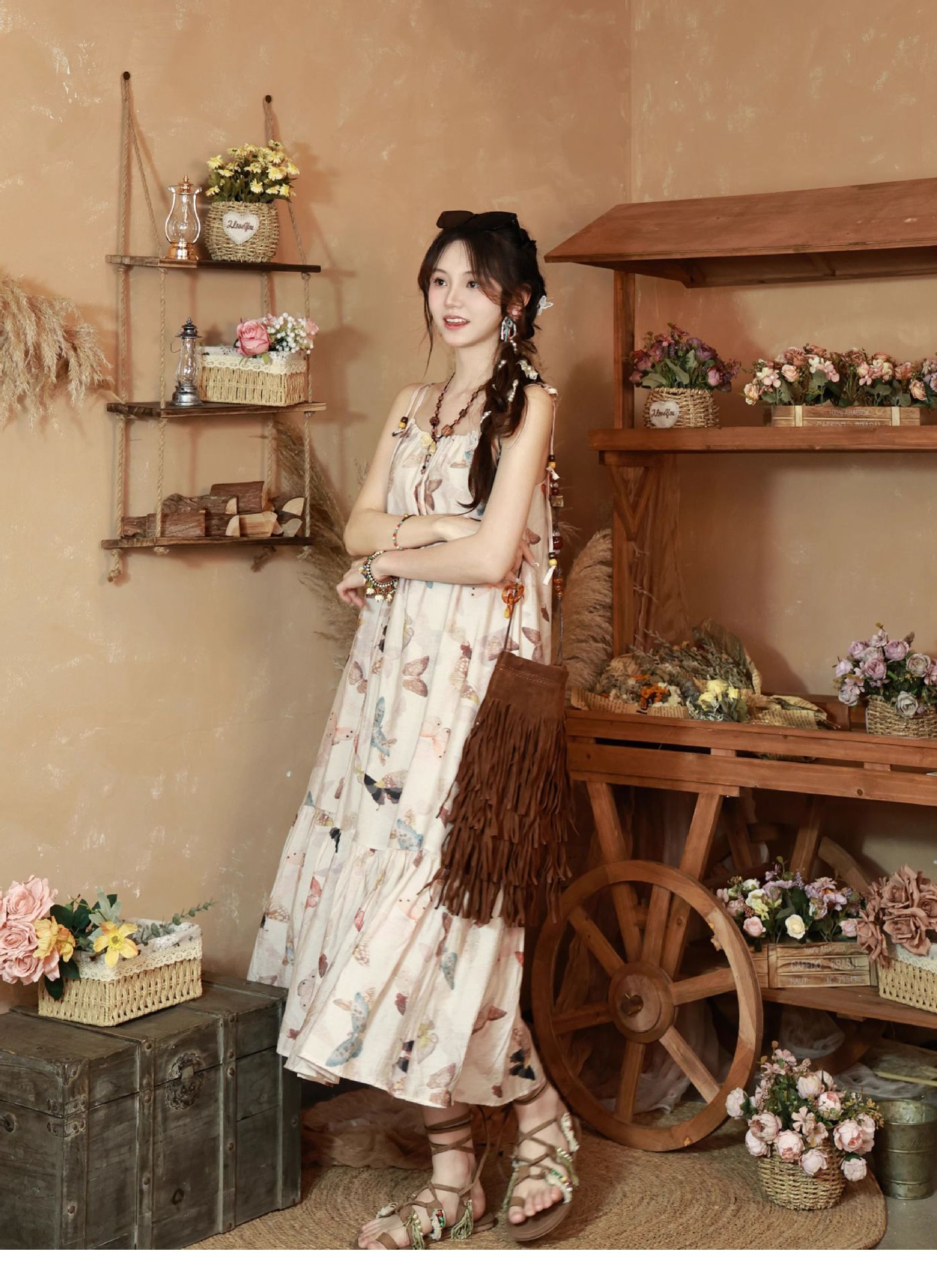 All Products Fashion & Clothing Dresses Bohemian Vintage Sweet Long Dress with Butterfly Print, Floral Beaded Loose Slimming Strap Dress