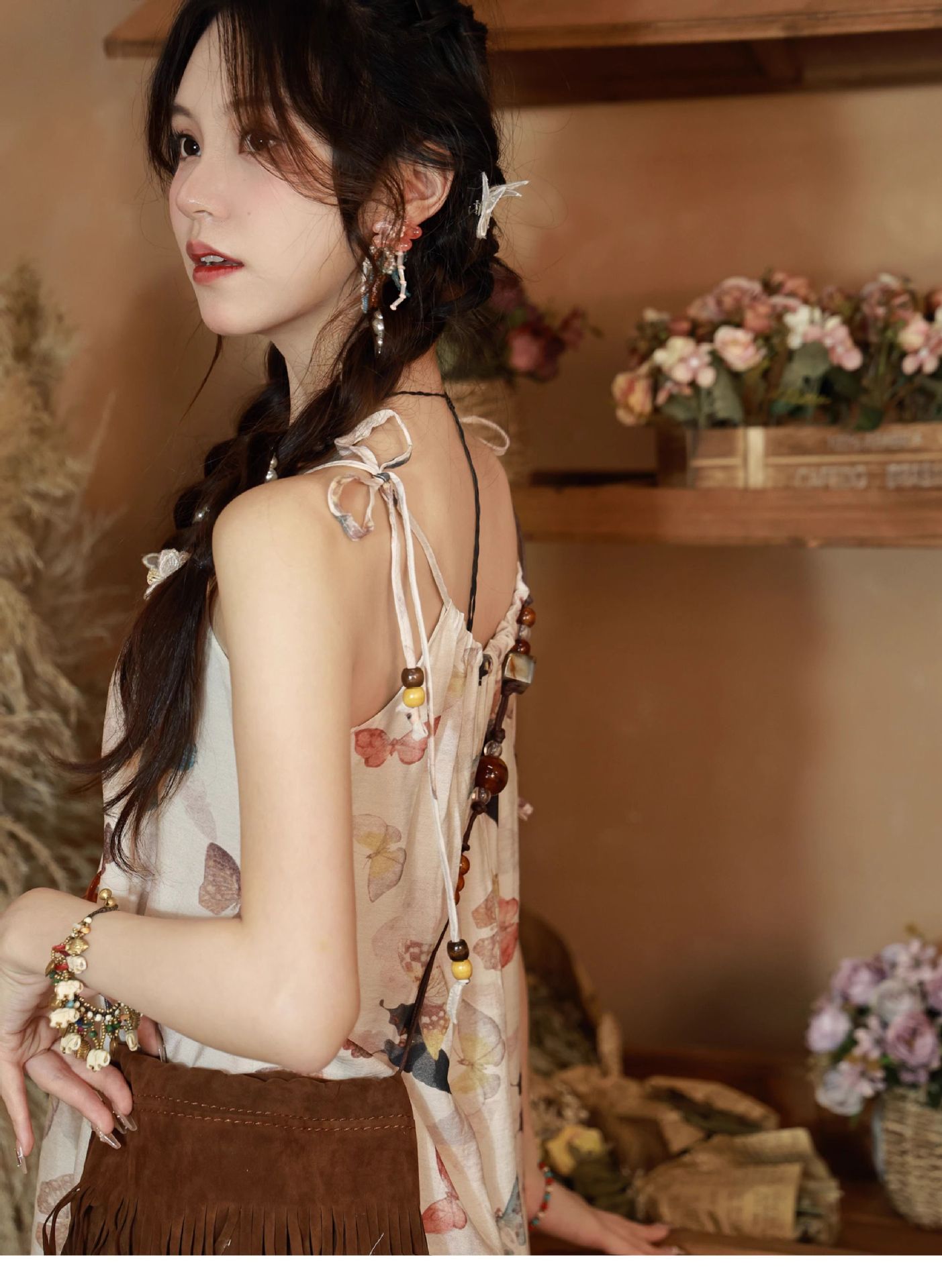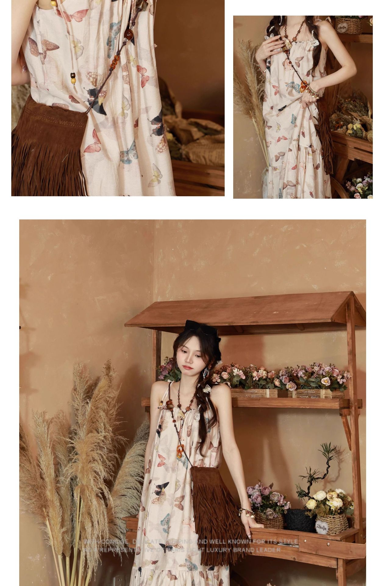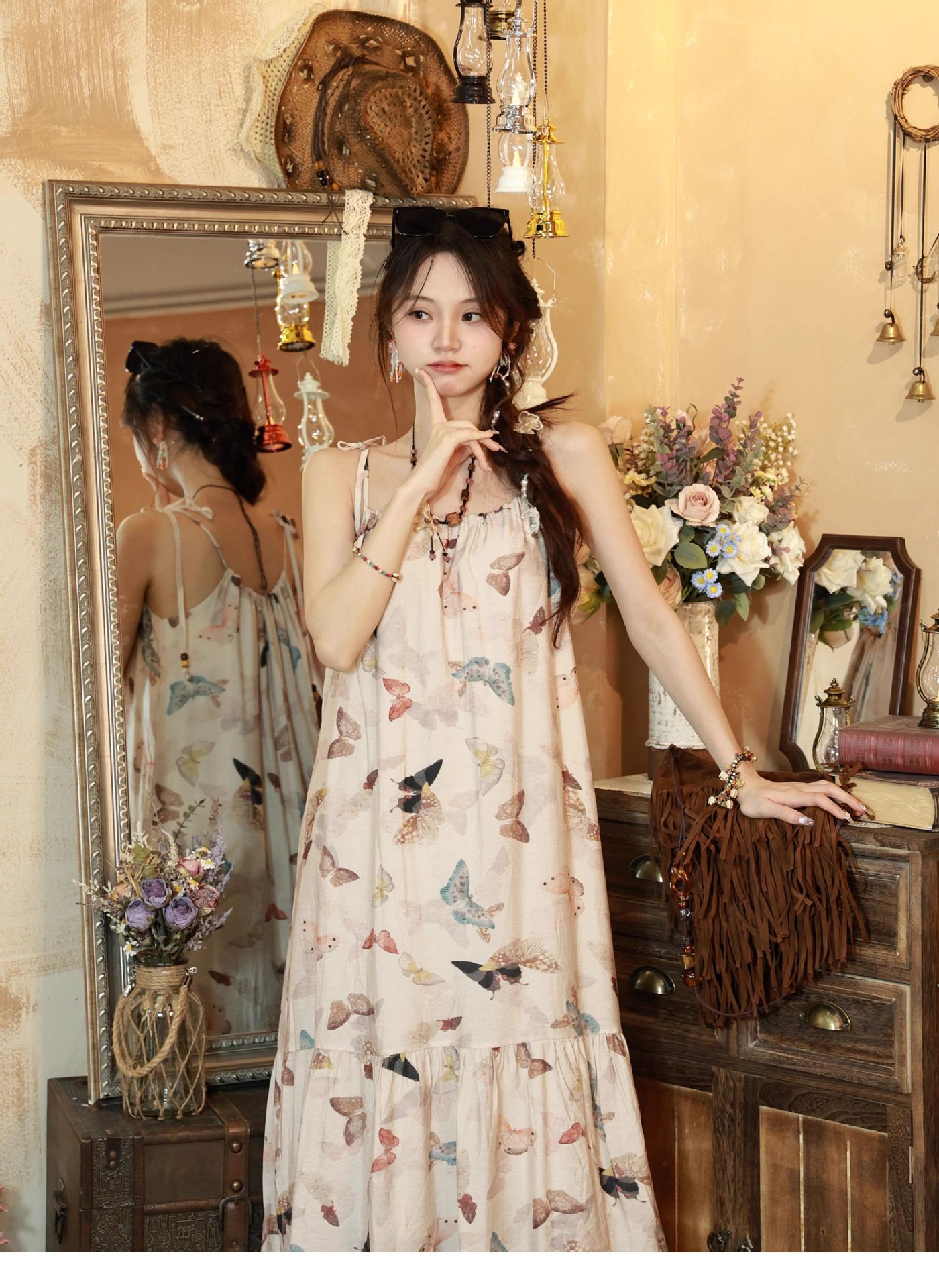 Bohemian Vintage Sweet Long Dress with Butterfly Print, Floral Beaded Loose Slimming Strap Dress