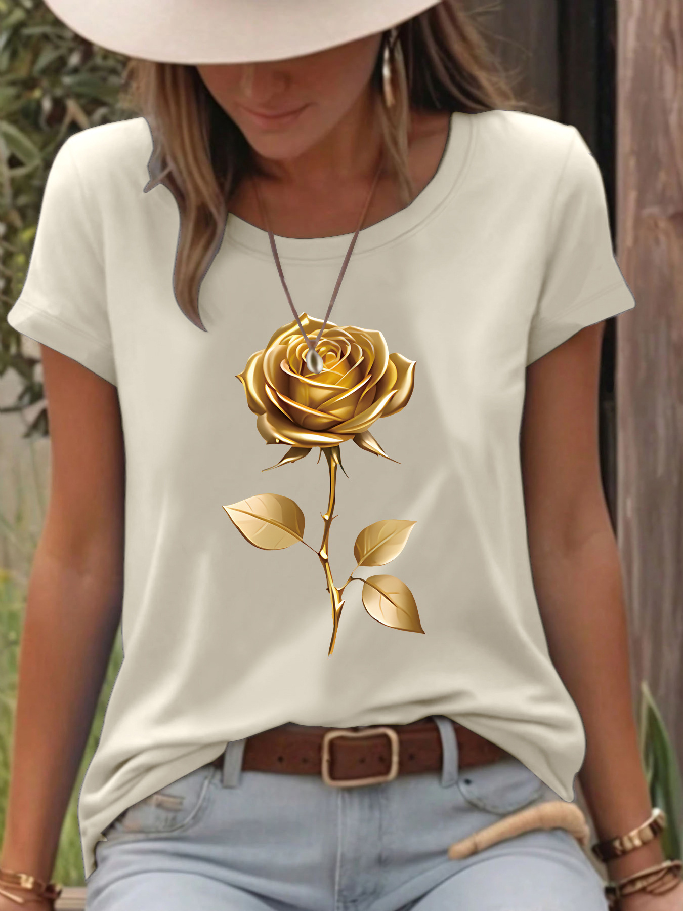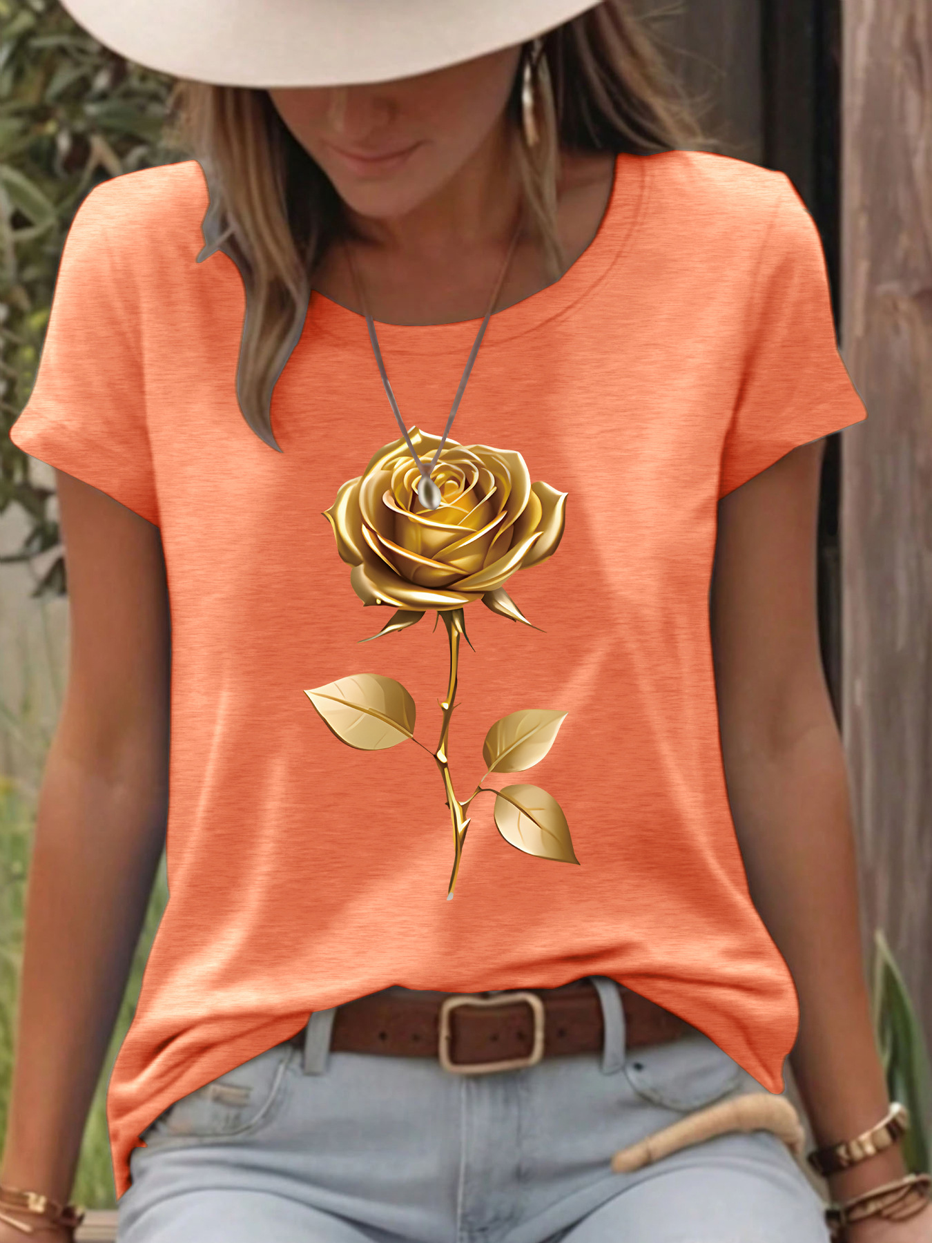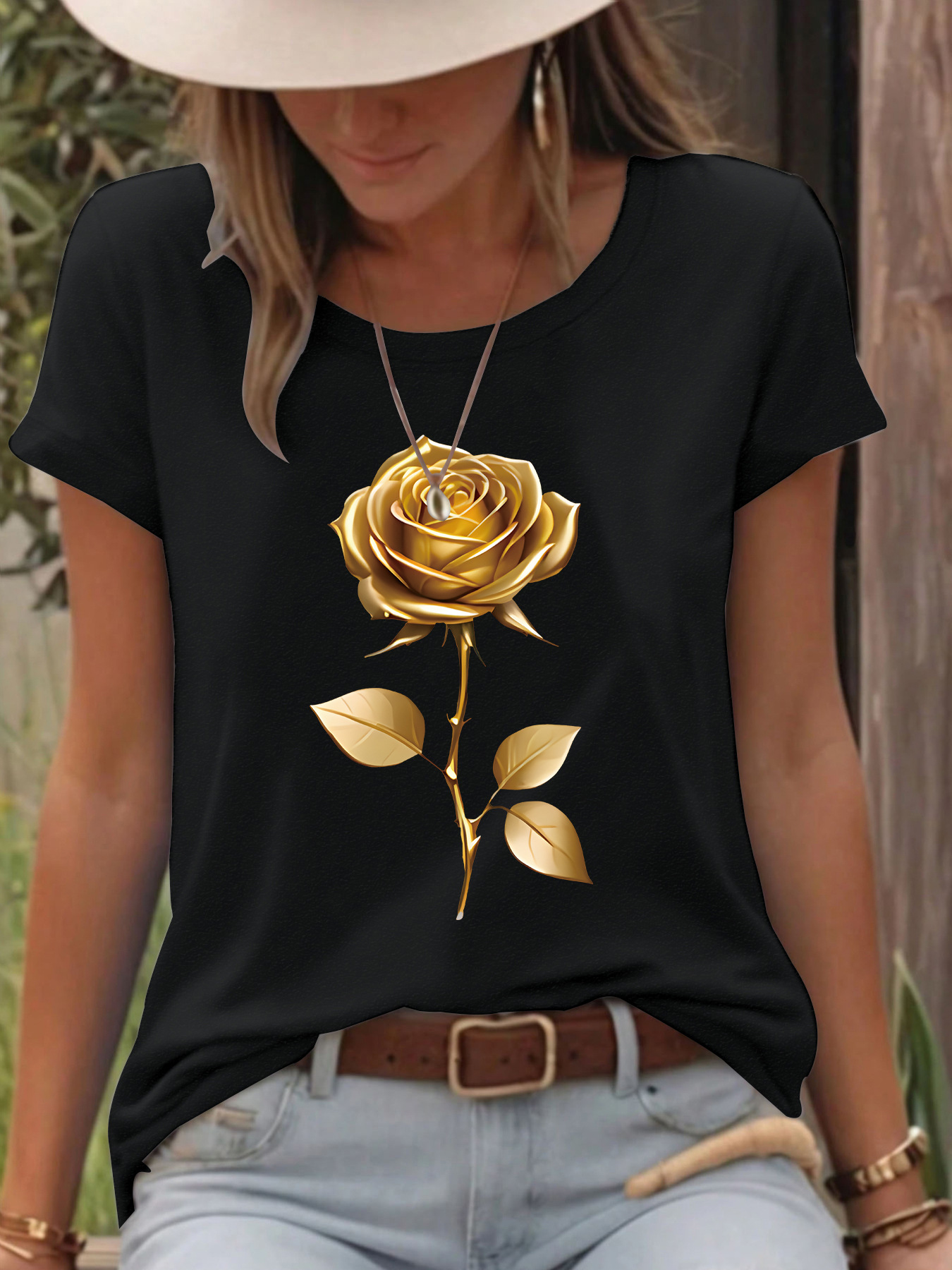 All Products Fashion & Clothing T-Shirts T-shirt gold rose round neck pullover short sleeved shirt