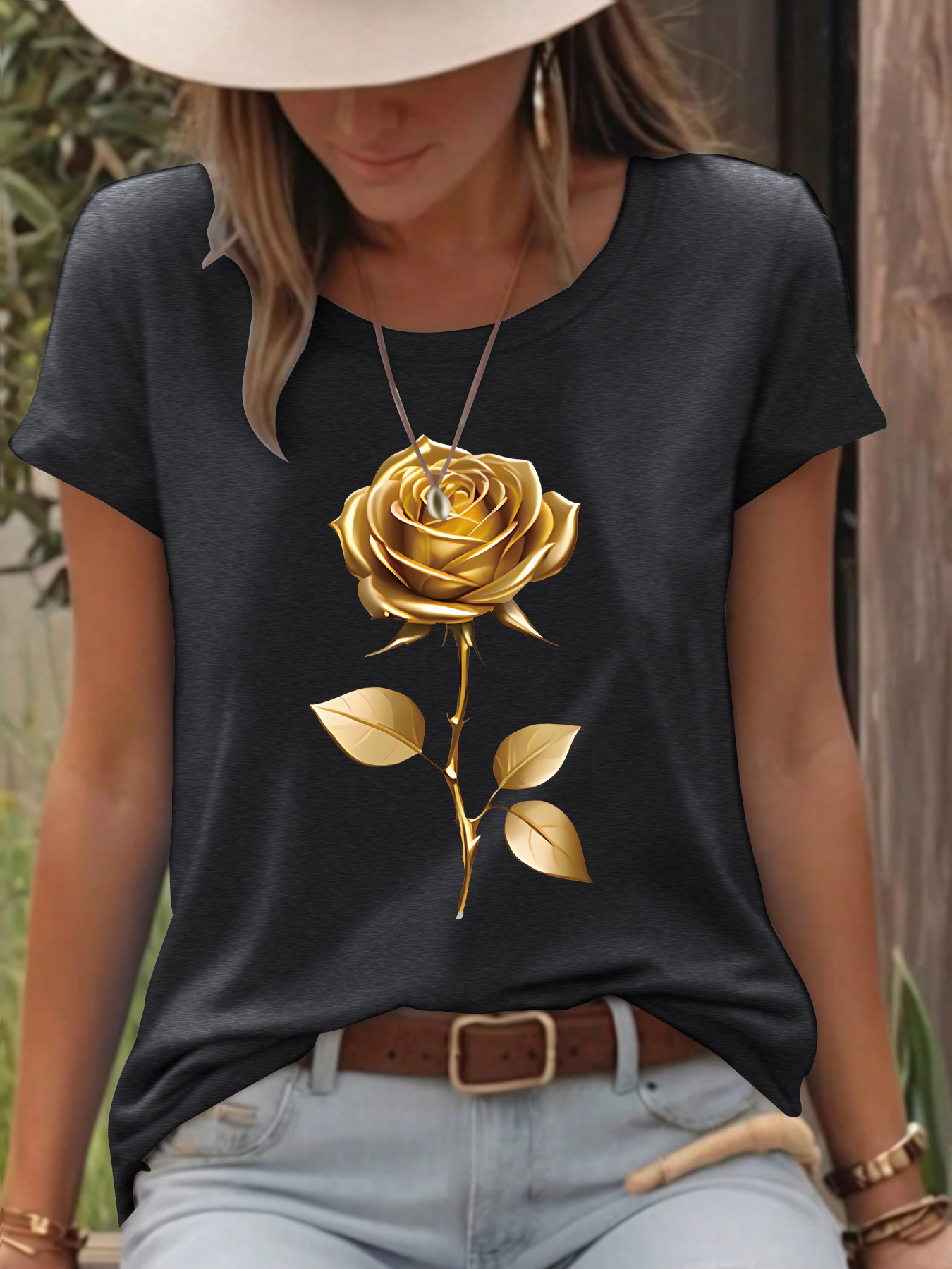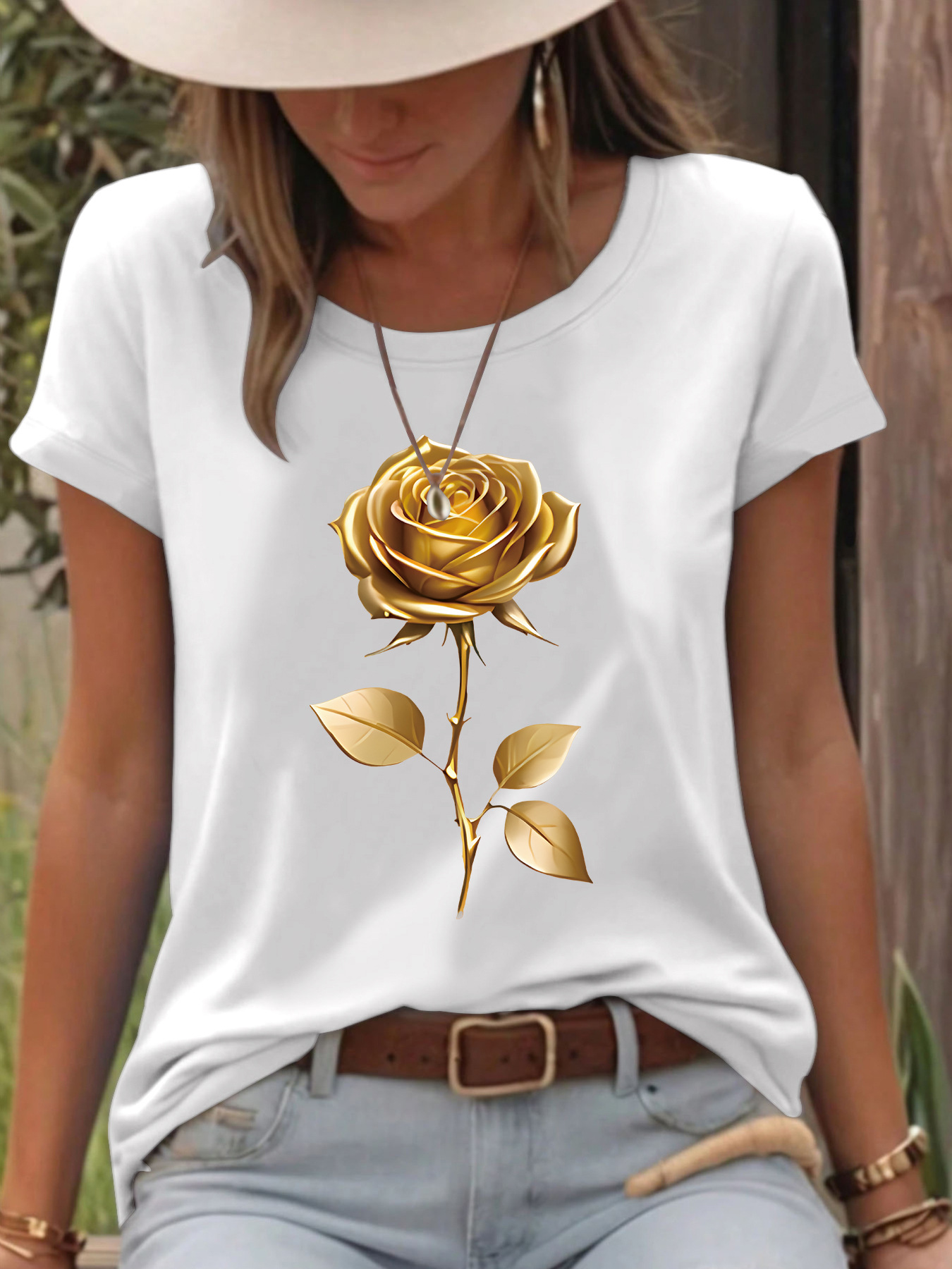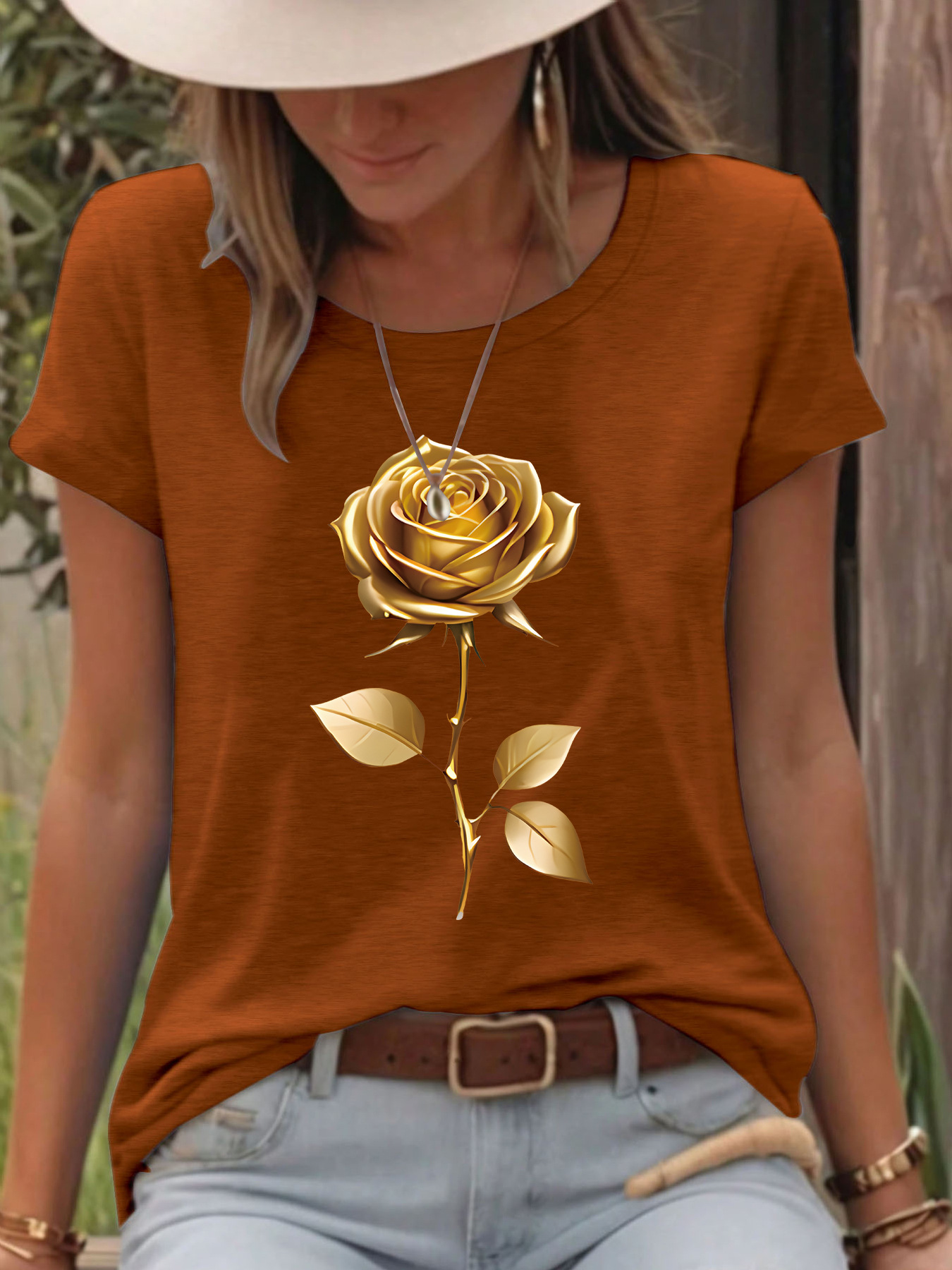 All Products Fashion & Clothing T-Shirts T-shirt gold rose round neck pullover short sleeved shirt