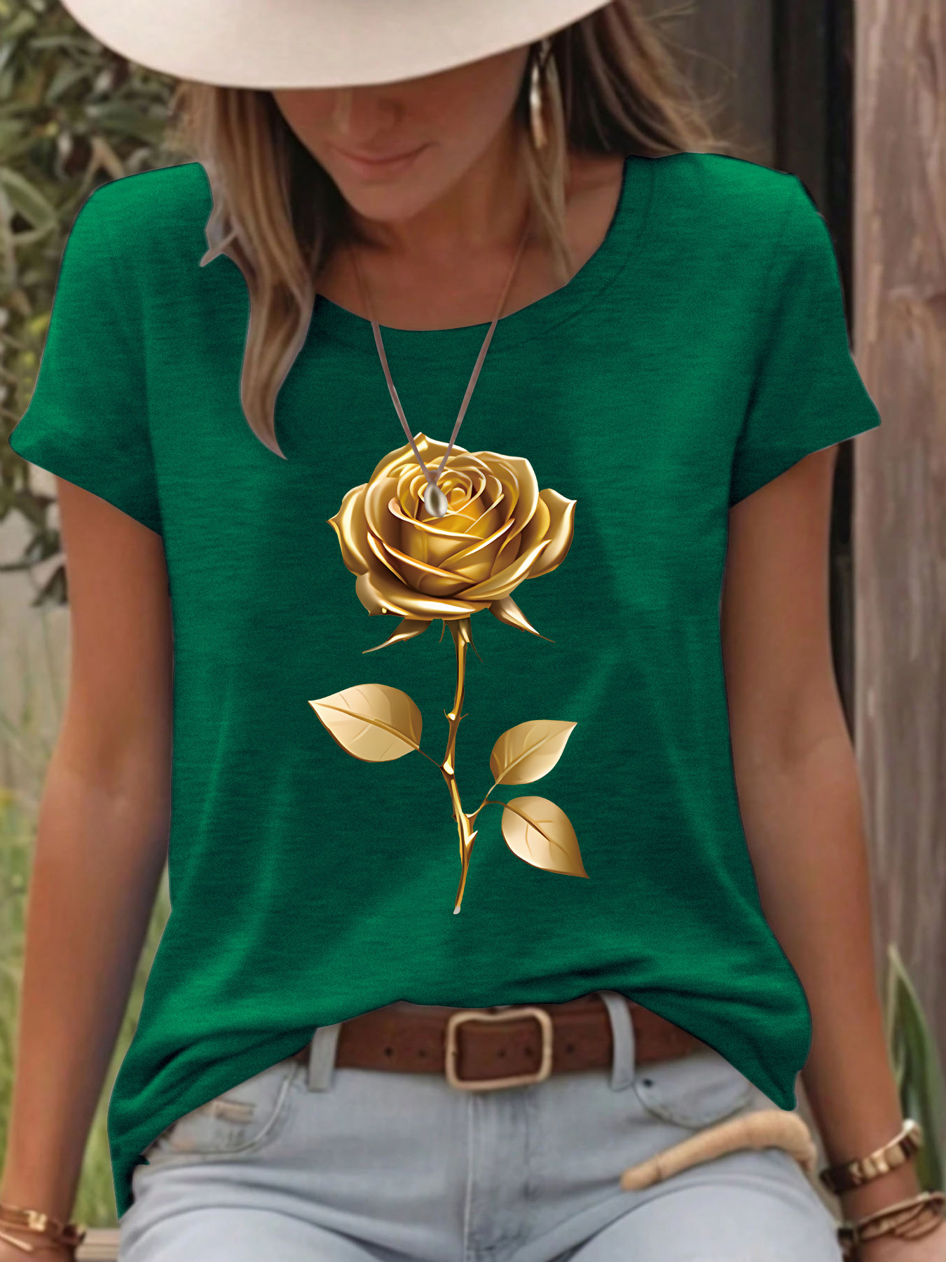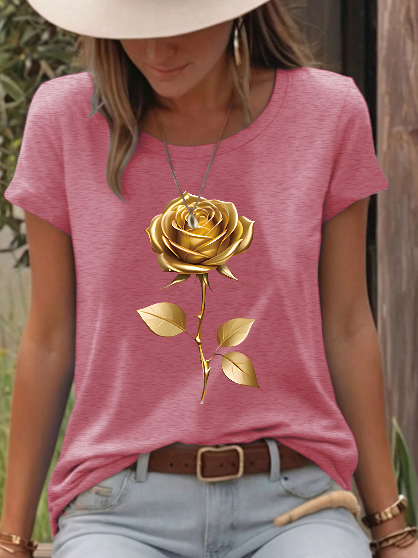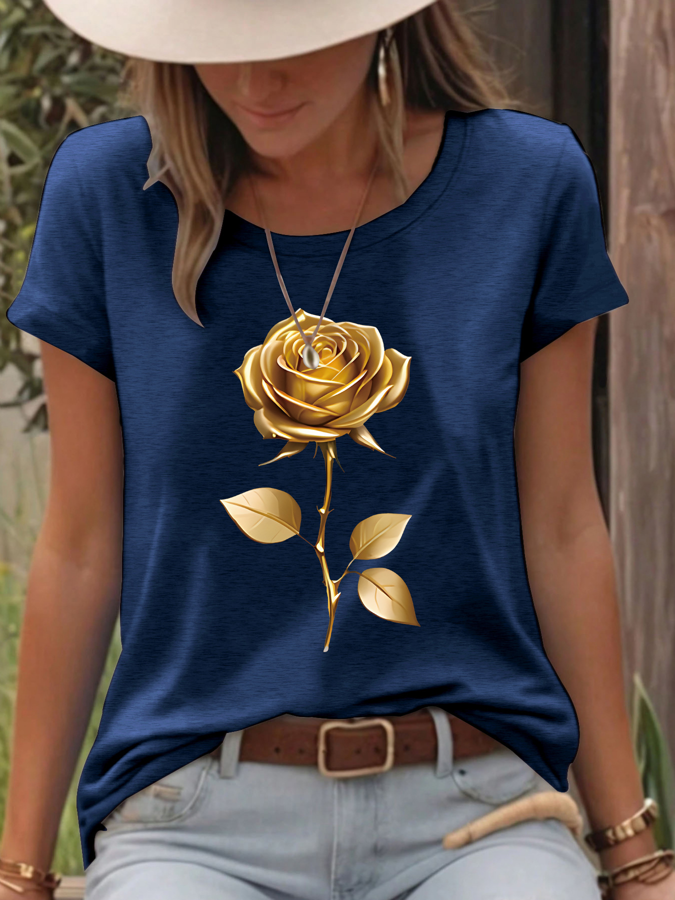 T-shirt gold rose round neck pullover short sleeved shirt