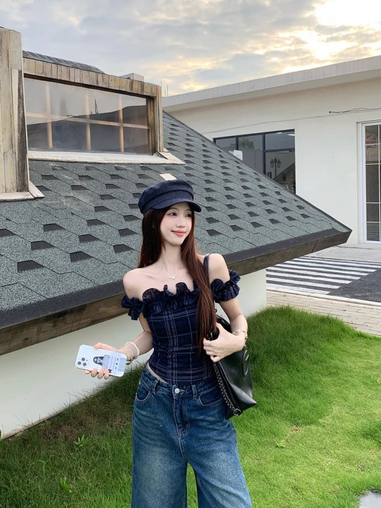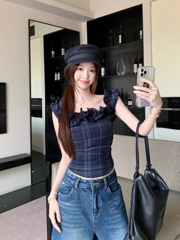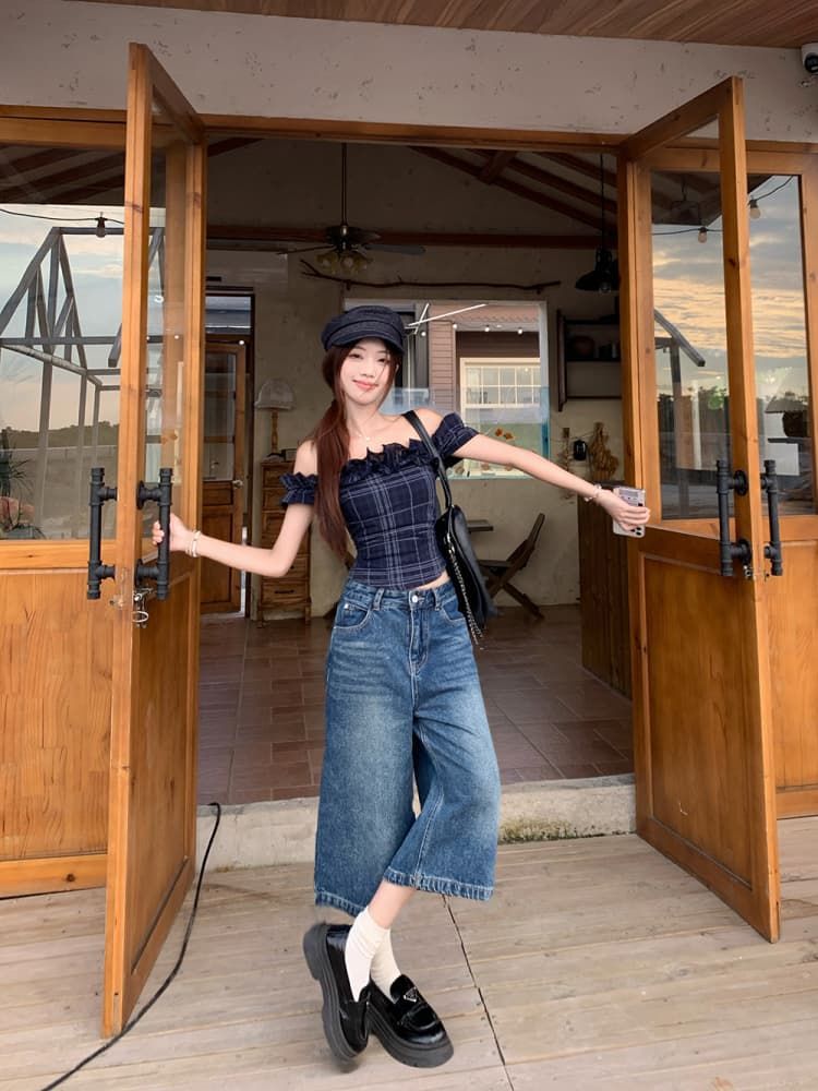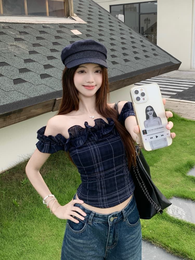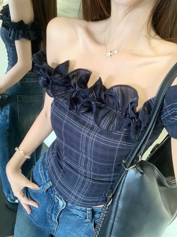 Color: Dark Blue Plaid Top, White Embroidered Top