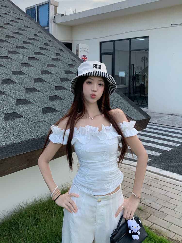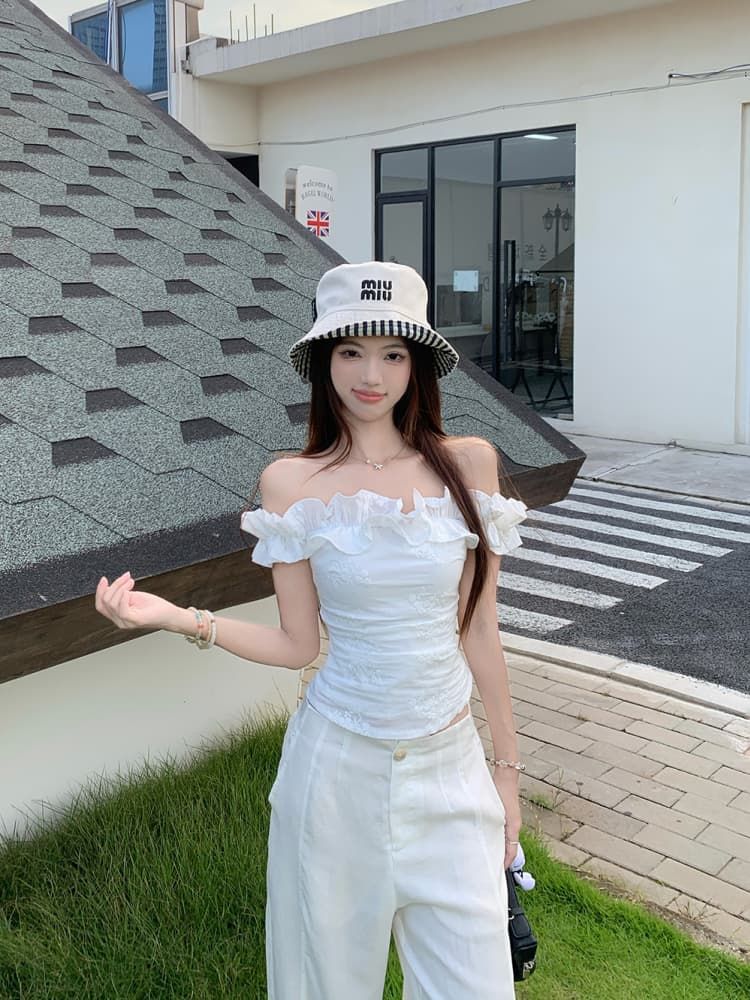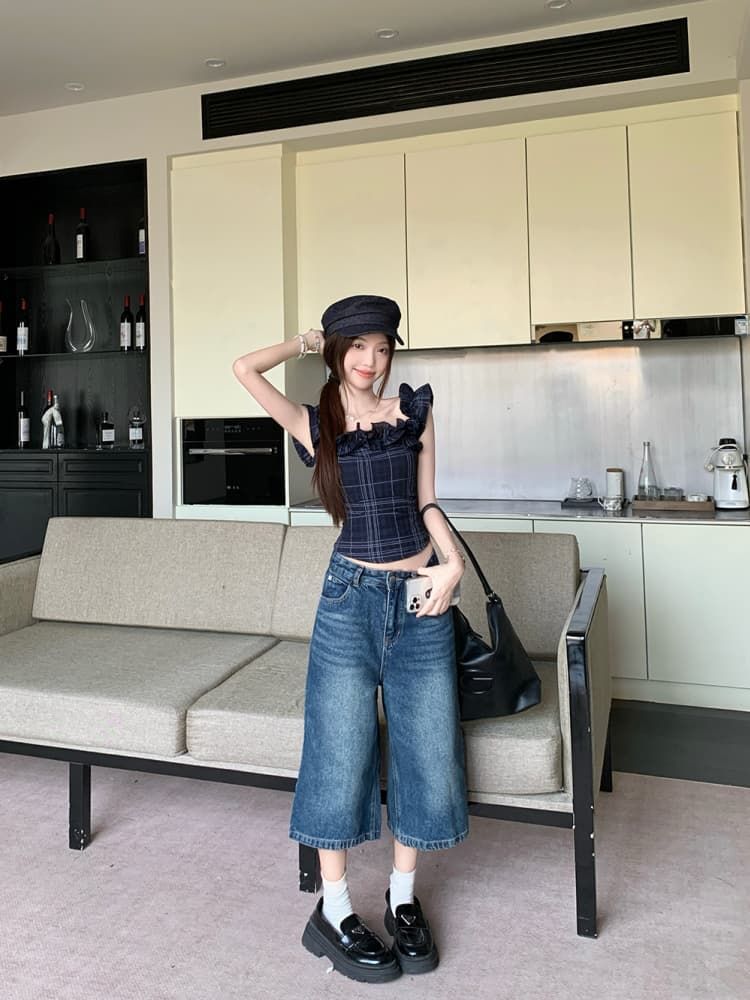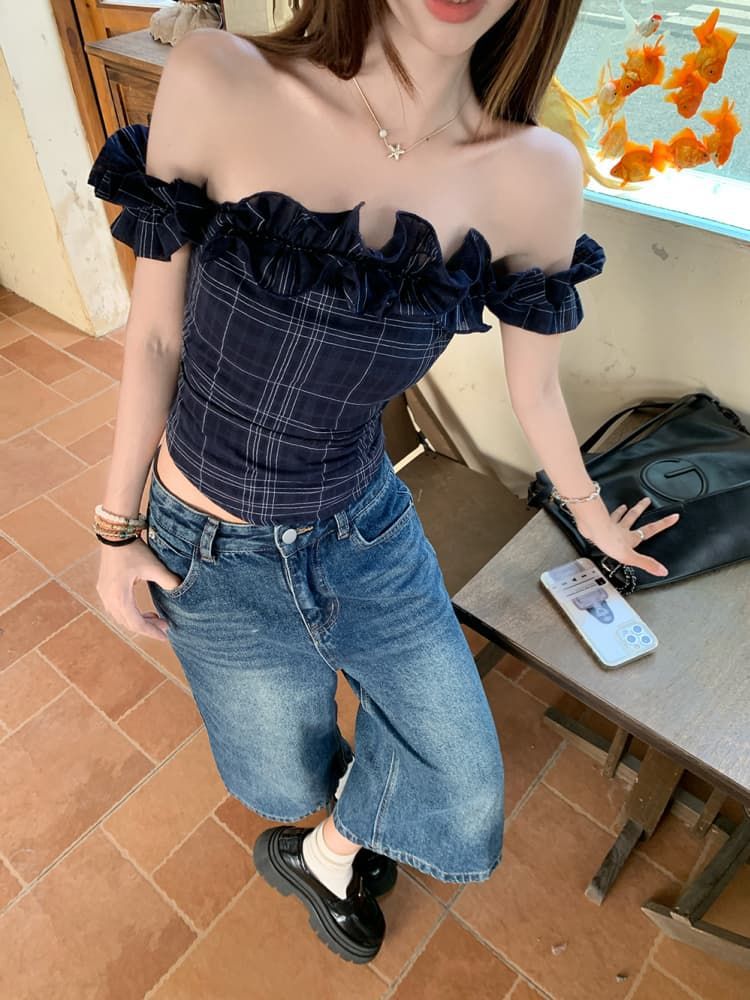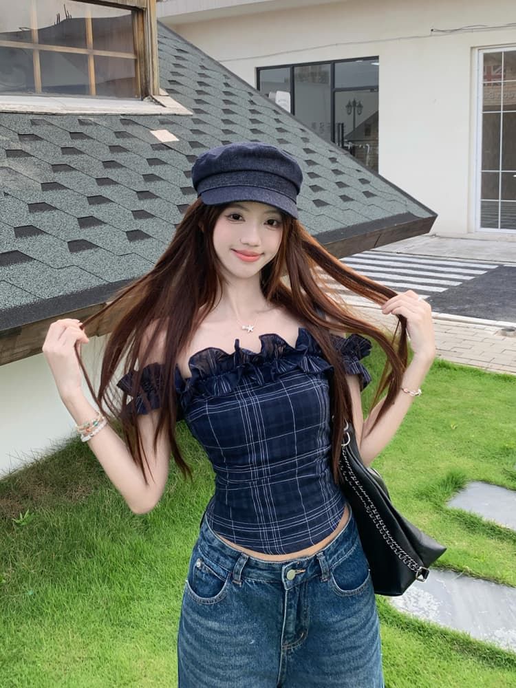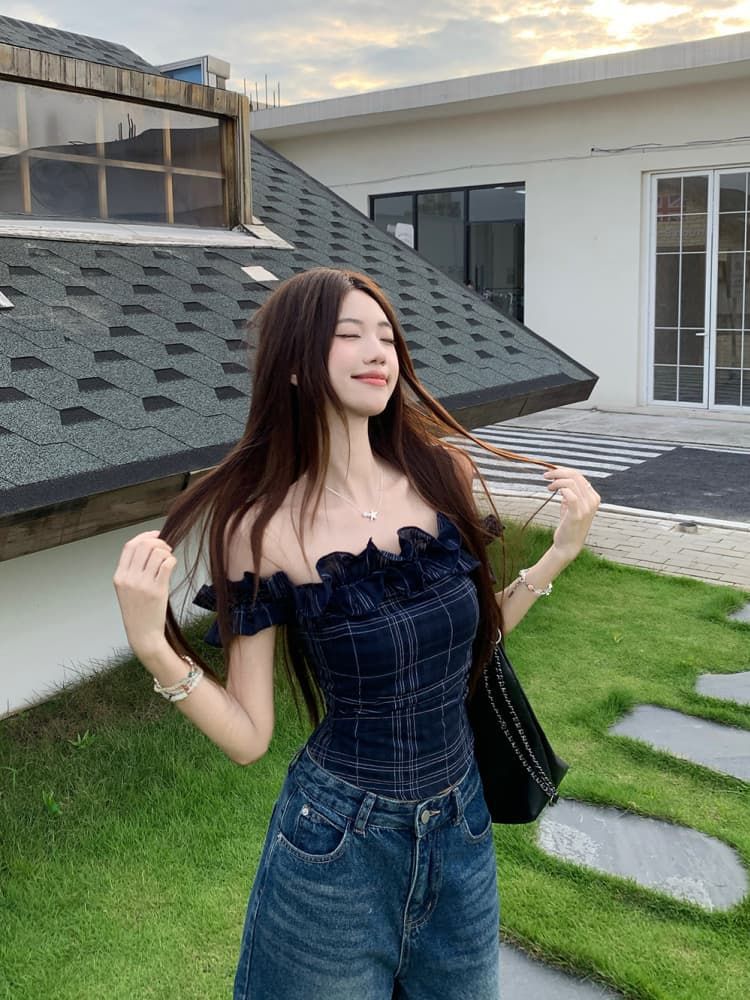Color: Dark Blue Plaid Top, White Embroidered Top