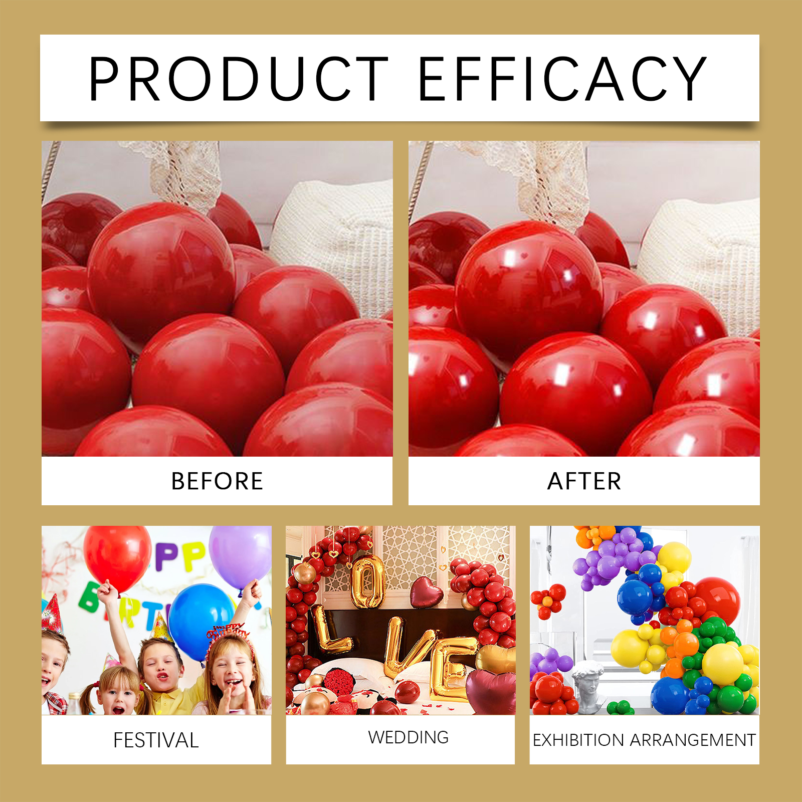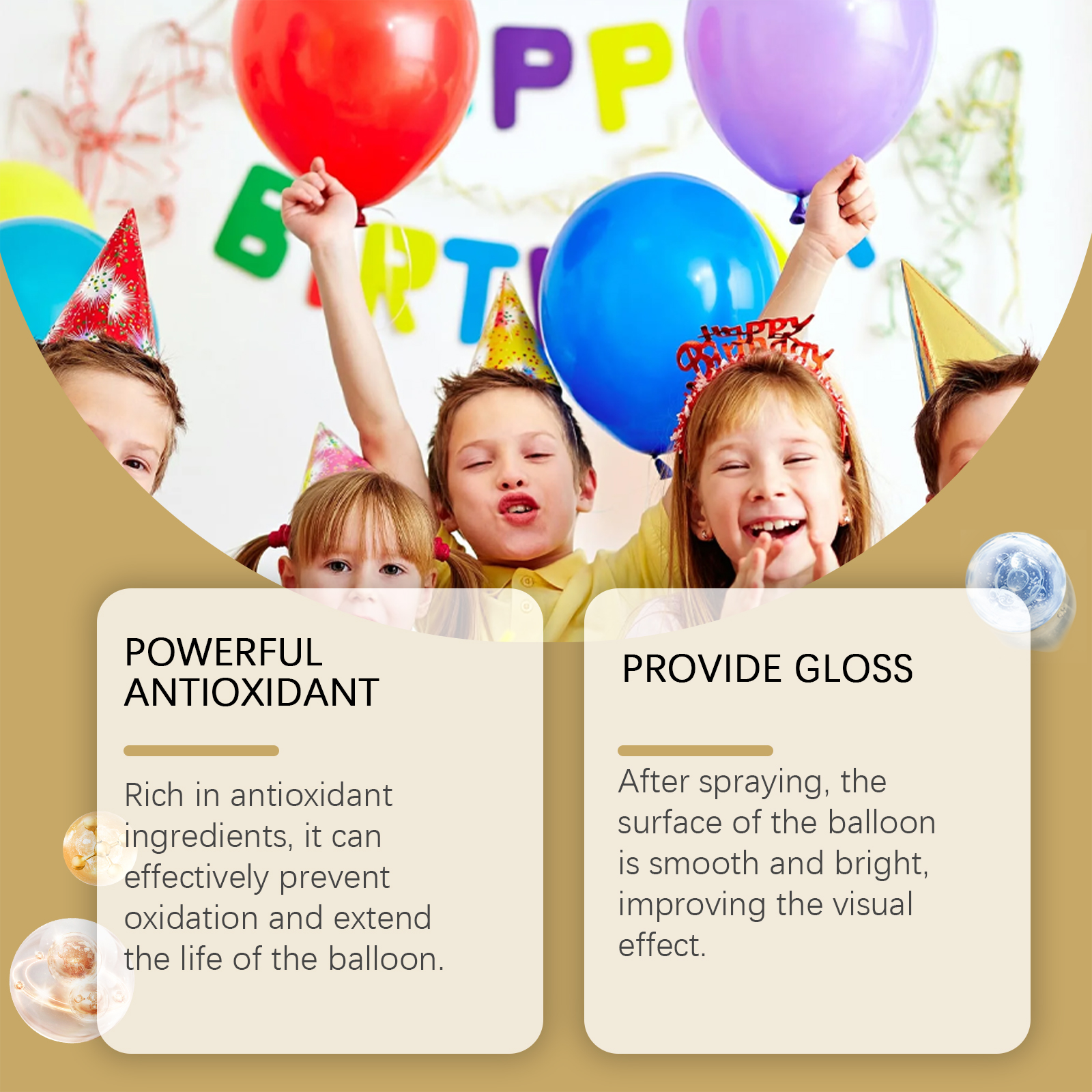 Our balloon gloss spray contains isopropyl alcohol, polyvinyl alcohol. It can be deep cleaning, quickly remove stubborn stains on the surface of the tile. Its use is very simple: just spray the product evenly on the surface of the balloon without wiping, and the balloon will shine immediately. And it can increase the surface gloss, make the surface of the balloon more smooth and delicate, improve the overall texture of the balloon, and increase its ornamental value.、