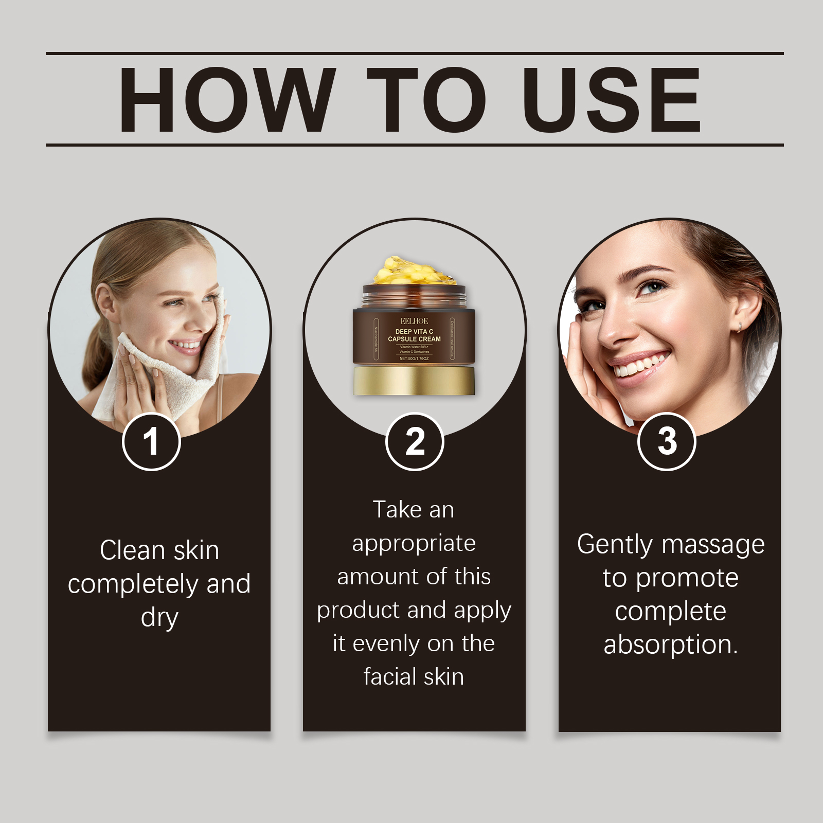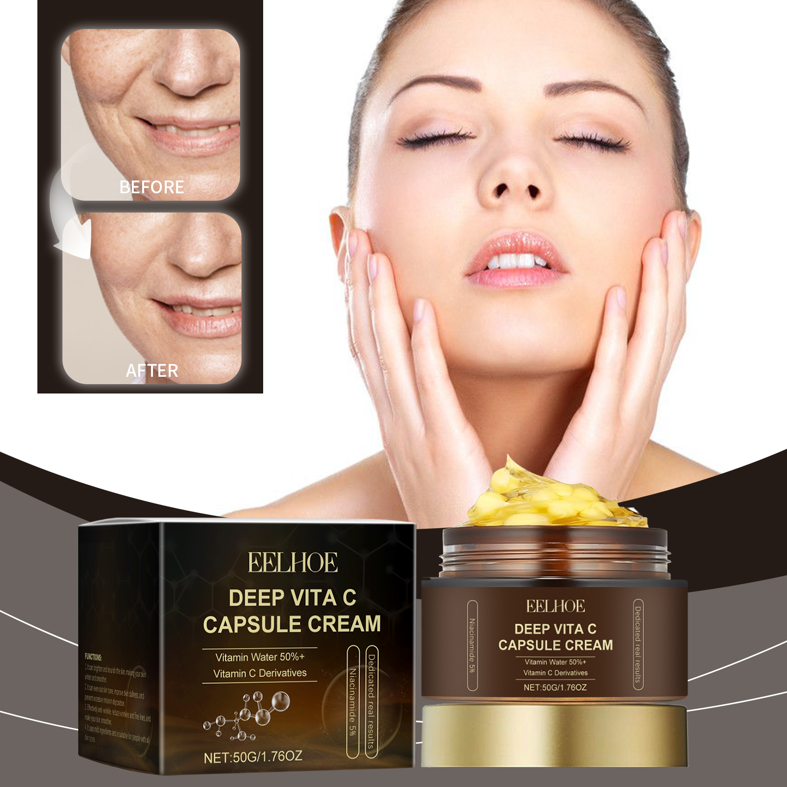 Our Vitamin C capsule moisturizing cream contains niacinamide, tocopherol (vitamin E). It can reduce dark spots and pigmentation to even out skin tone and improve uneven skin tone. Its application method is very simple: thoroughly clean and dry the skin, apply appropriate amount of this product evenly on the face skin, gently massage to promote complete absorption. And it can effectively lighten the skin and make the skin glow.