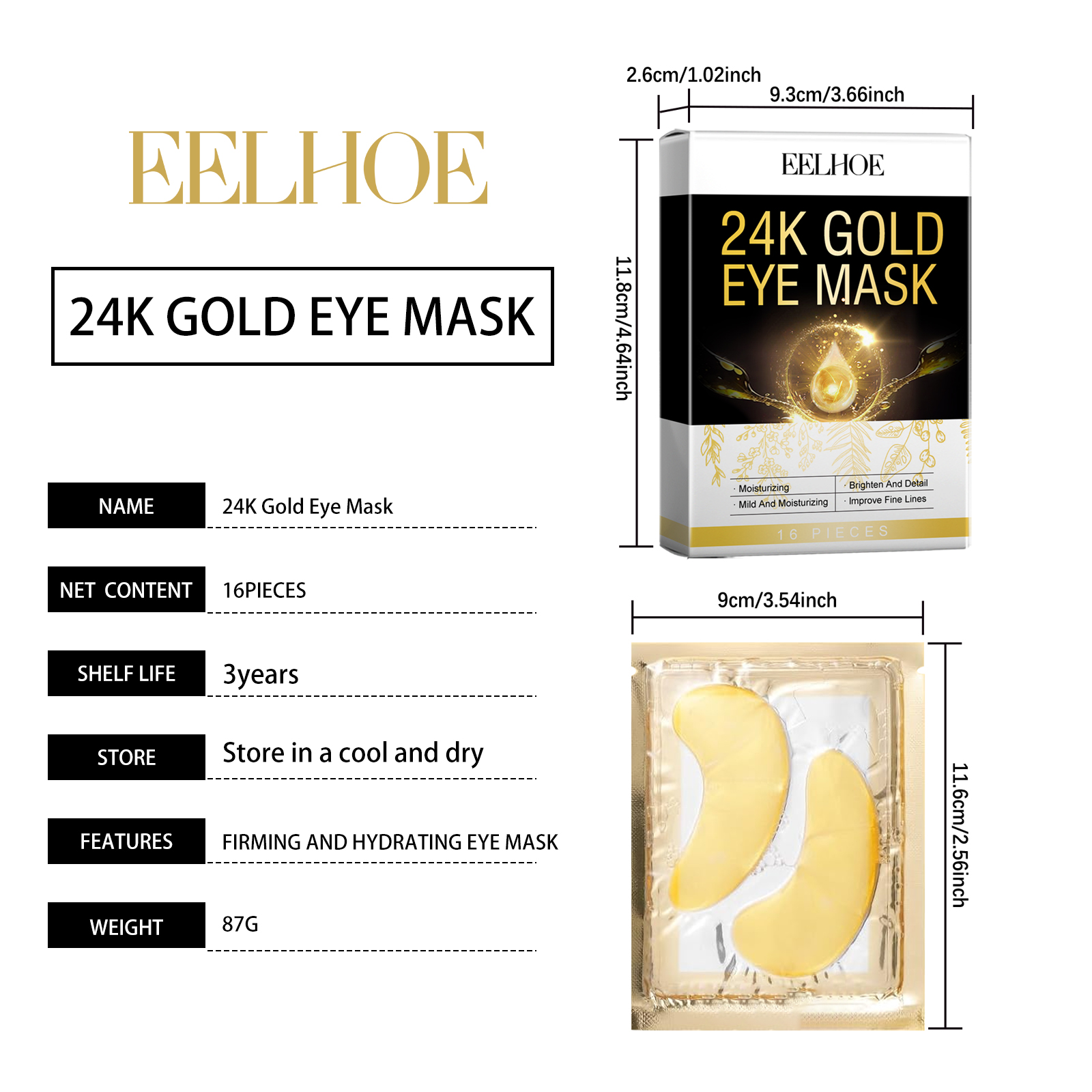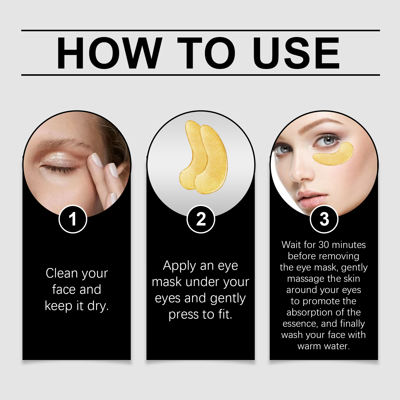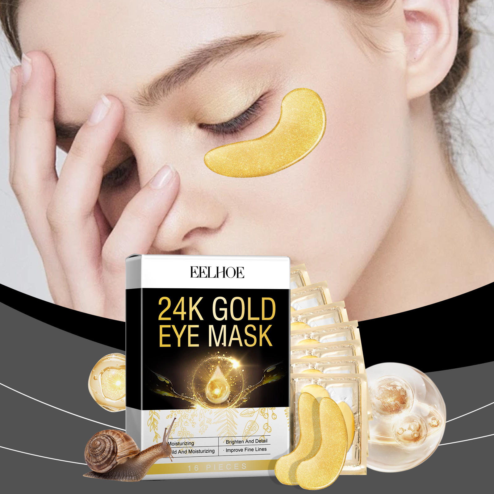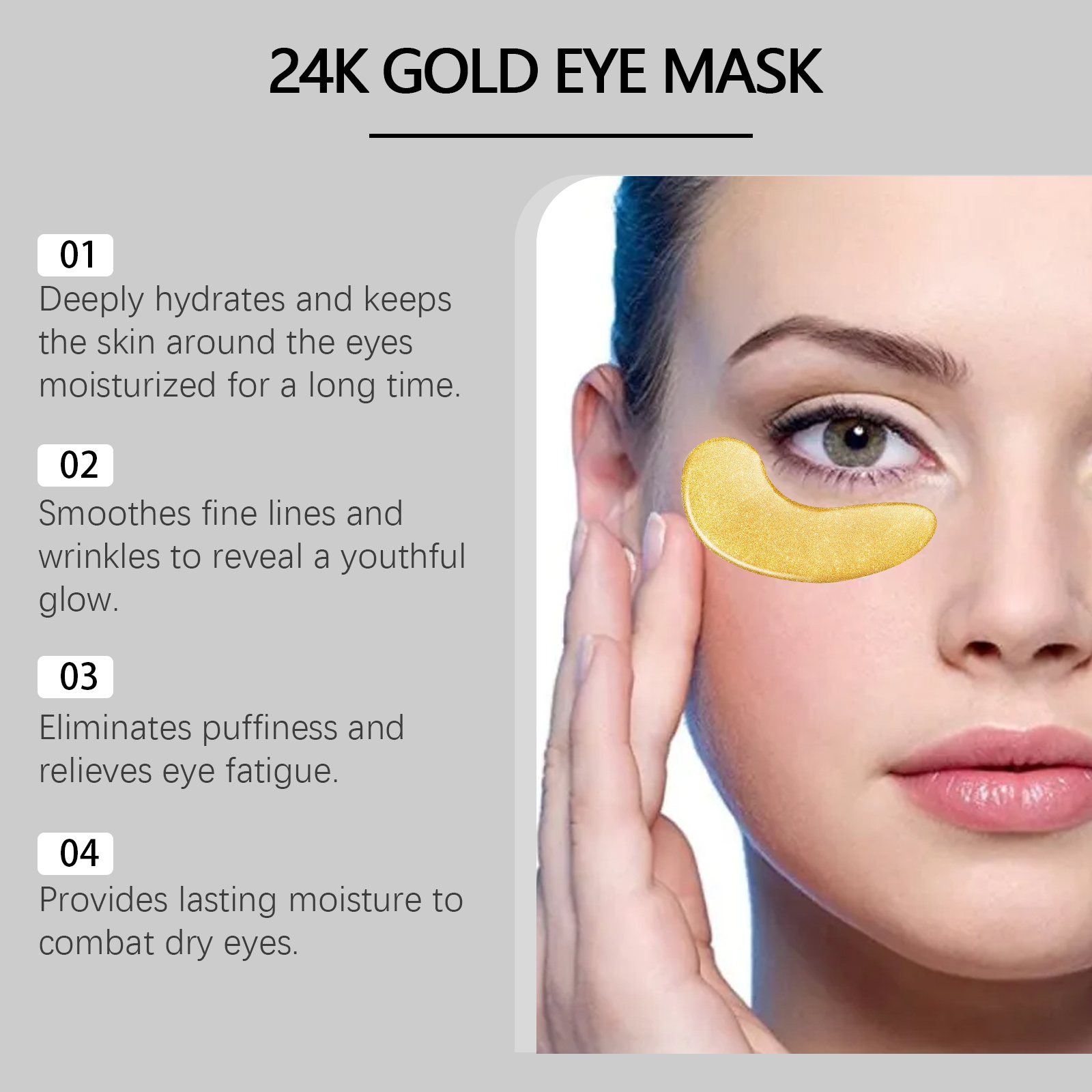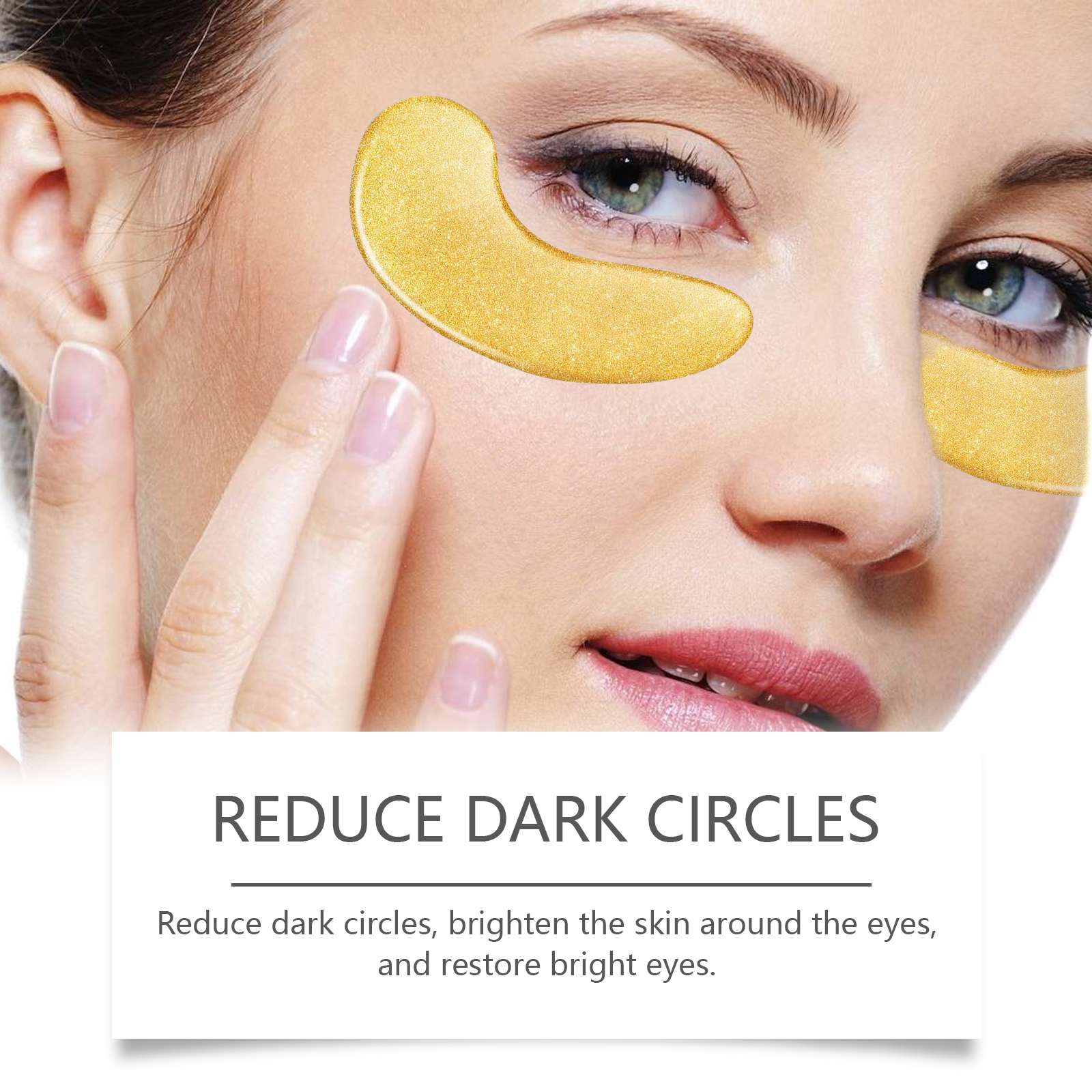 Our 24K gold eye mask contains collagen, hyaluronic acid and chamomile extract. It deeply moisturizes and quickly penetrates the skin, keeping the skin around the eyes hydrated and smooth. The way to use it is simple: 1. Clean your face and keep it dry. 2. Apply an eye mask under your eye and gently press it into place. 3. Wait for 30 minutes to remove the eye mask, gently massage the skin around the eye to promote the absorption of the serum, and finally wash your face with warm water. Tighten loose skin, enhance elasticity around the eyes, and make the eye contour clearer.