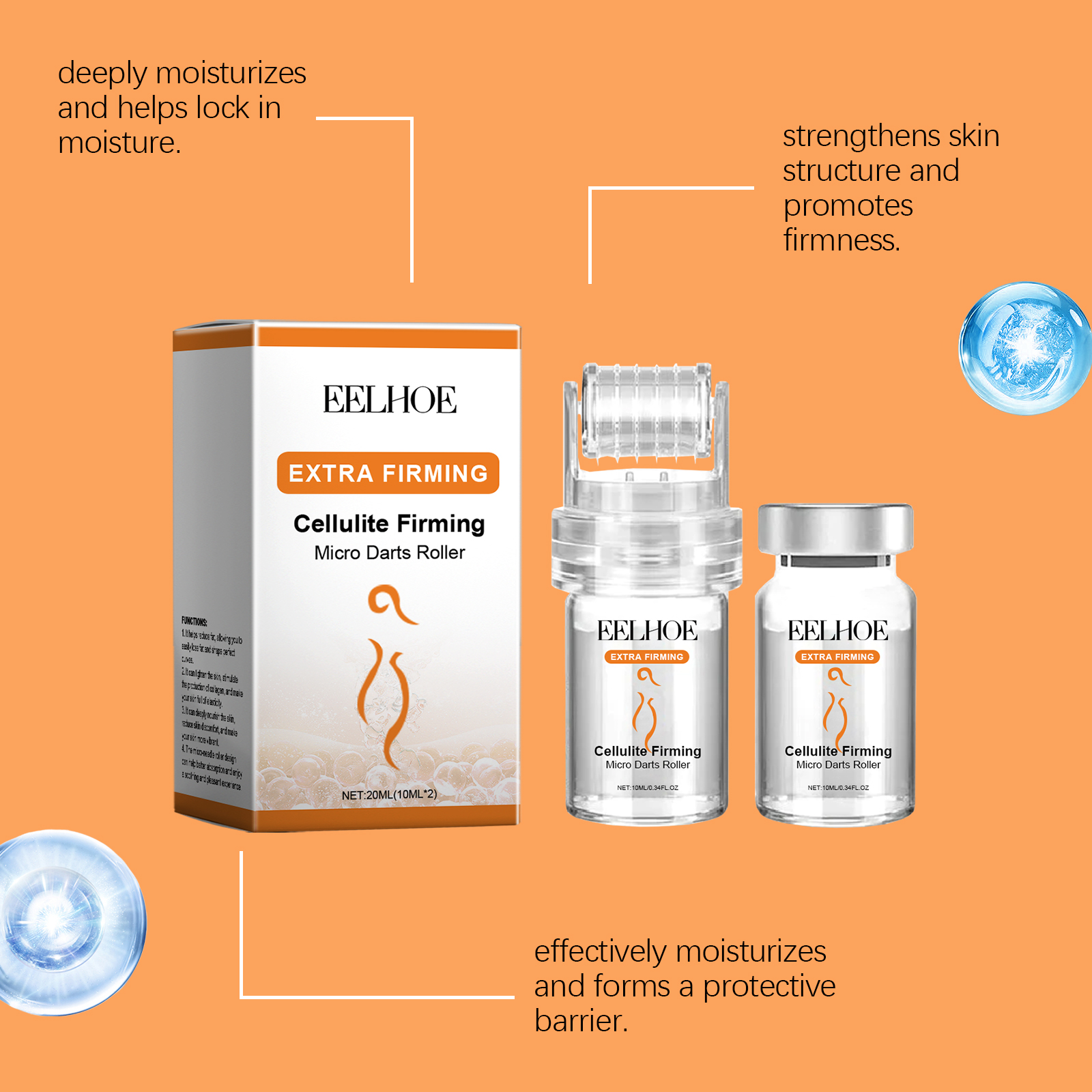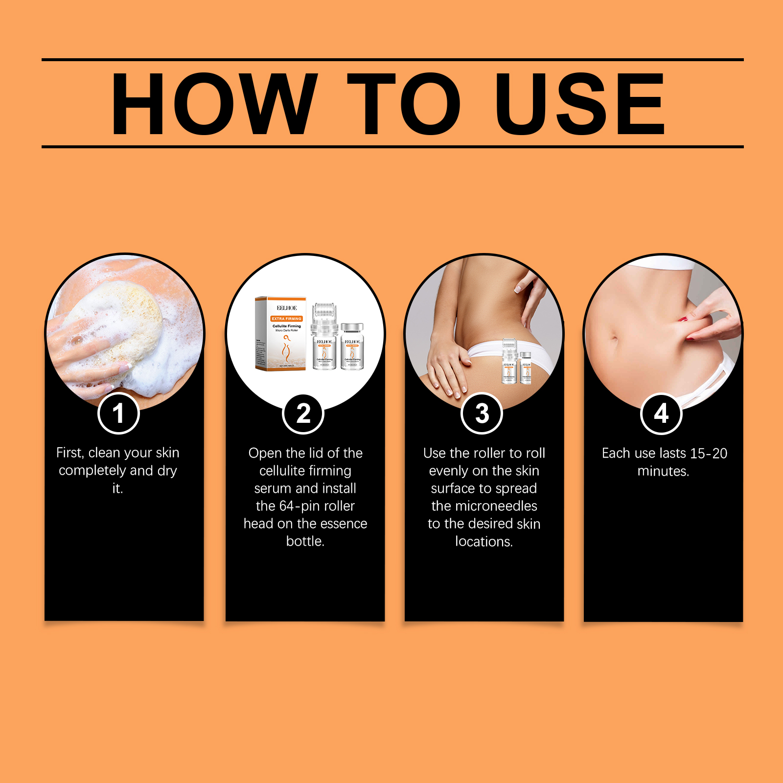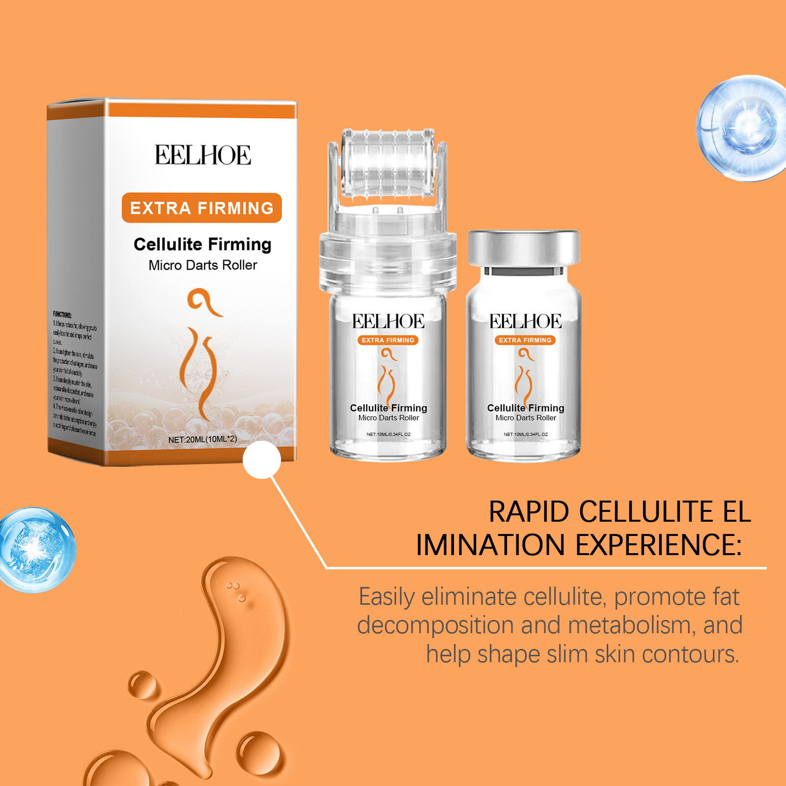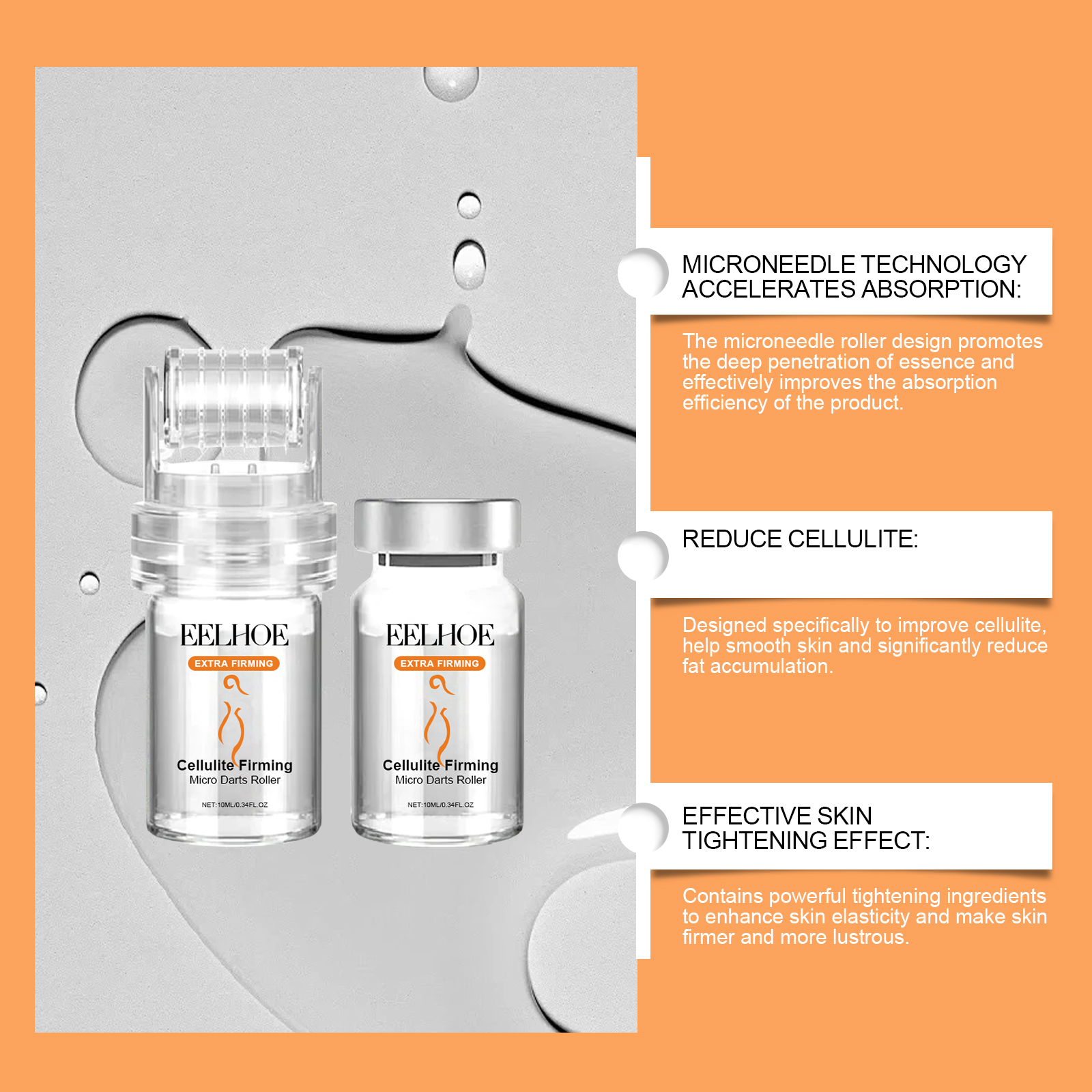 Our Roller Essence contains hyaluronic acid, hydrolyzed collagen and glycerin. It can significantly improve skin firmness in a short time. Effective care of stubborn fat areas, make the skin contour clearer. Its application method is very simple: 1. First, thoroughly clean and dry the skin; 2. Open the lid of the fat firming Serum and install the 64-needle roller tip on the serum bottle. 3. Roll the roller evenly over the skin surface to spread the microneedles to the desired skin location. 4. Use for 15-20 minutes at a time. Designed for daily body care, continuous use will leave your skin smooth and healthy. Contains soothing ingredients to reduce skin discomfort that may occur during use. It is gentle and safe.