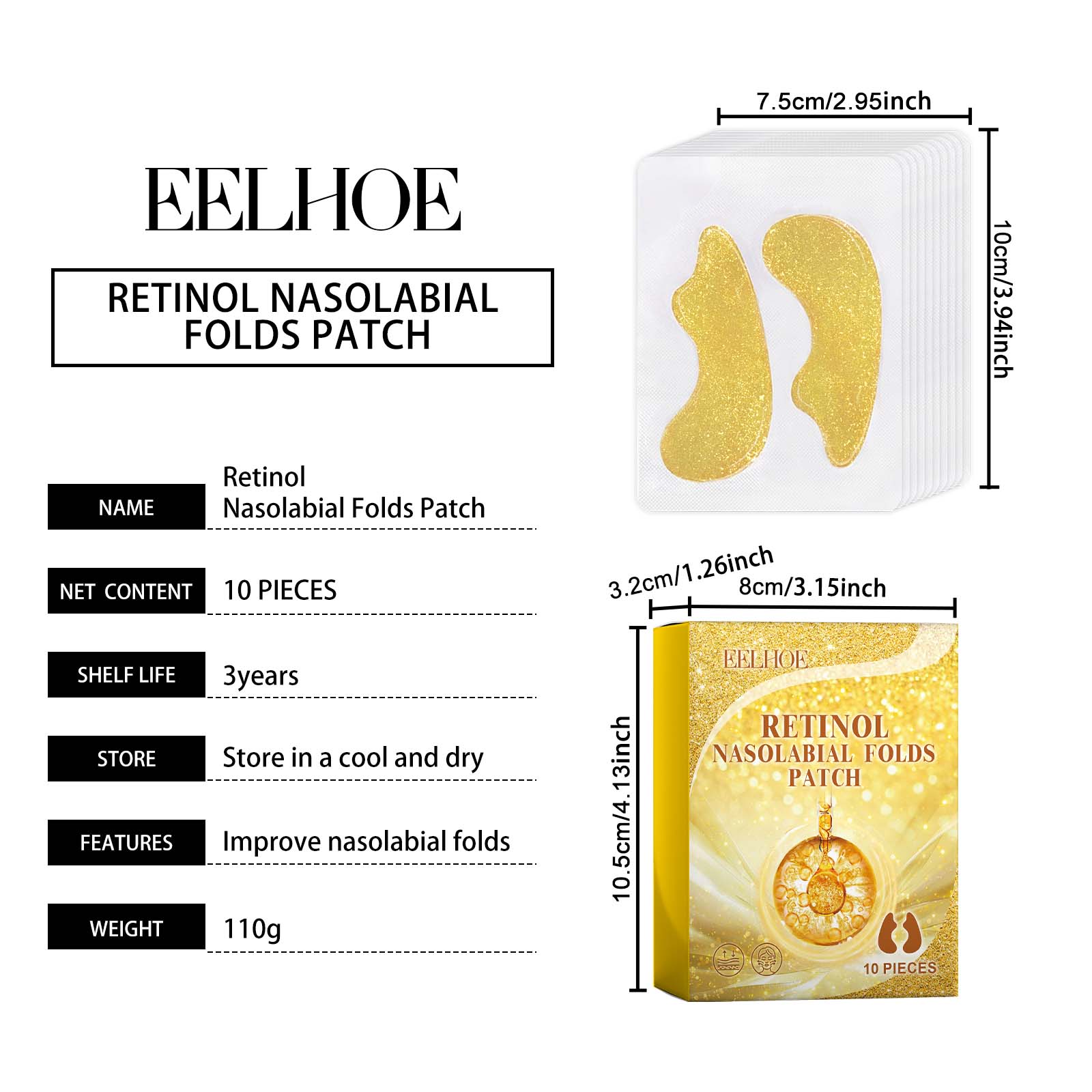 Our Retinol Nasolabial Folds Patch contain Retinol, Chrysanthellum Indicum Extract, Hyaluronic Acid. It can lock the skin moisture, deeply moisturize the skin, make the skin softer and firmer, glow, improve the corners of the mouth and smile lines, make your skin smoother, let you regain a confident smile. Its use method is very simple: clean and dry the face, take a patch, gently stick in the appropriate position of the law, wait for full absorption after the patch can be removed. It can help maintain skin elasticity, keep your skin young and shiny for a long time, and maintain youthful vitality.