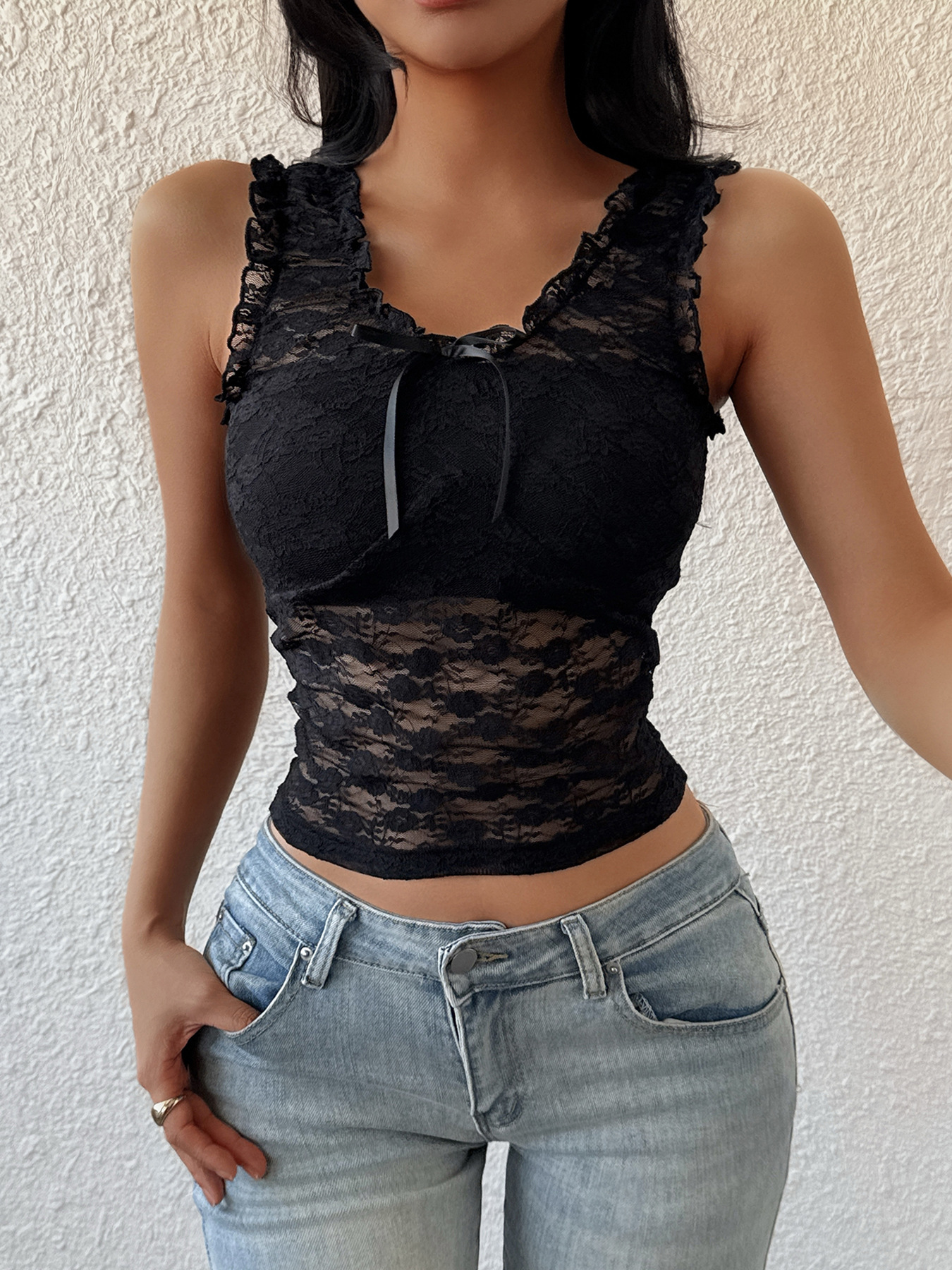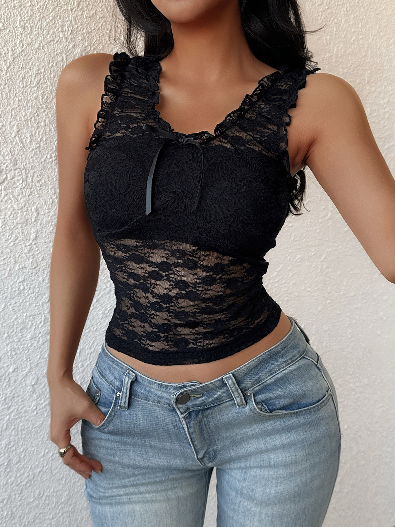 欧美跨境夏季新款外贸性感修身蕾丝小背心辣妹ins风透视蕾丝背心