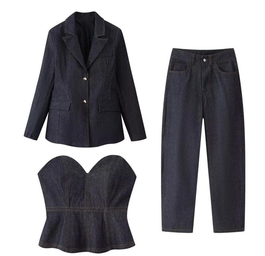 Color: Sea Blue Jacket, Sea Blue Pants, Sea Blue Strapless Top, Three-Piece Set, Suit Two-Piece Set, Strapless Two-Piece Set