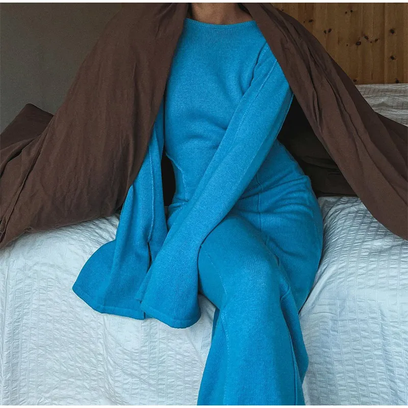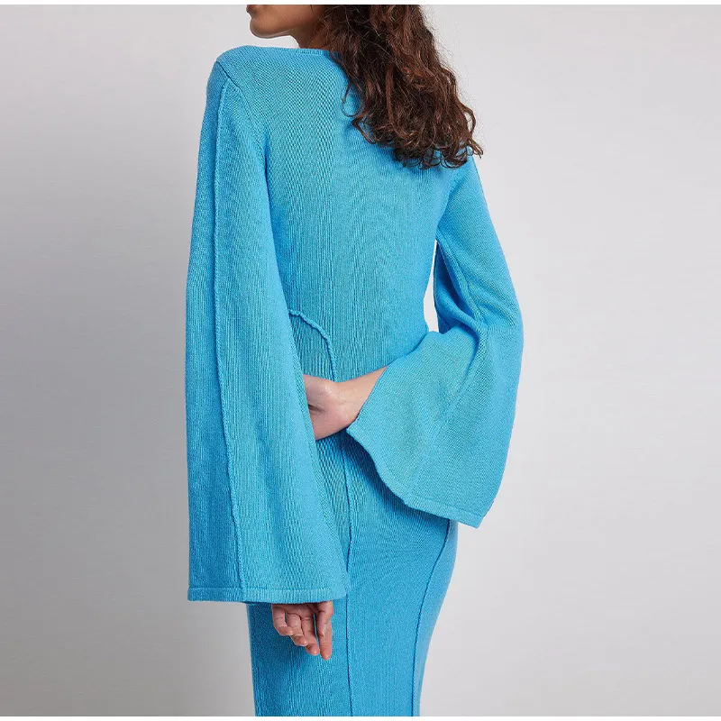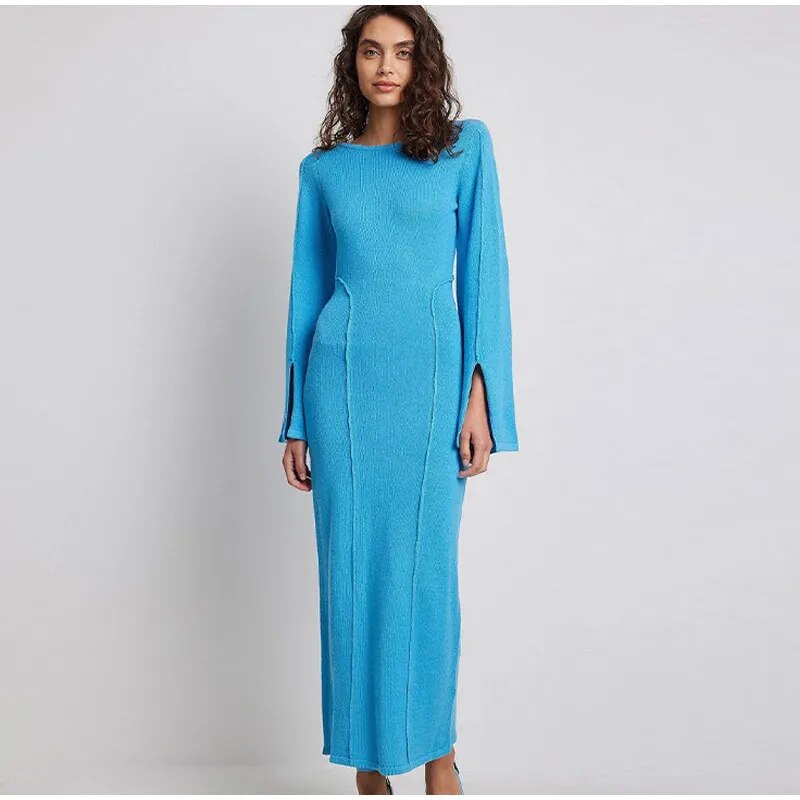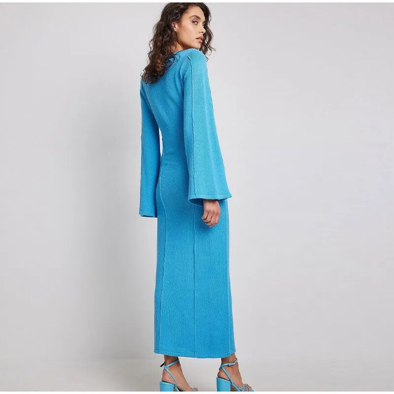 Flared Long Sleeves Split Maxi Dress Women Fashion Blue O-neck Sweater Dresses