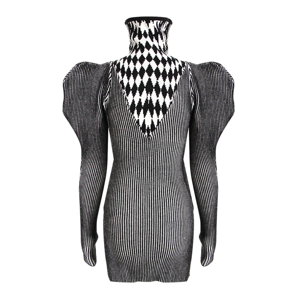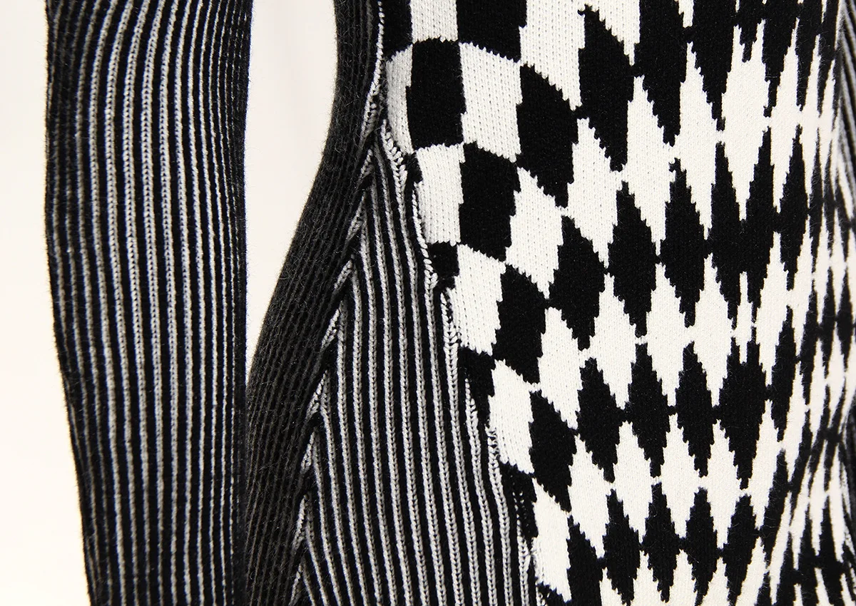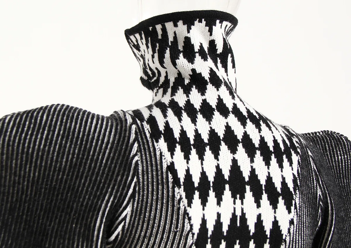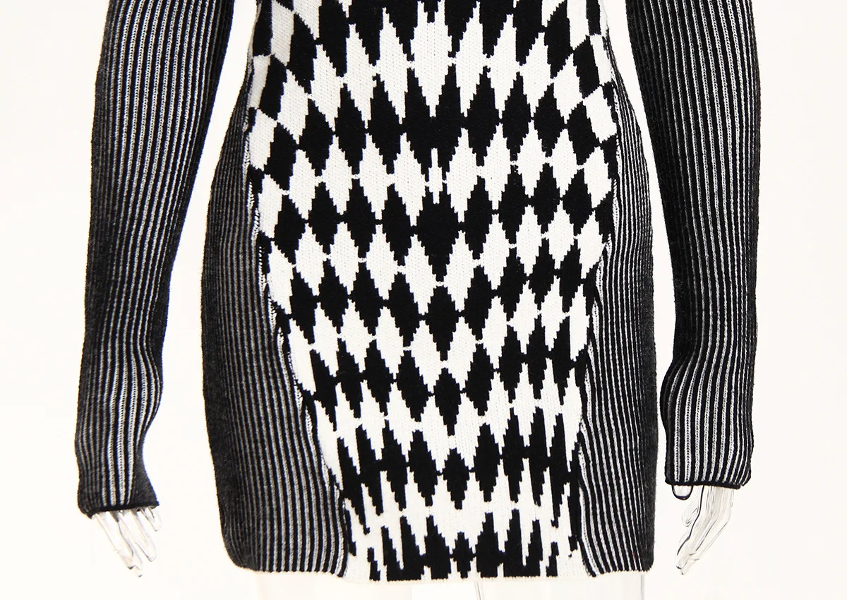 GetSpring Women Dress Autumn Winter Plaid Striped Patchwork Full Sleeve Turtleneck Slim Fit Sweater Short Knitted Dresses
