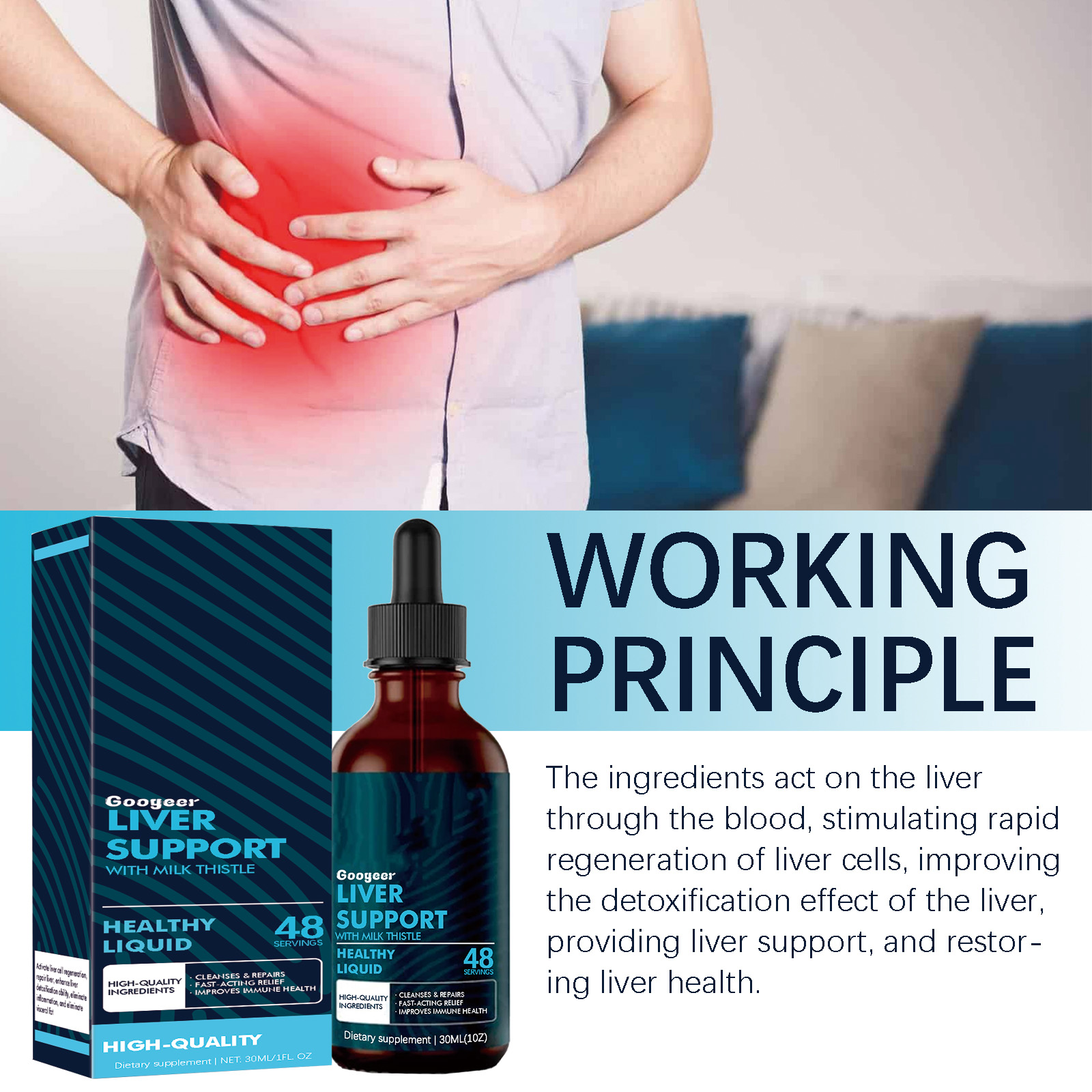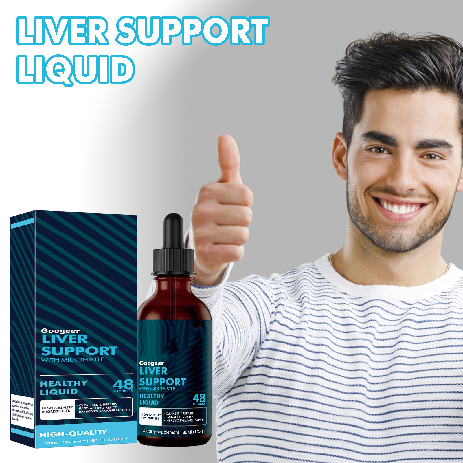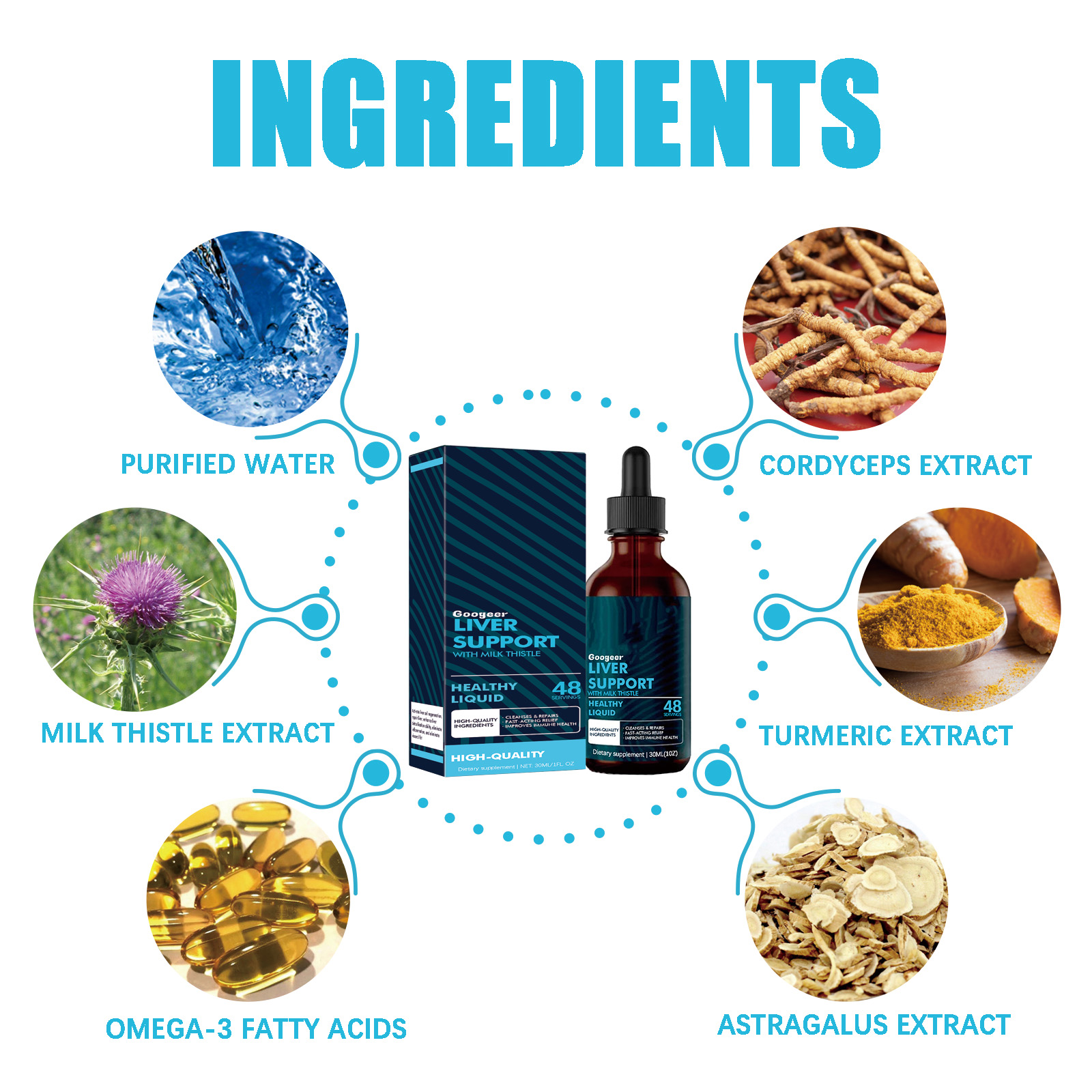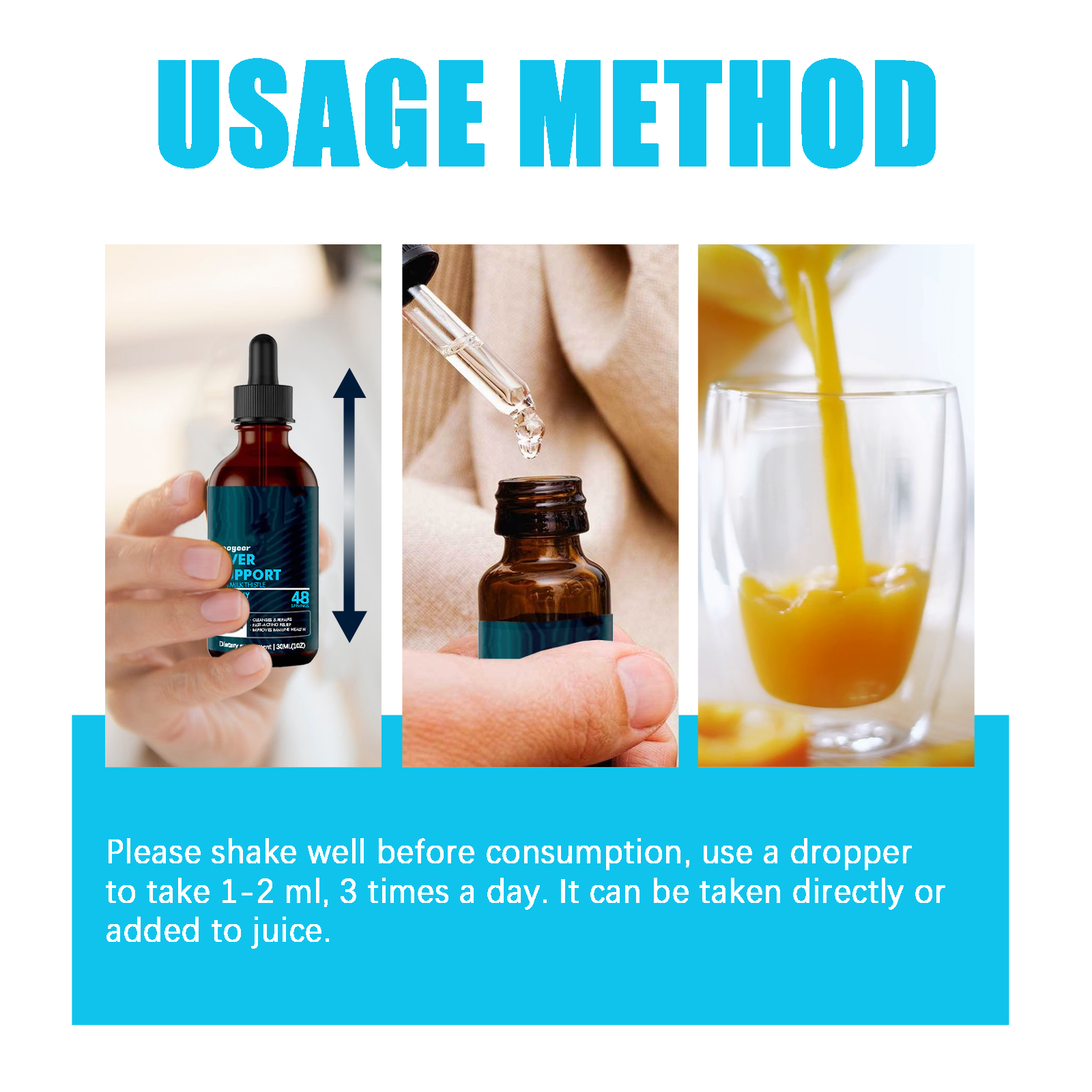 Our body care drops contain milk thistle extract, Omega-3 fatty acids, Cordyceps extract. It can increase overall energy levels and make people more energetic. The way to use it is very simple: shake well before eating, take 1-2 ml with a dropper, 3 times a day. It can be drunk straight or added to fruit juice. It also speeds up the removal of impurities and supports liver health.