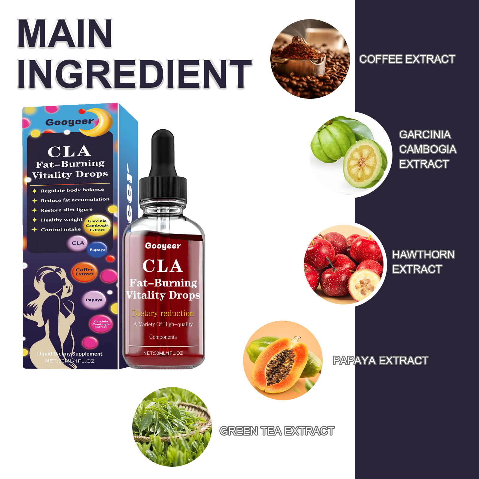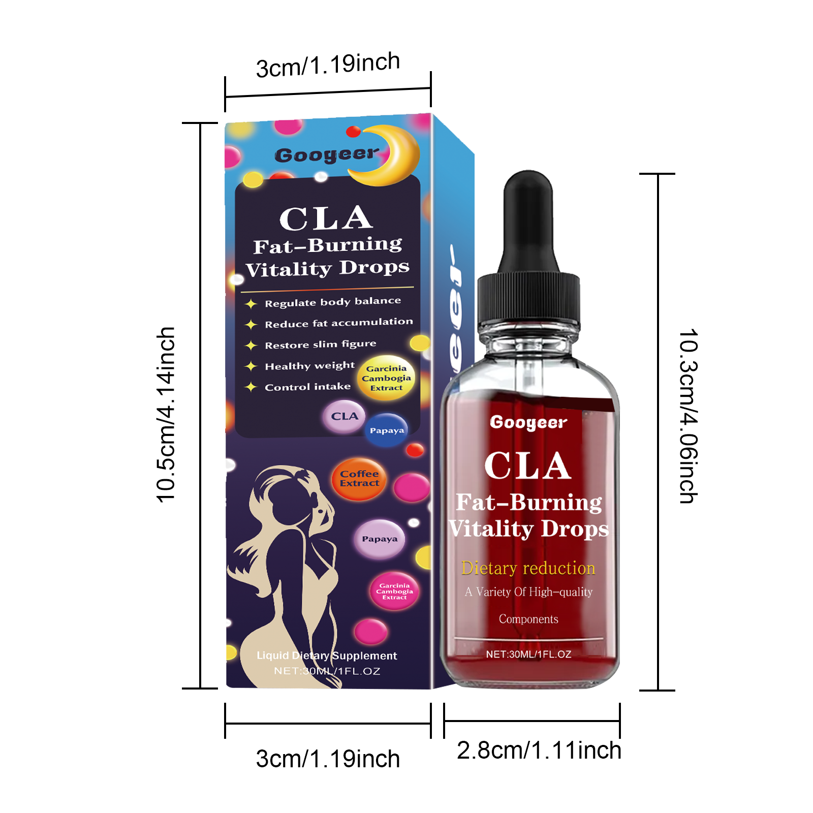 Our shaping drops contain coffee extract, garcinia cambogia extract and hawthorn extract. It can rapidly reduce epidural fat, speed up metabolism, and eliminate aging fat cells. The way to use it is very simple: shake it well before eating, and then use it 1-2 drops at a time. After use, it can promote blood circulation, promote metabolism, improve skin elasticity, and make the body slimmer.