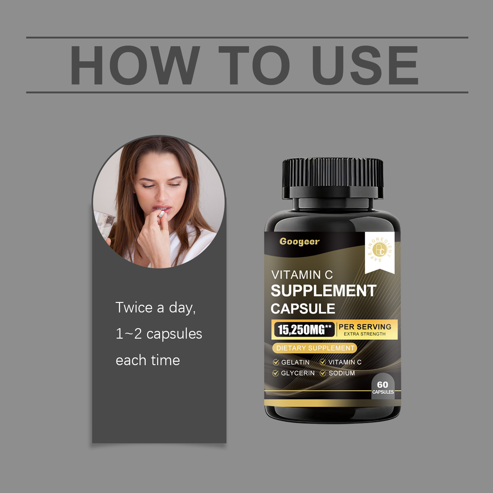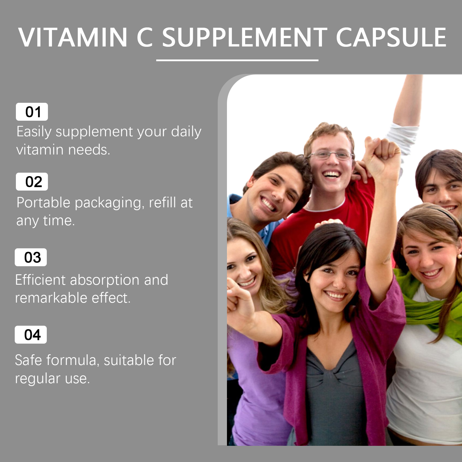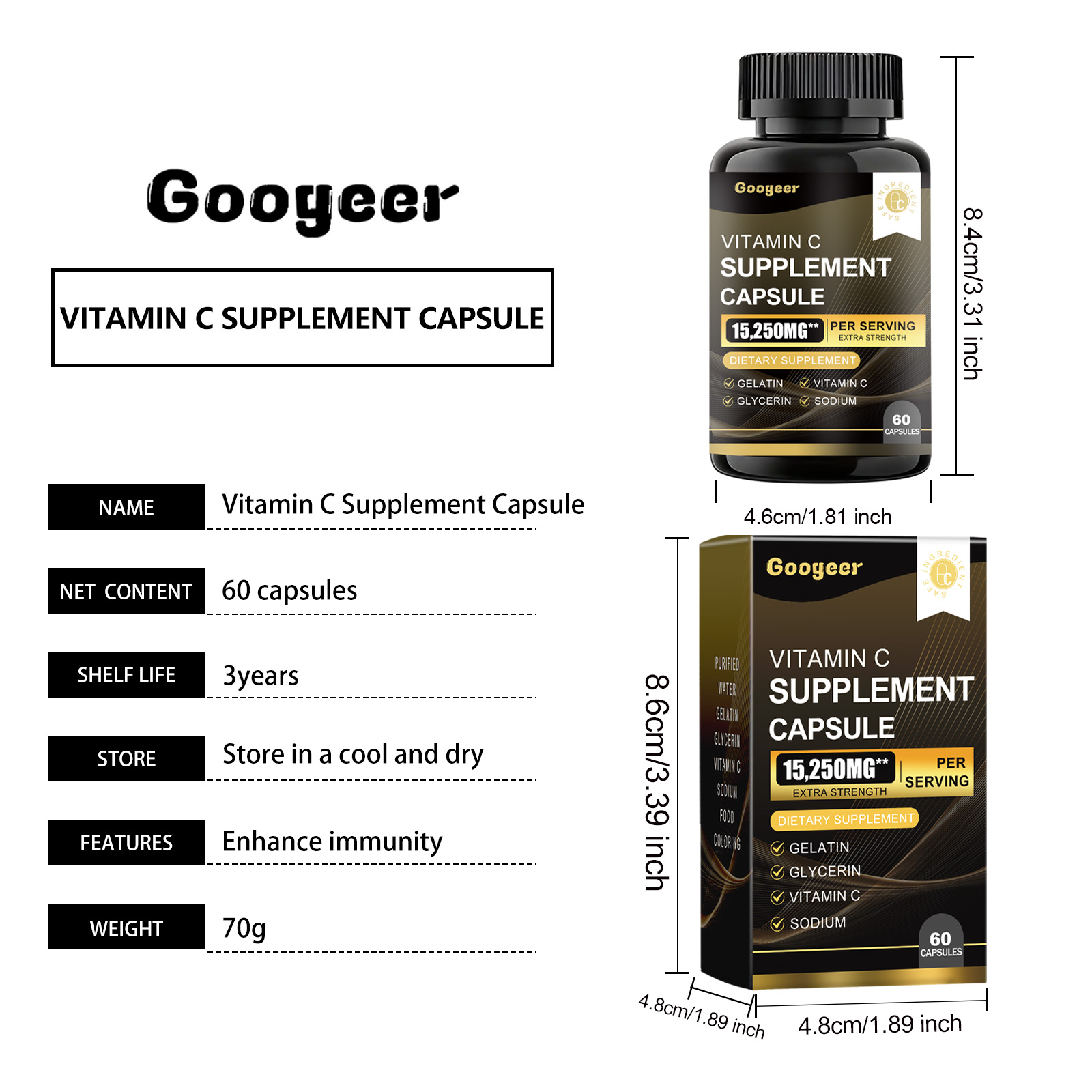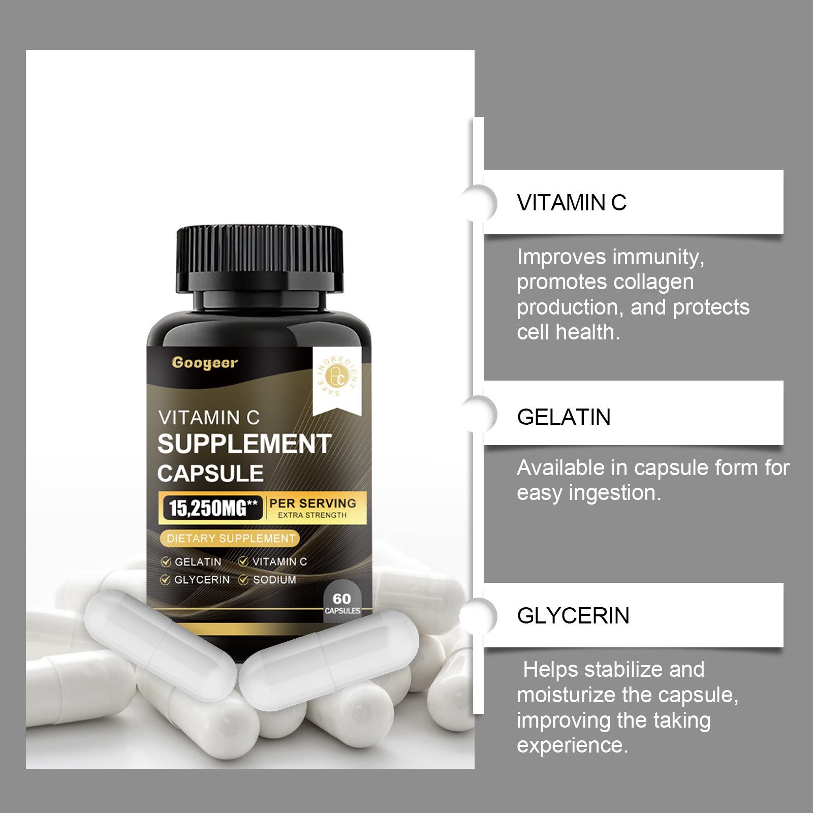 Our Vitamin C Supplement Capsule contain Gelatin, Glycerin, Vitamin C. It can enhance the body"s antioxidant protection, maintain overall health, easily supplement the daily requirement of vitamins, boost immunity, promote collagen production, and protect cell health. The way to use it is simple: take 1-2 capsules twice a day. Each capsule contains a certain amount of vitamin C, which effectively supports body functions.