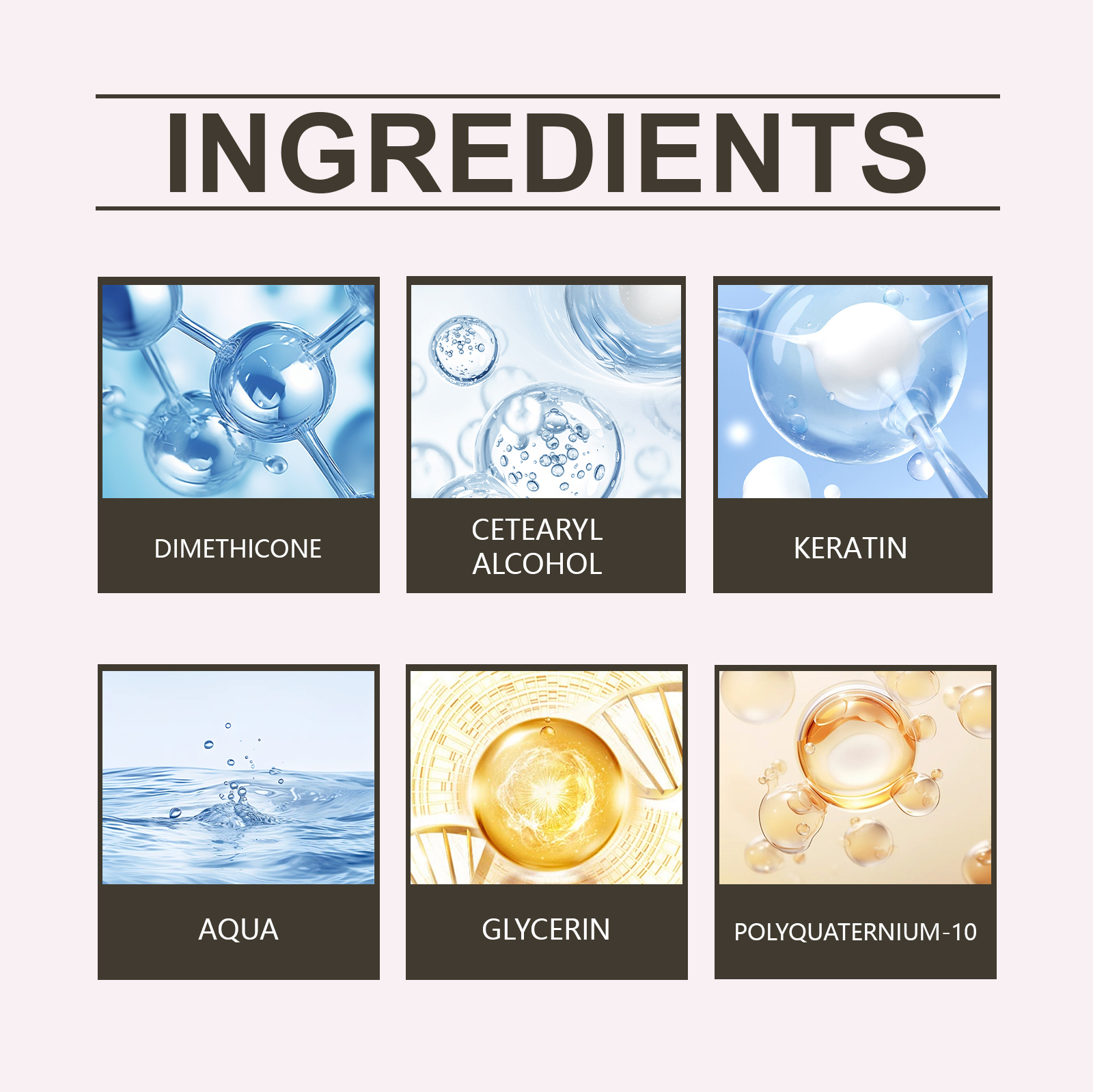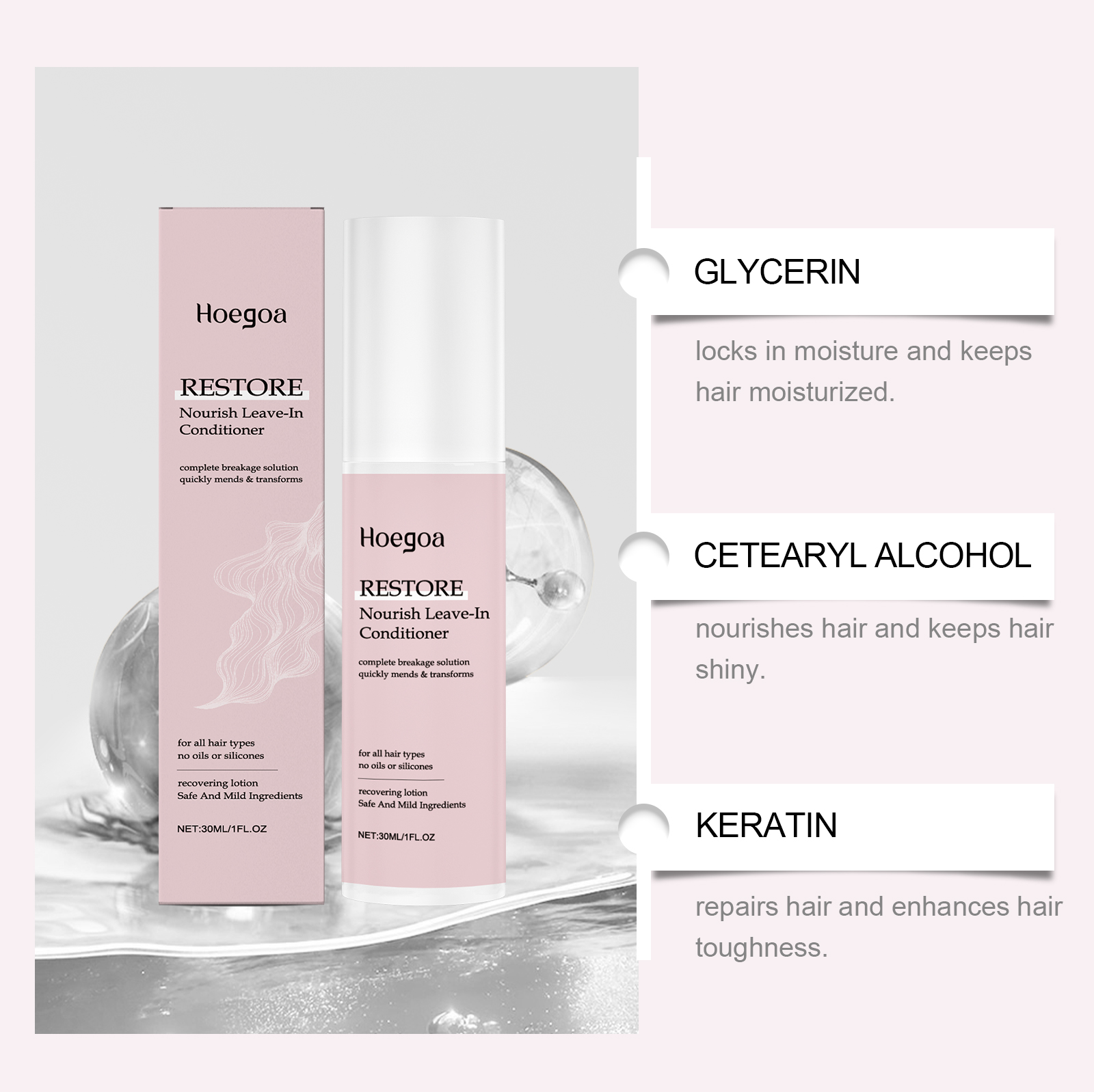 Our nourishing leave-in conditioner contains glycerin, polydimethylsiloxane. It makes hair softer and smoother and easier to brush. Its use is simple: clean your hair and keep it dry. Apply appropriate amount of this product to hair evenly and wait for absorption. And it nourishes each strand of hair and makes it glow.