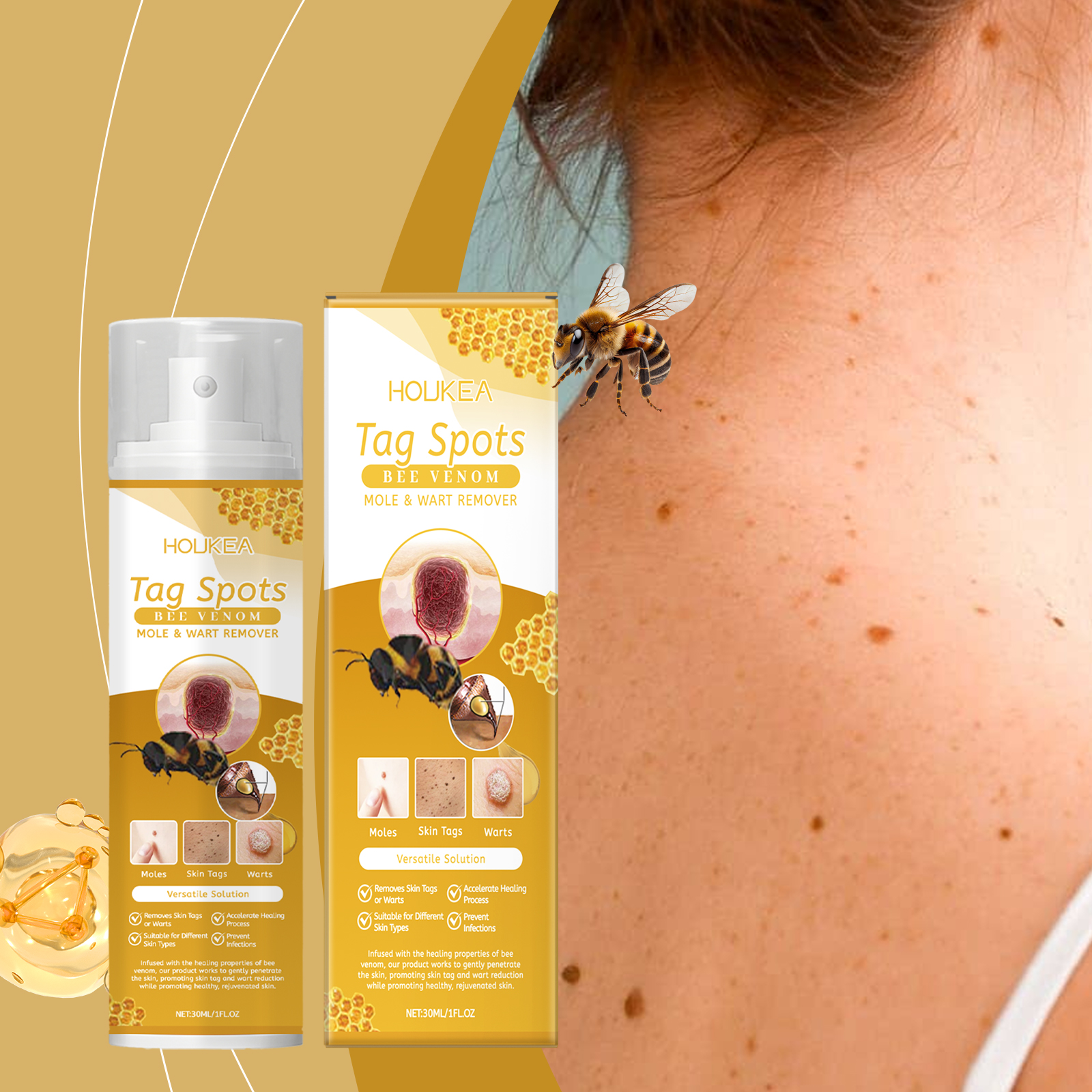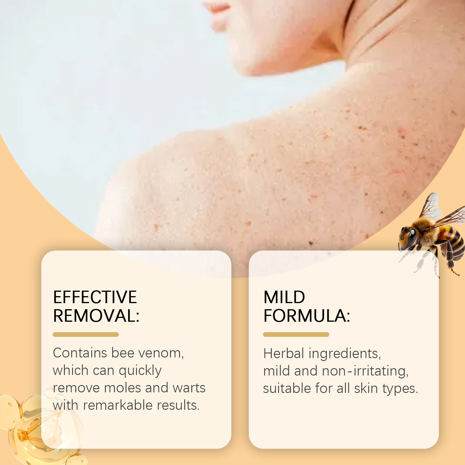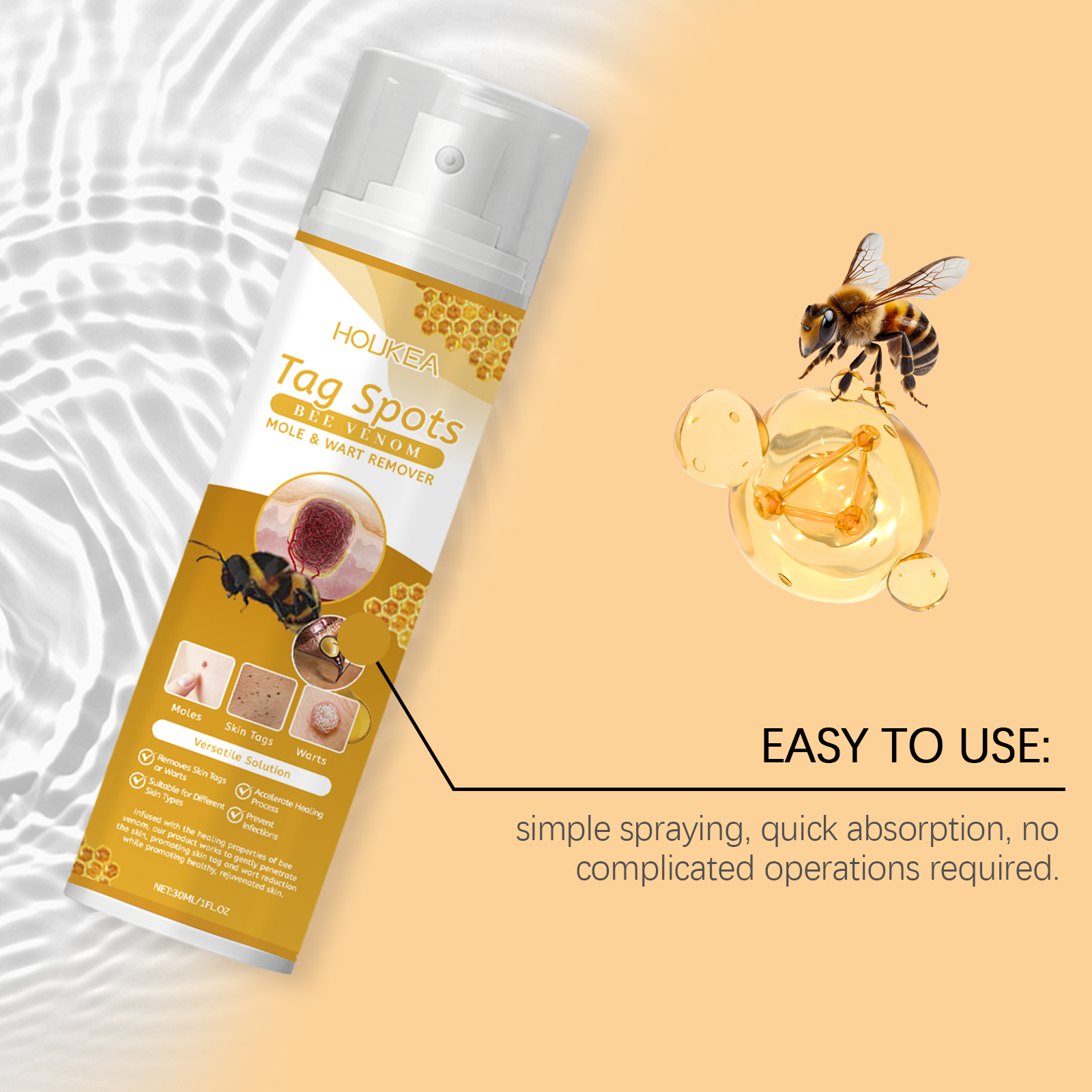 Our Bee Venom Wart Care spray contains mint leaves, vitamin E (tocopherol). It can be applied to many types of skin warts to promote skin health. Its use method is very simple: evenly spray the right amount of this product on the wart or mole, waiting for absorption. And herbal ingredients, mild and non-irritating, suitable for all skin types.