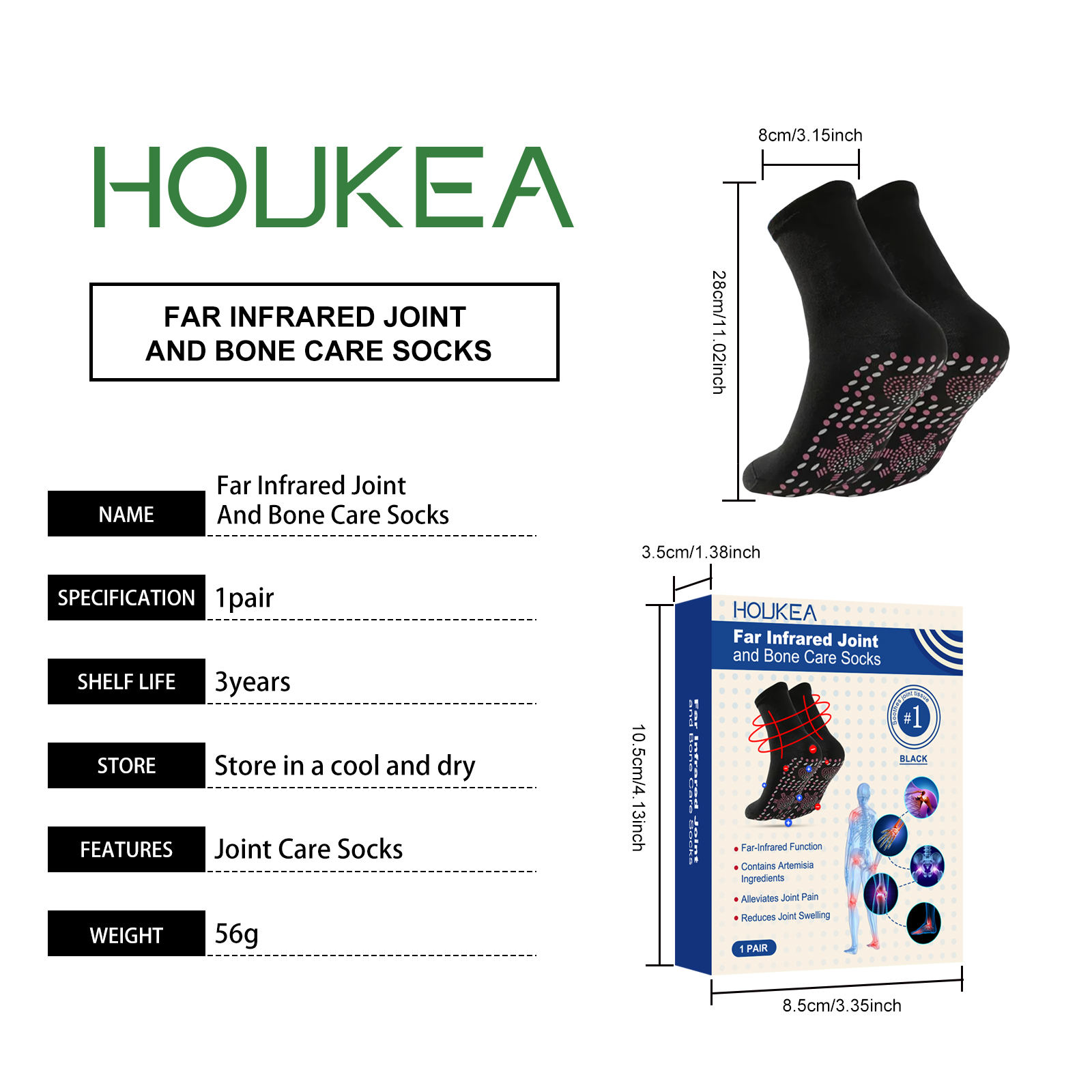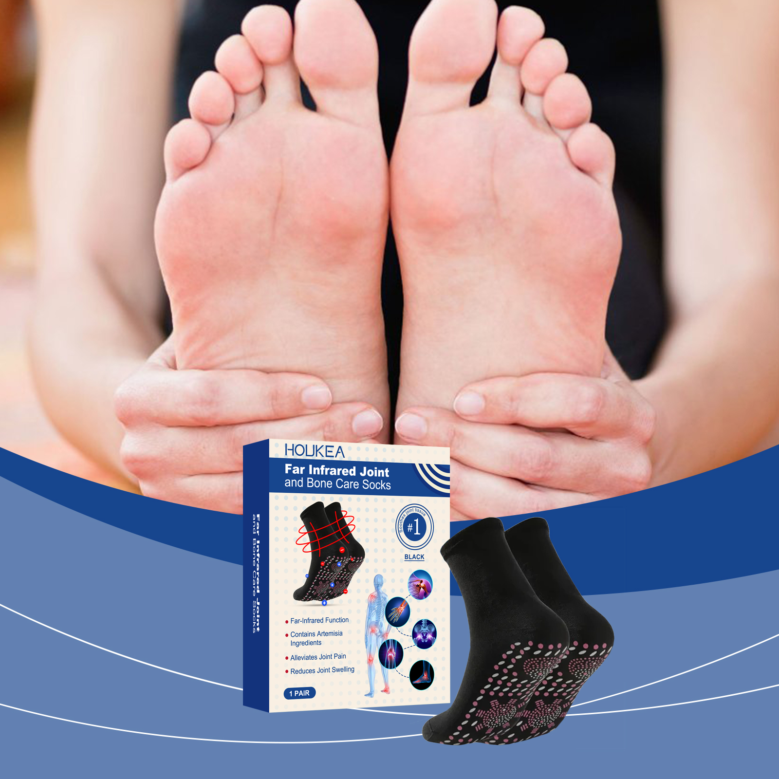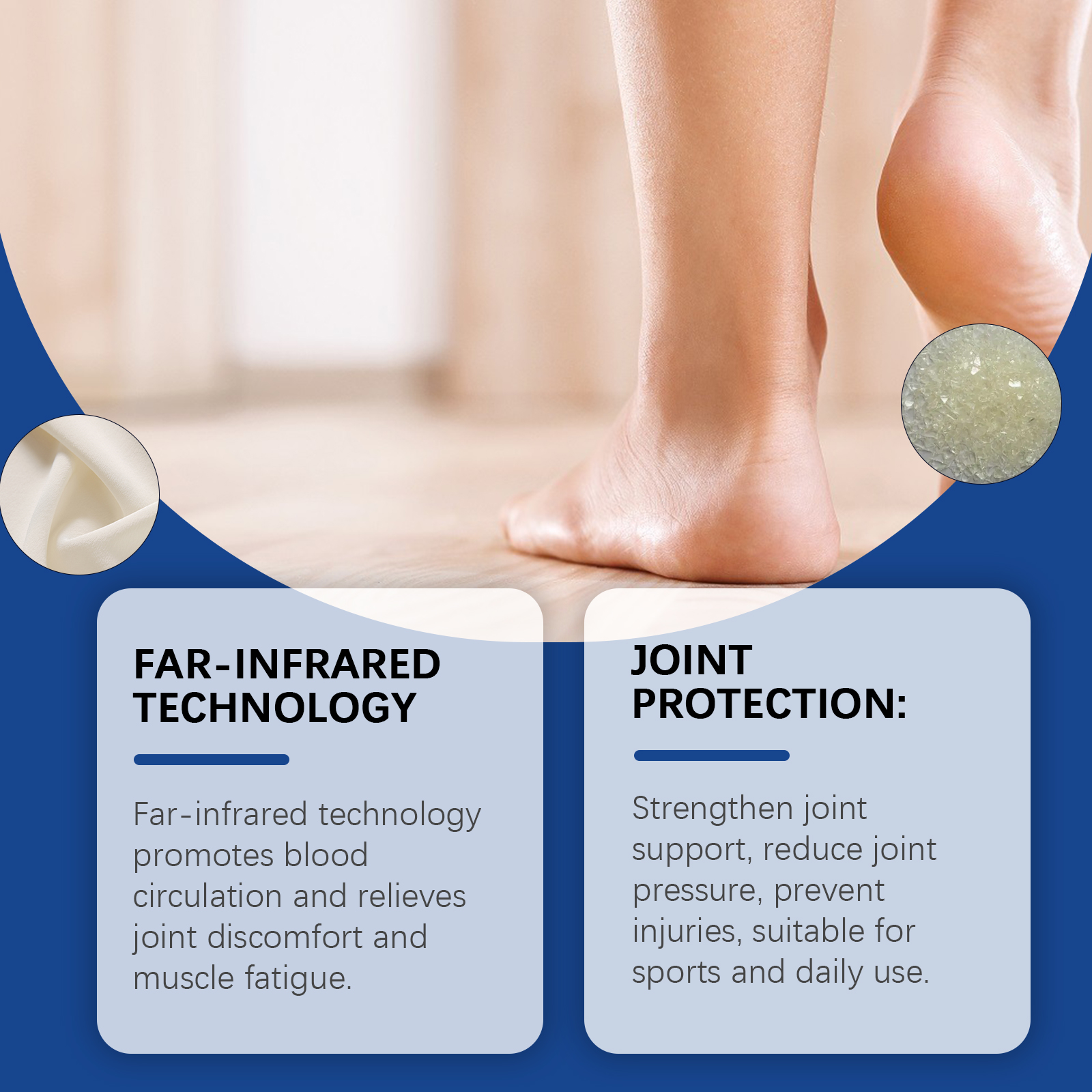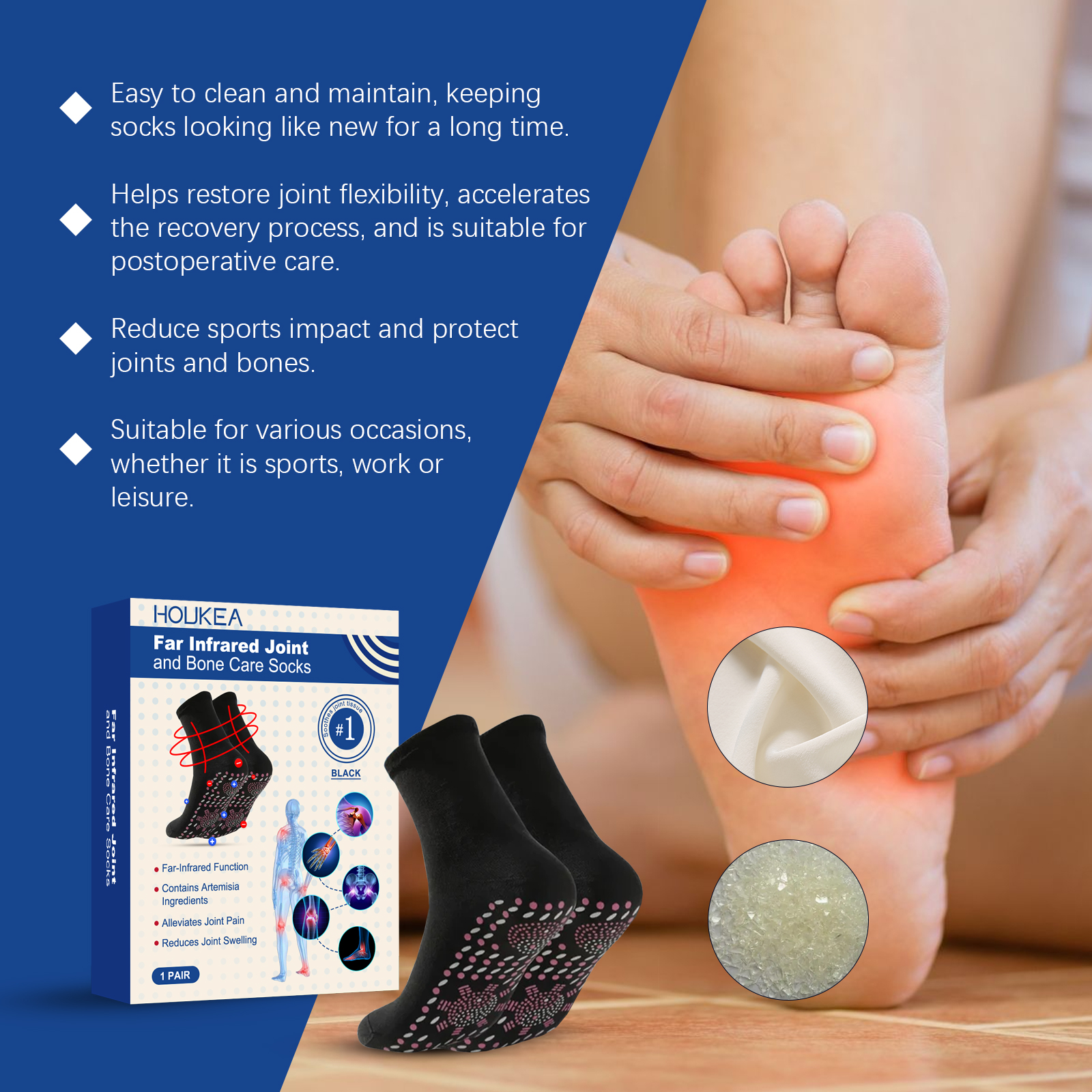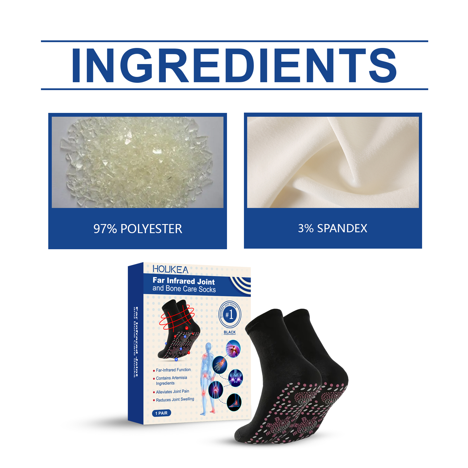 Our joint care socks are 97% polyester, 3% spandex. It can improve blood circulation, relieve joint discomfort and muscle fatigue. Strengthen joint support, reduce joint pressure, prevent injury, suitable for sports and daily use. The way to use it is very simple: wear it directly on the foot. Ergonomic design to fit the curve of the foot and provide stable support.