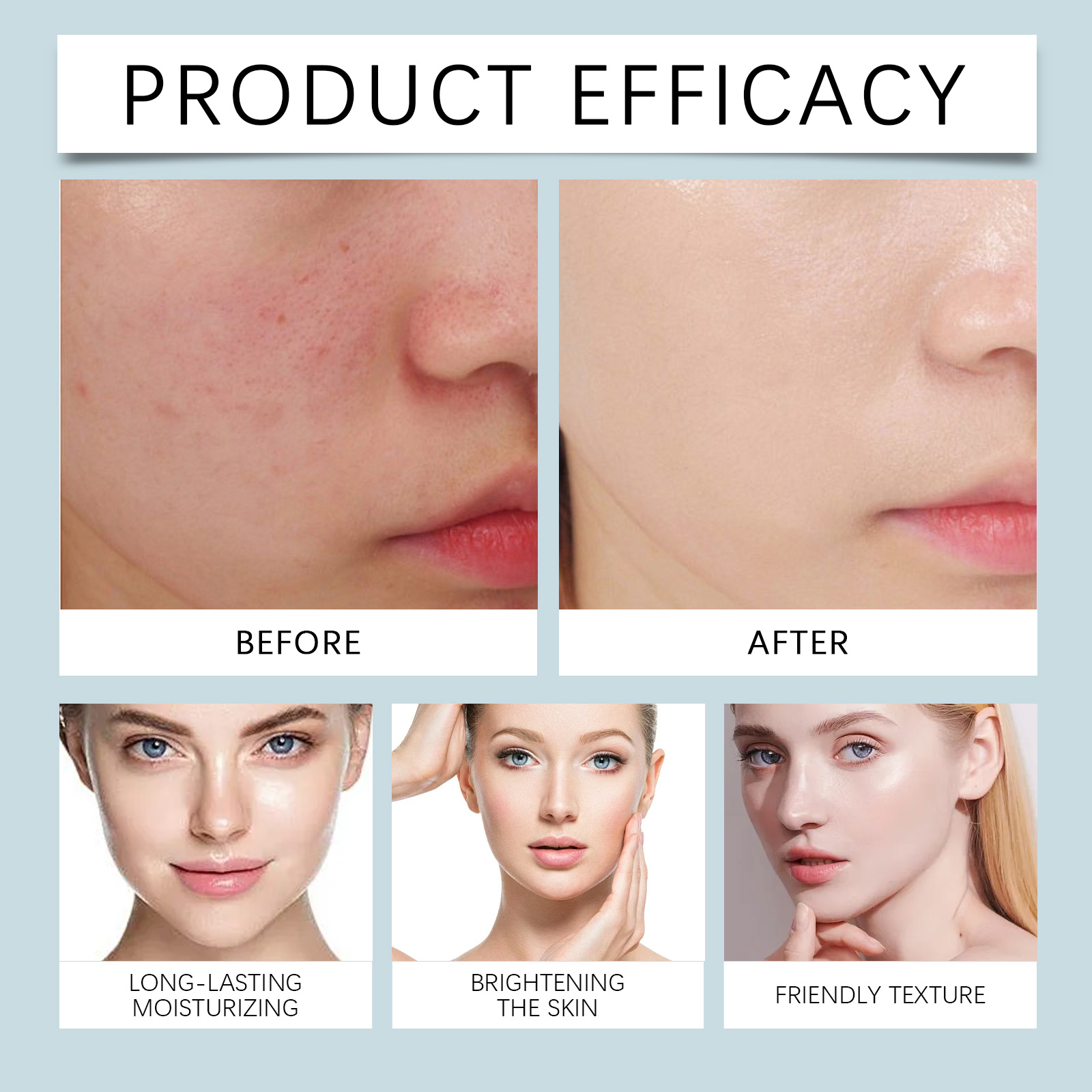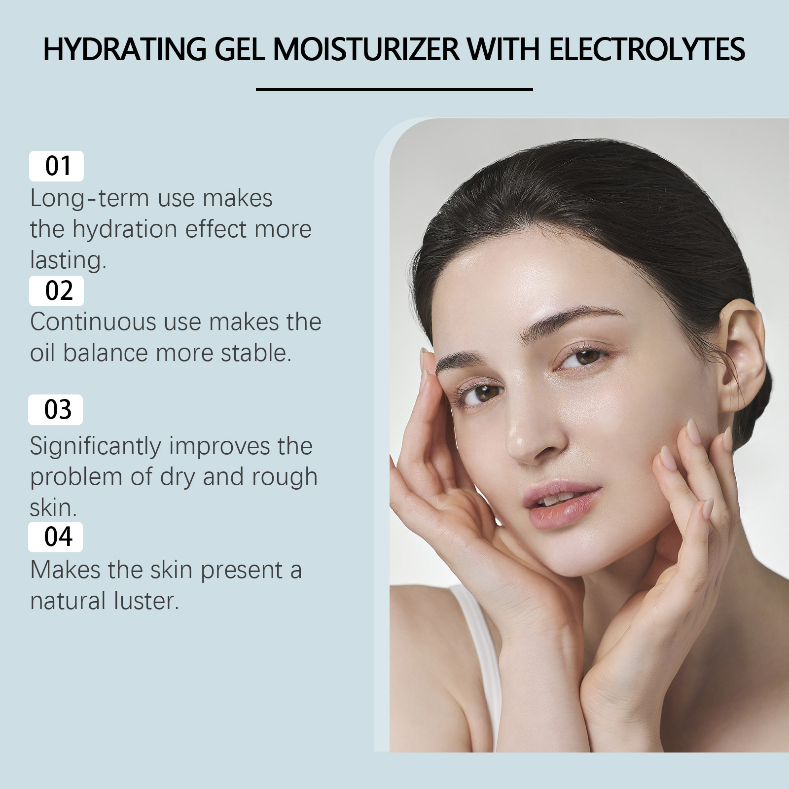 Our hydrating facial gel is carefully blended with sodium chloride, aloe vera extract and sodium hyaluronate. Designed to provide adequate moisture and nutrients to the skin. Use method is very convenient: after cleaning and conditioning, take appropriate amount of gel, evenly apply on the face, gently massage until completely absorbed. And can regulate the skin"s oil production.