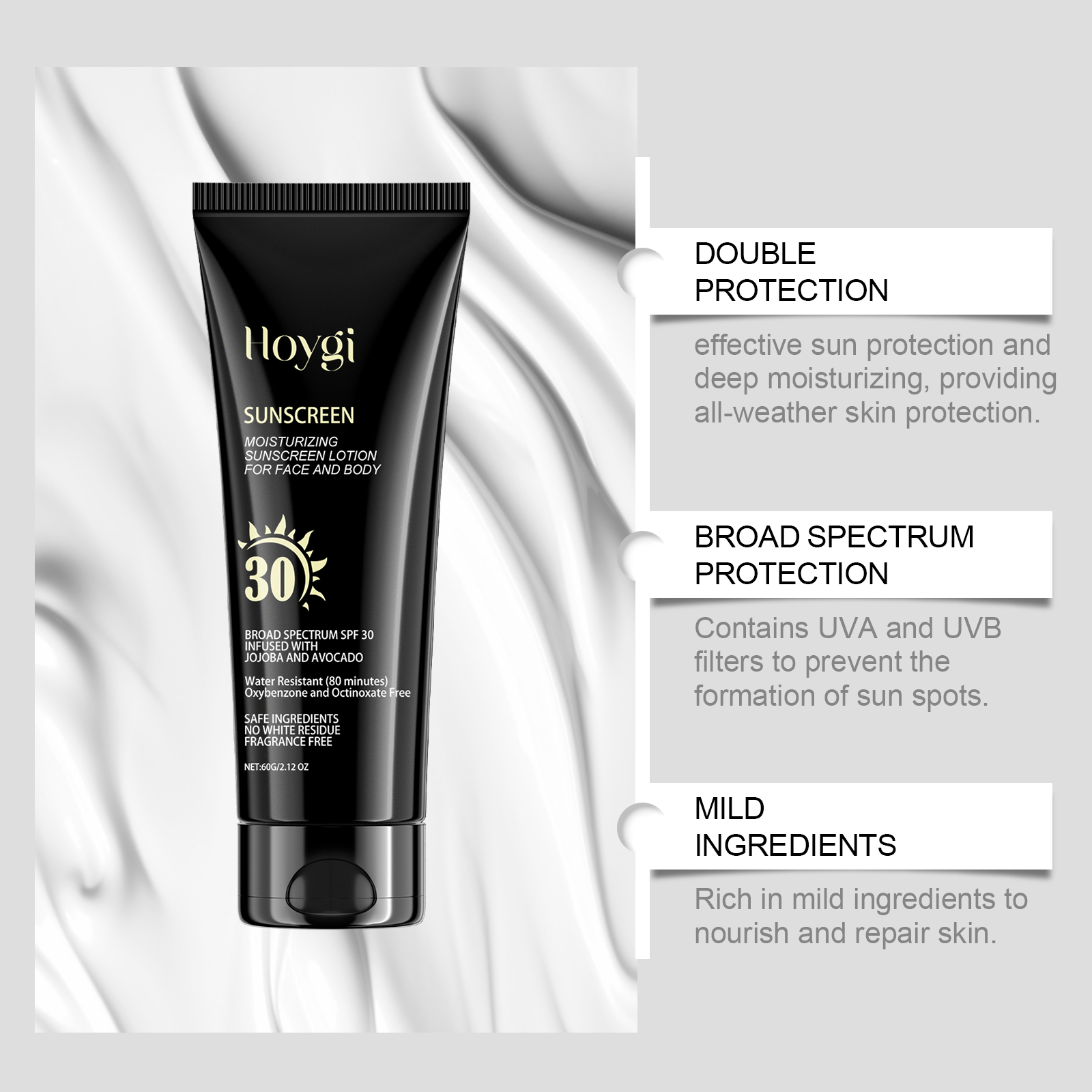 Our moisturizing protective cream contains titanium dioxide and hyaluronic acid. It can improve skin elasticity and effectively anti-aging. The formula is mild and can be used on sensitive skin. Its application method is very simple: 15-20 minutes before going out, apply sunscreen evenly on the face or body that needs sunscreen, massage until it is completely absorbed, and then form a film naturally, if you are exposed to the sun for a long time, you need to reapply it every 2-3 hours, if you need to apply makeup, please use before applying makeup. And can absorb quickly, suitable for the busy pace of life. Suitable for all kinds of outdoor sports sunscreen, easy to use.