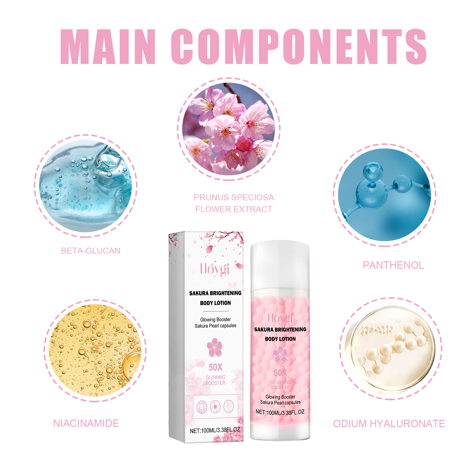 Our Sakura Brightening Body Lotions contains Prunus Speciosa Flower Extract, Panthenol, Sodium Hyaluronate. It can penetrate the skin, increase the water content of the skin, make the skin soft, moist and shiny, enhance the skin elasticity, make the skin firmer. Its application is simple: after bathing and cleaning the skin, squeeze the product on the palm of the hand, apply it to the whole body, and gently massage it to help the product absorb. It can moisturize and lock water, deeply moisturize, improve dull skin and lighten skin tone.