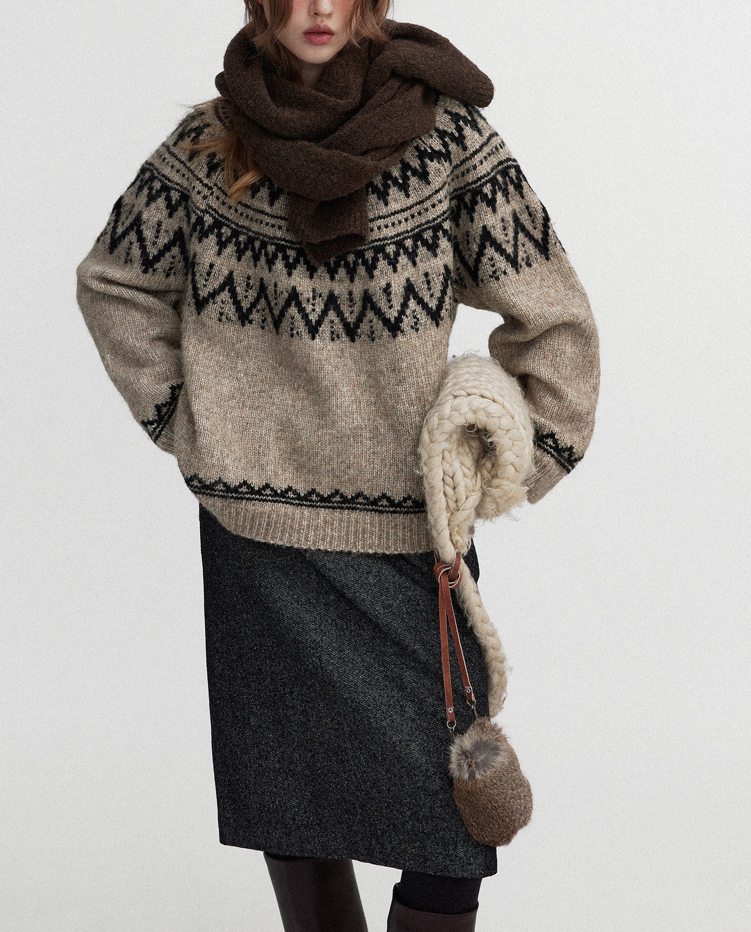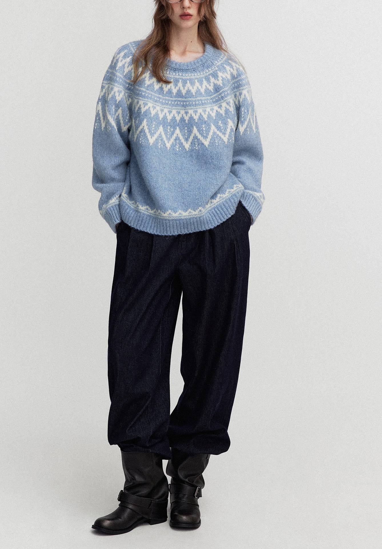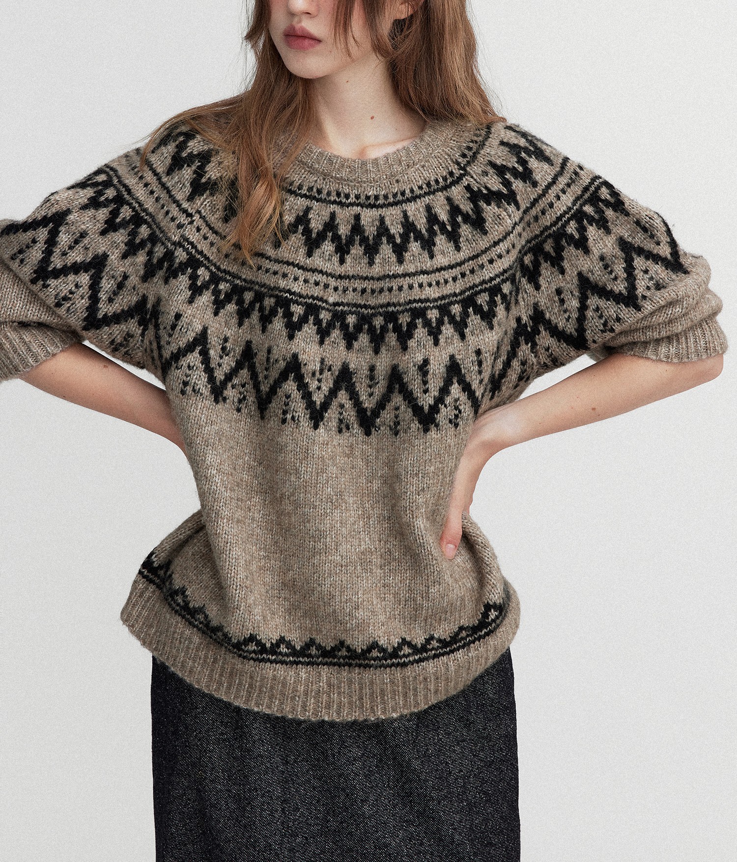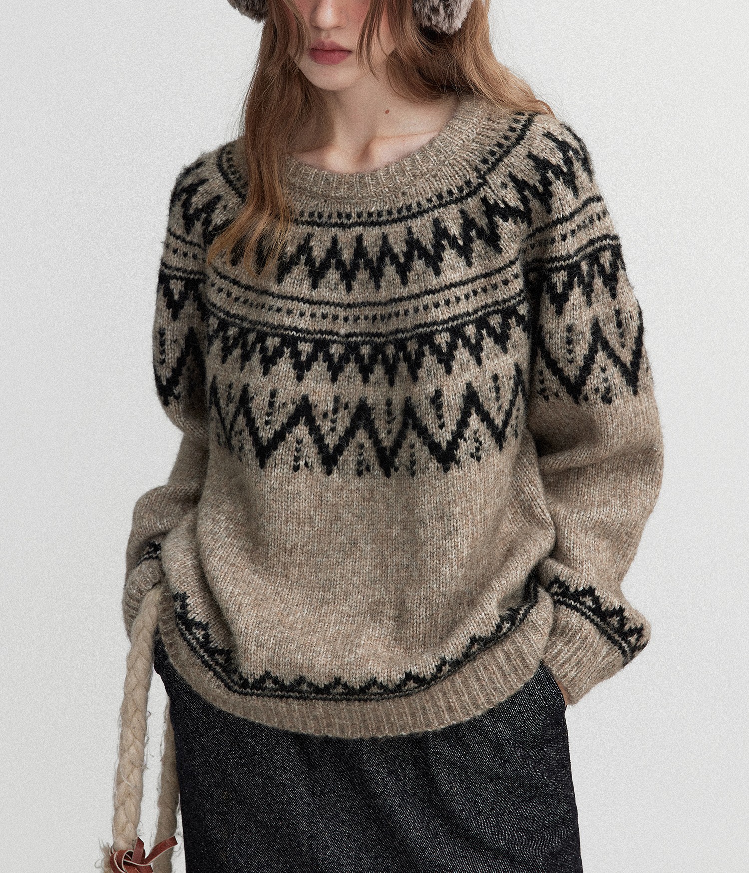 Letm 冰岛下雪’复古蓬松高羊驼毛几何提花费尔岛圆领毛衣女