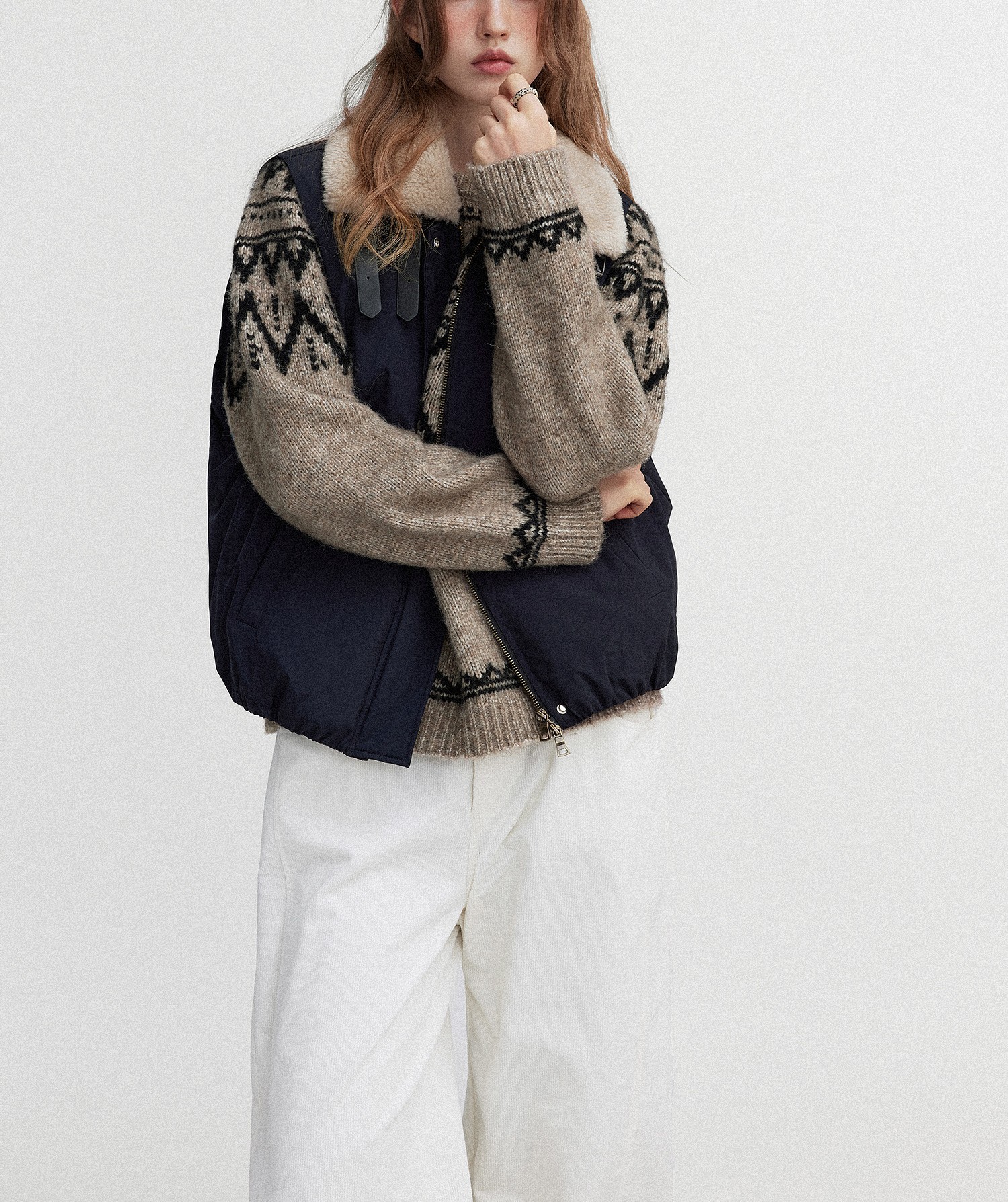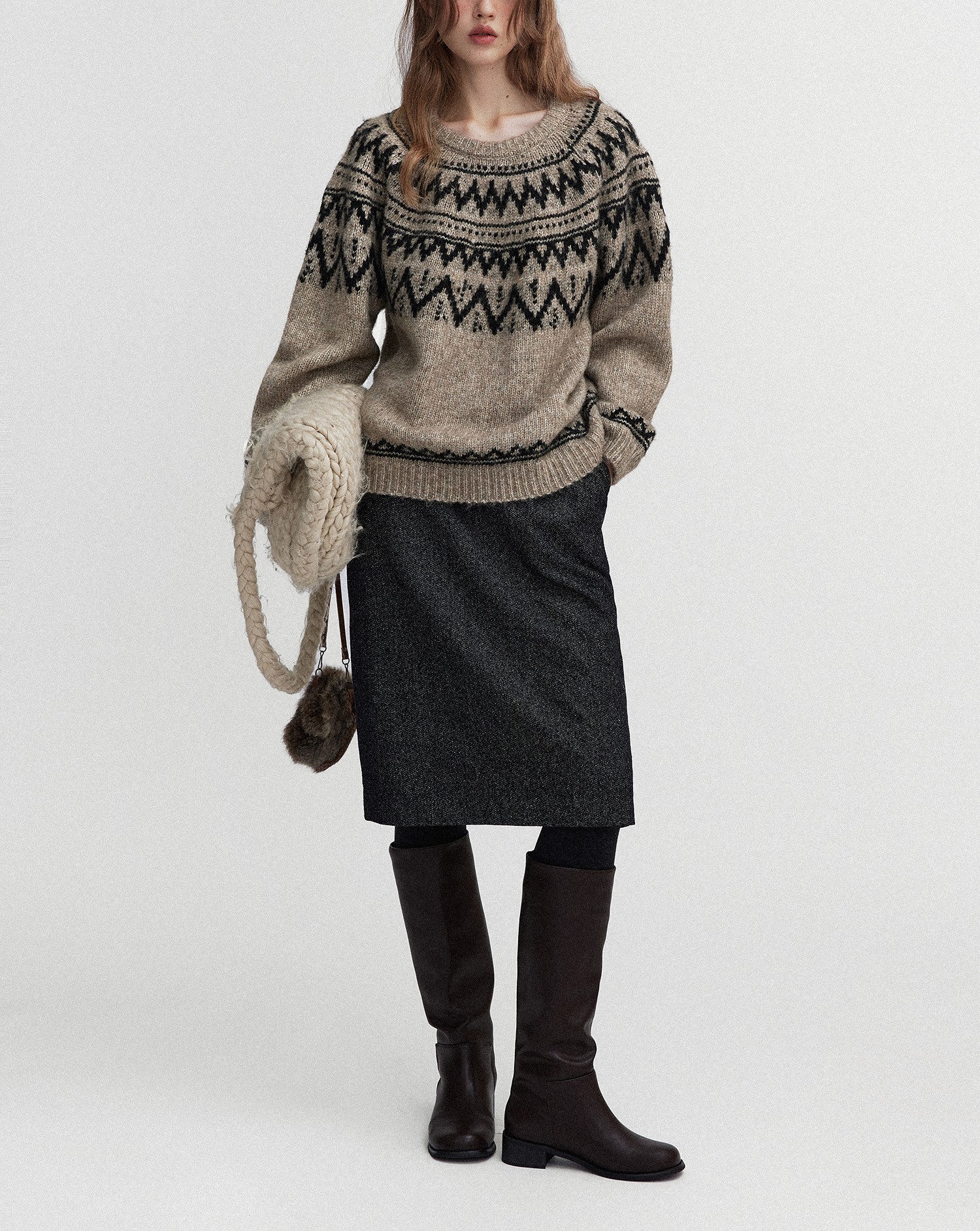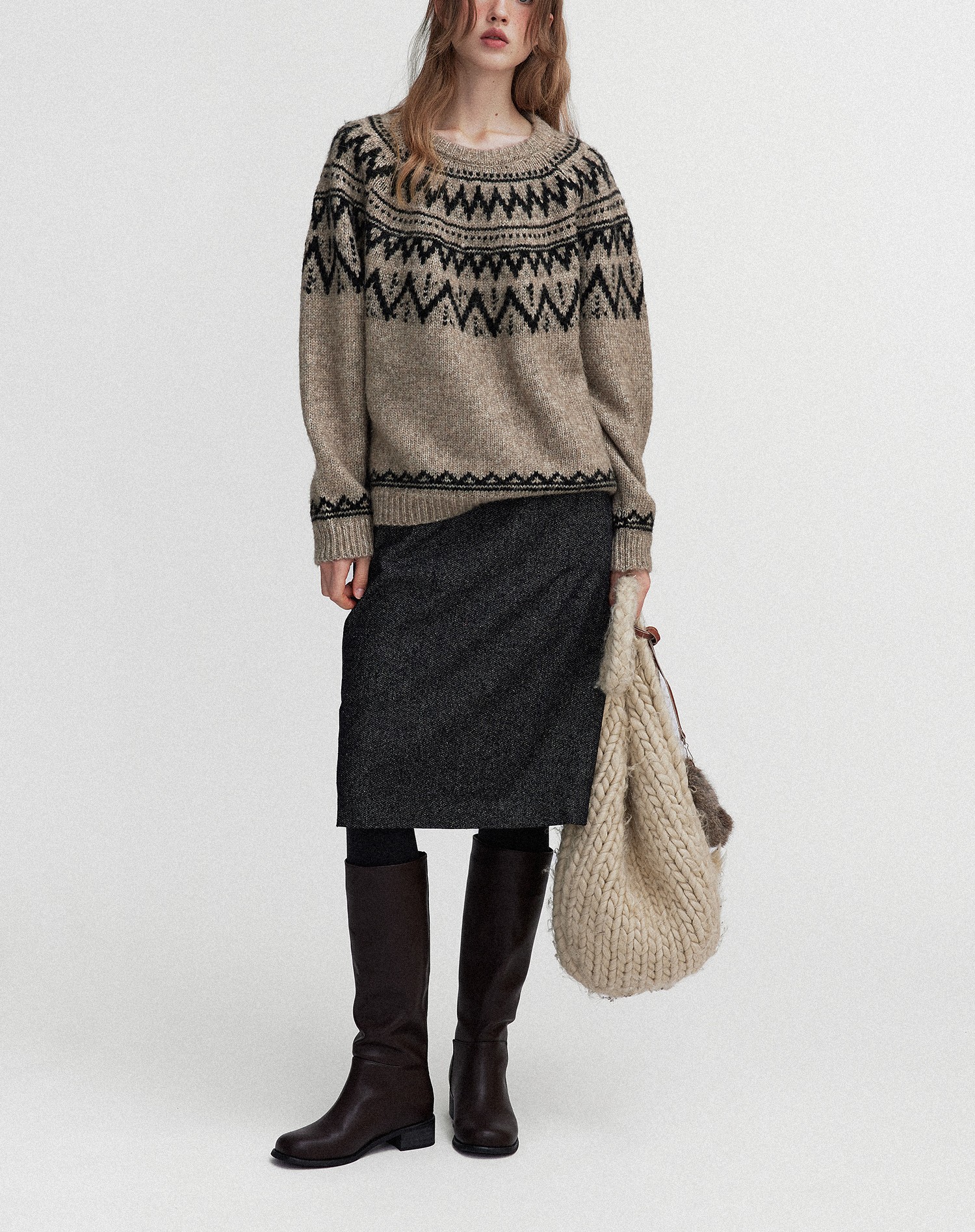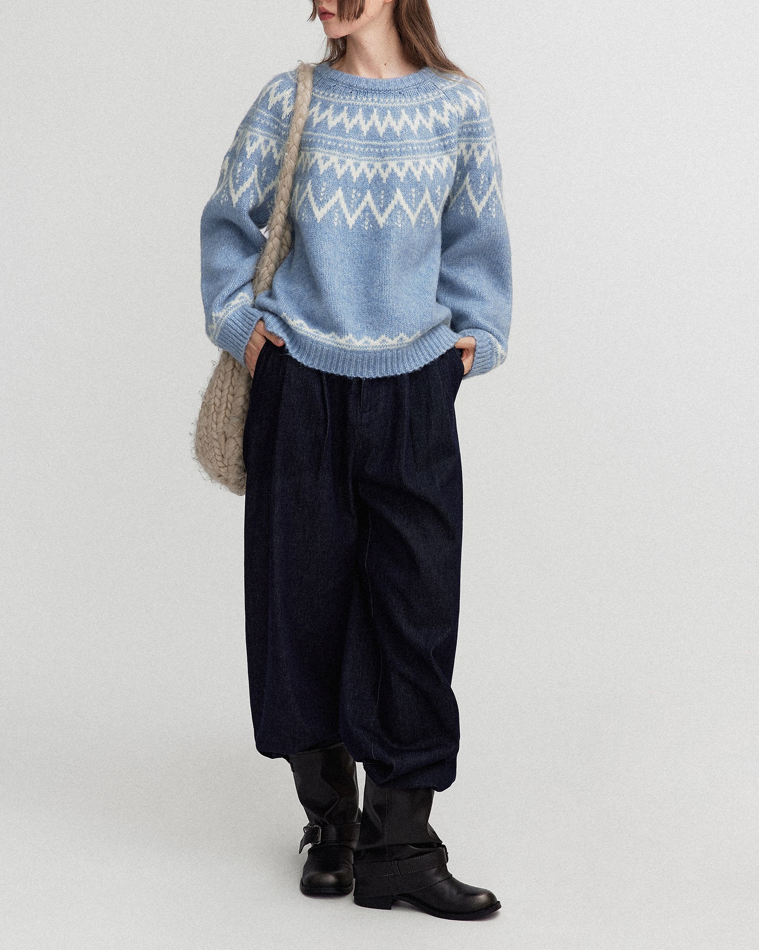 Letm 冰岛下雪’复古蓬松高羊驼毛几何提花费尔岛圆领毛衣女