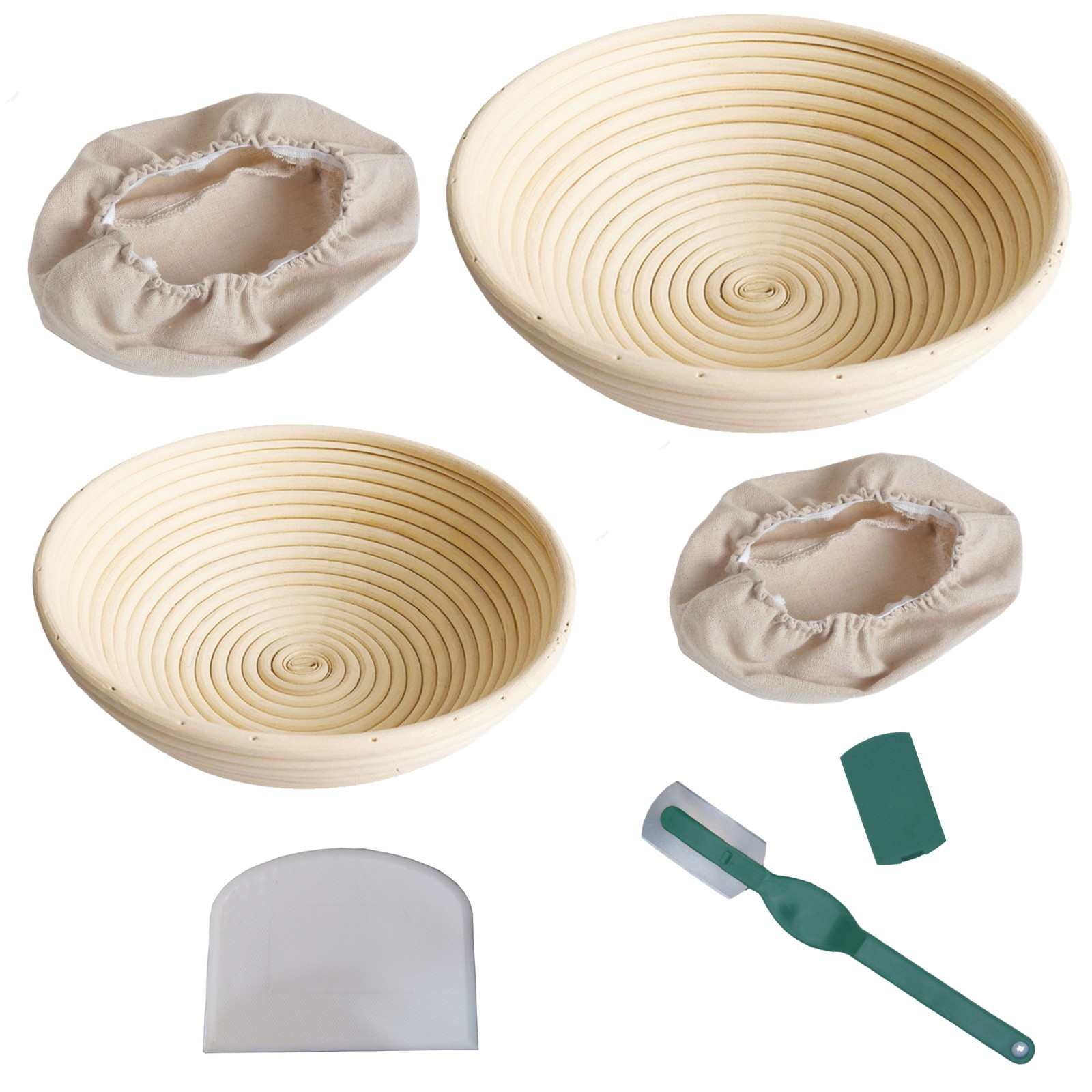 Set B1--Round 25 basket(with cloth cover)+Round 22 basket(with cloth cover)+Green bread cutter+White half-round scraper
