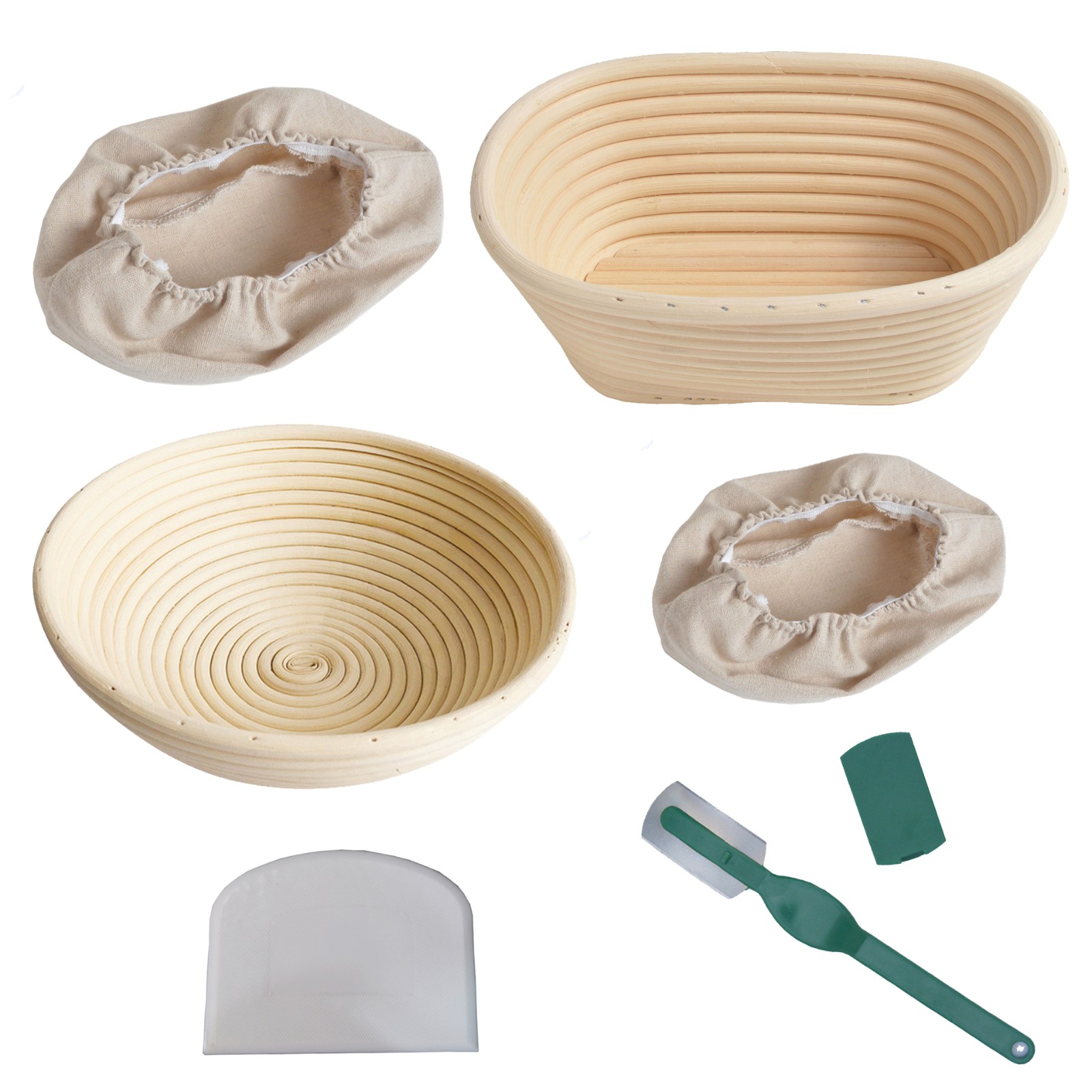 Set A1--Oval 25 basket(with cloth cover)+Round 22 basket(with cloth cover)+Green bread cutter+White half round scraper
