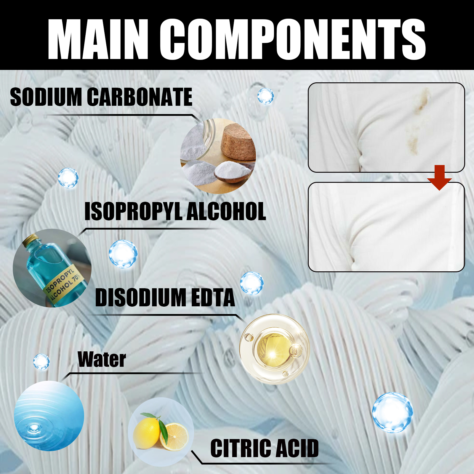 Our fabric rust remover contains sodium carbonate and disodium EDTA. It can penetrate deep into the clothing fiber, effectively break a variety of stubborn rust and stains, and restore the original color and texture of the fabric. Its use method is very simple: 1. Take appropriate amount of this product directly and evenly apply to stains and rust stains. 2. Wipe the dirty area. 3. Wait 1 minute and wash the fabric with detergent. And the product has a fresh fragrance. While removing stains, it also gives the clothes a refreshing taste and gives you a pleasant moment.