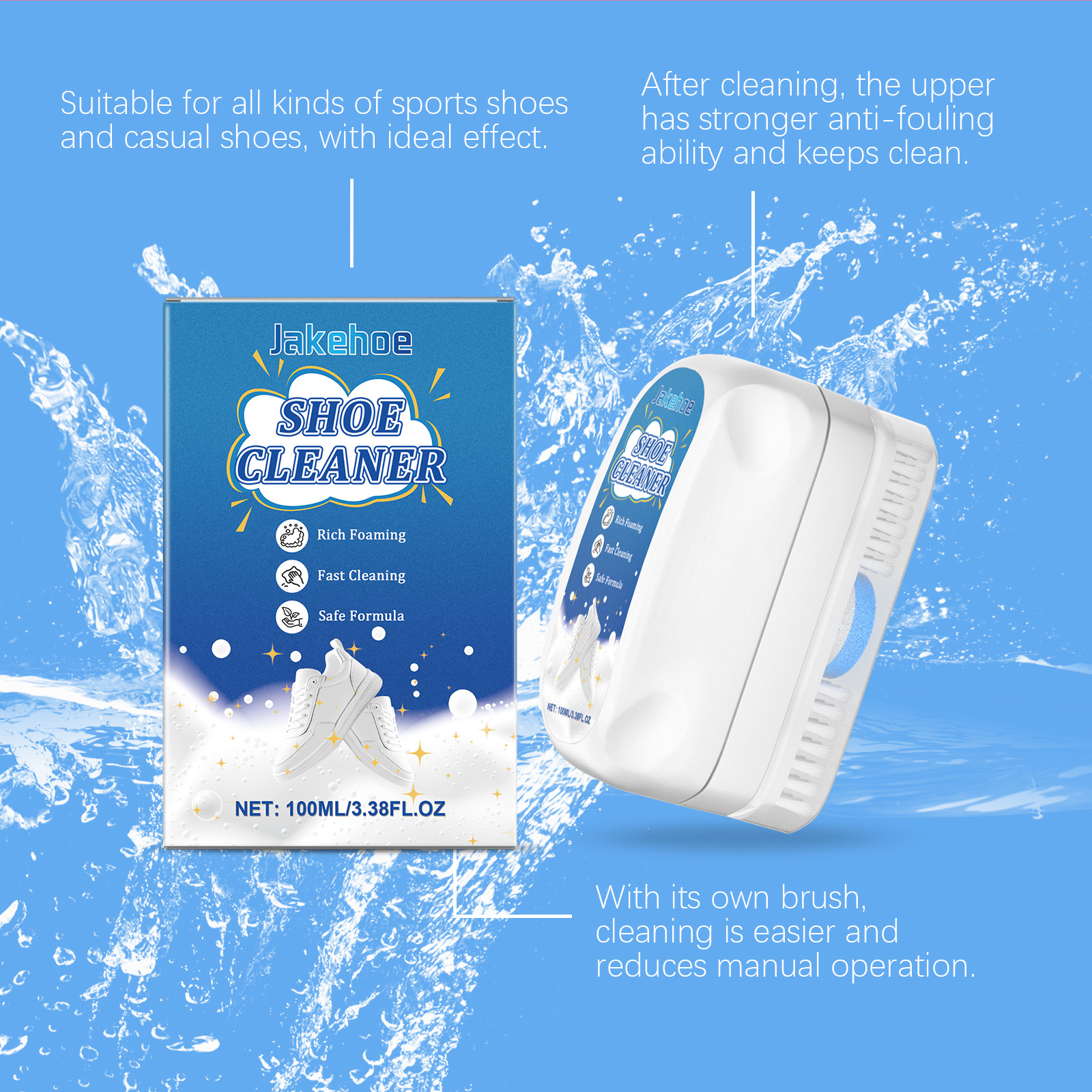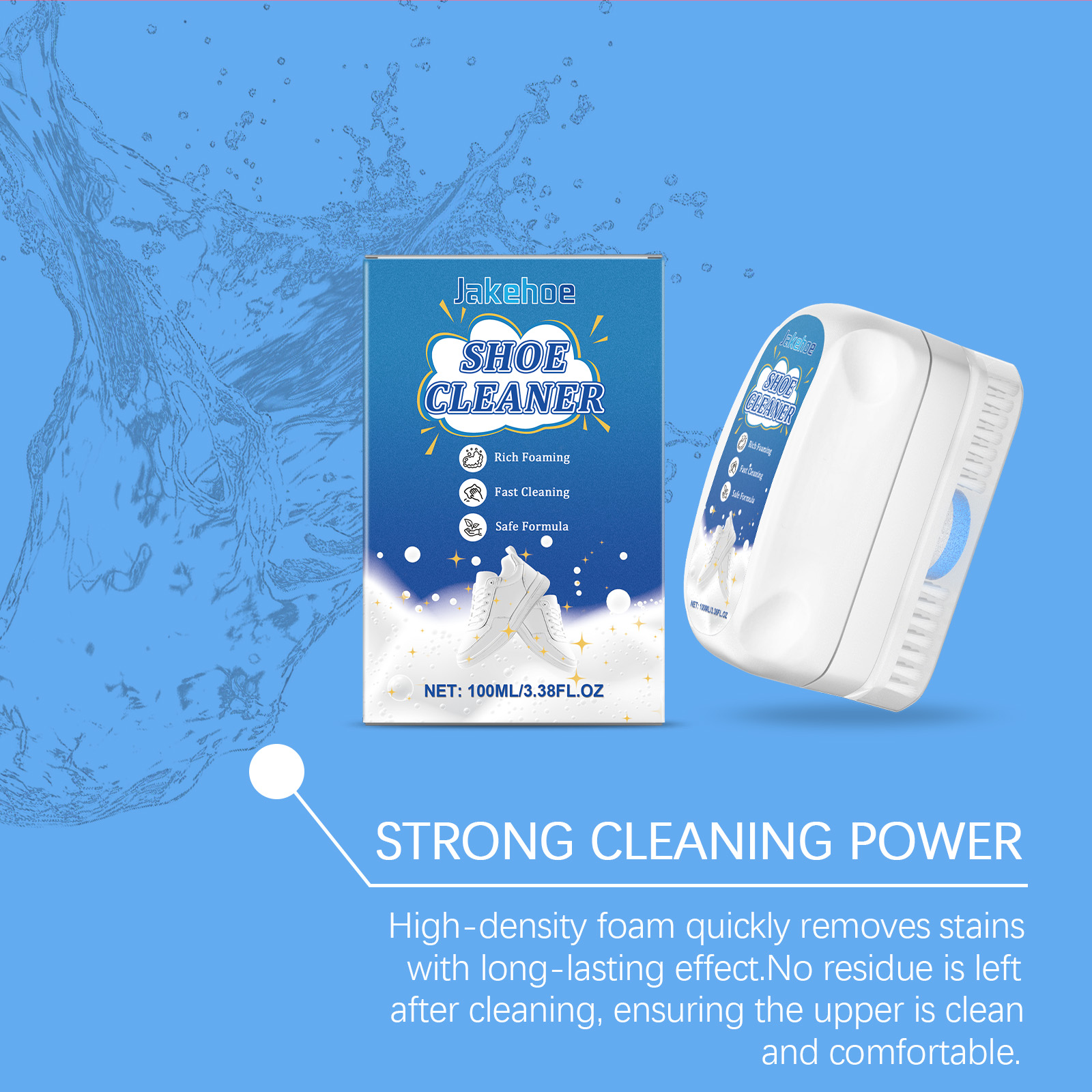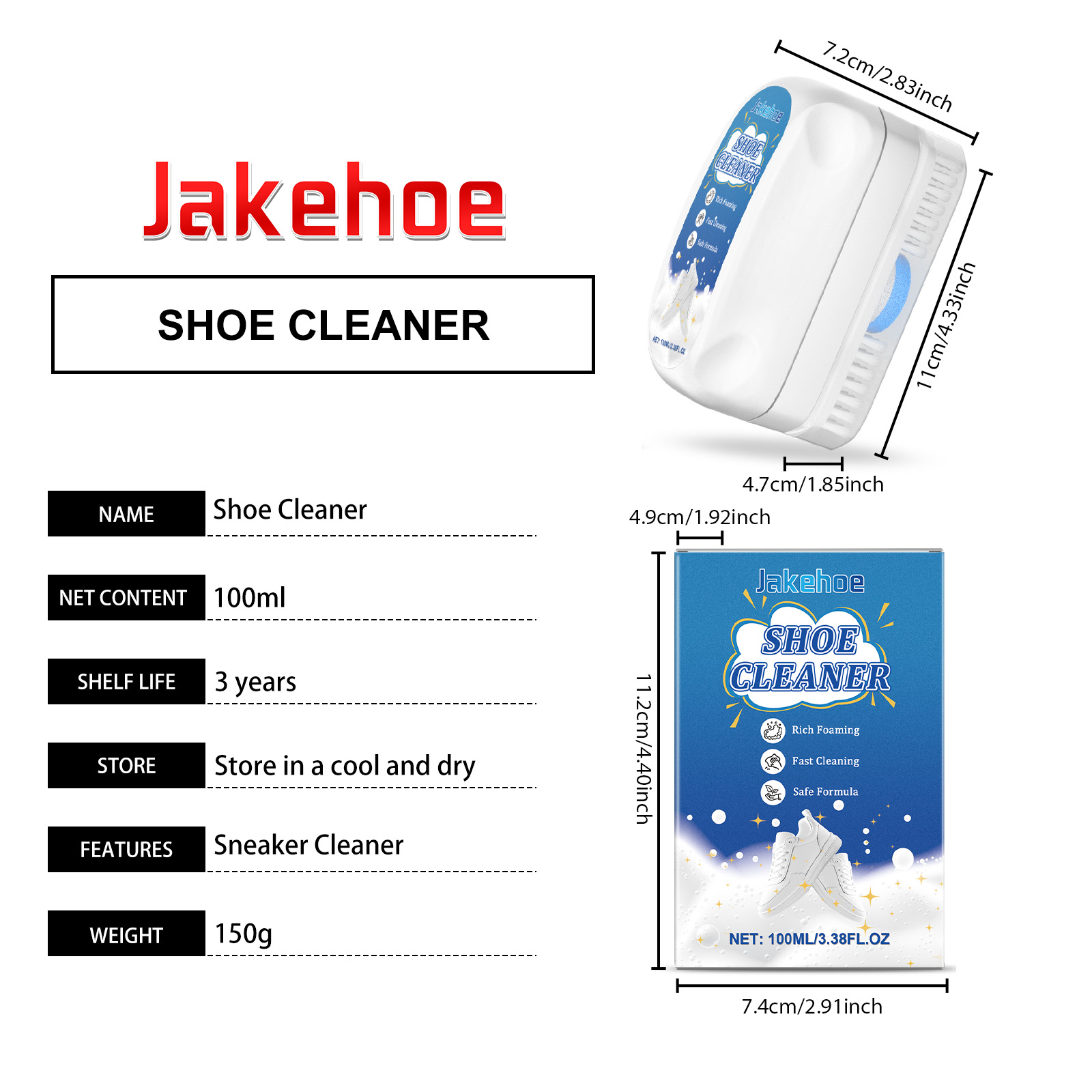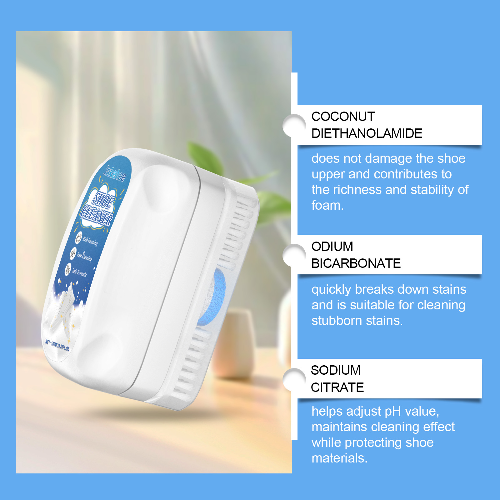 Our sneaker cleaner contains coconut oil diethanolamide, sodium bicarbonate and sodium citrate. It removes dirt and grass stains easily. Its use is simple: press the small red dot in the center of the sponge head and squeeze out the cleaner. Apply it to the surface to be cleaned and scrub. Then wipe off excess foam and decomposed dirt with a damp cloth or paper towel wrung out of water and allow to air dry. And no water is needed, just pump out the foam, which can easily dissolve stubborn stains and restore the brightness of the shoes.