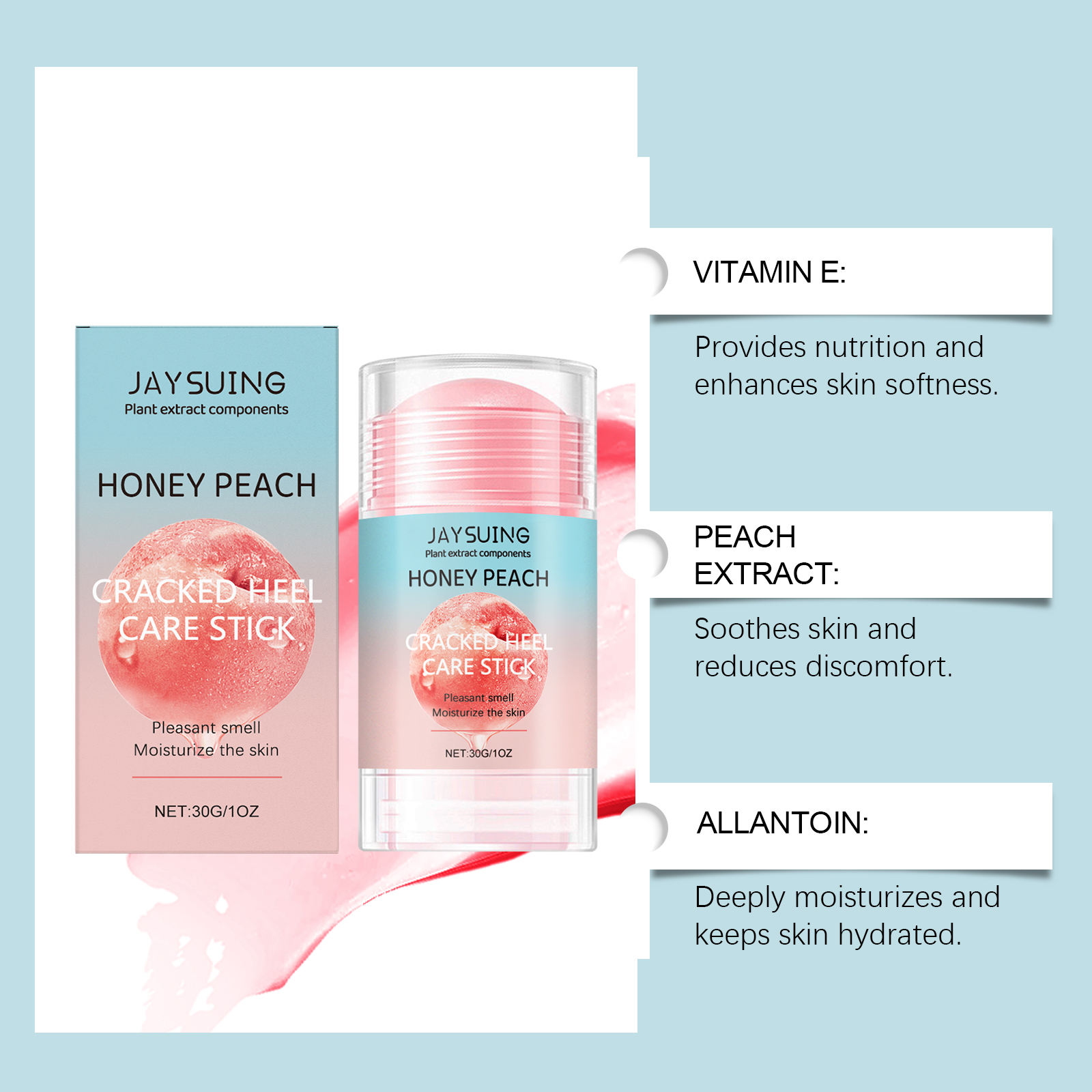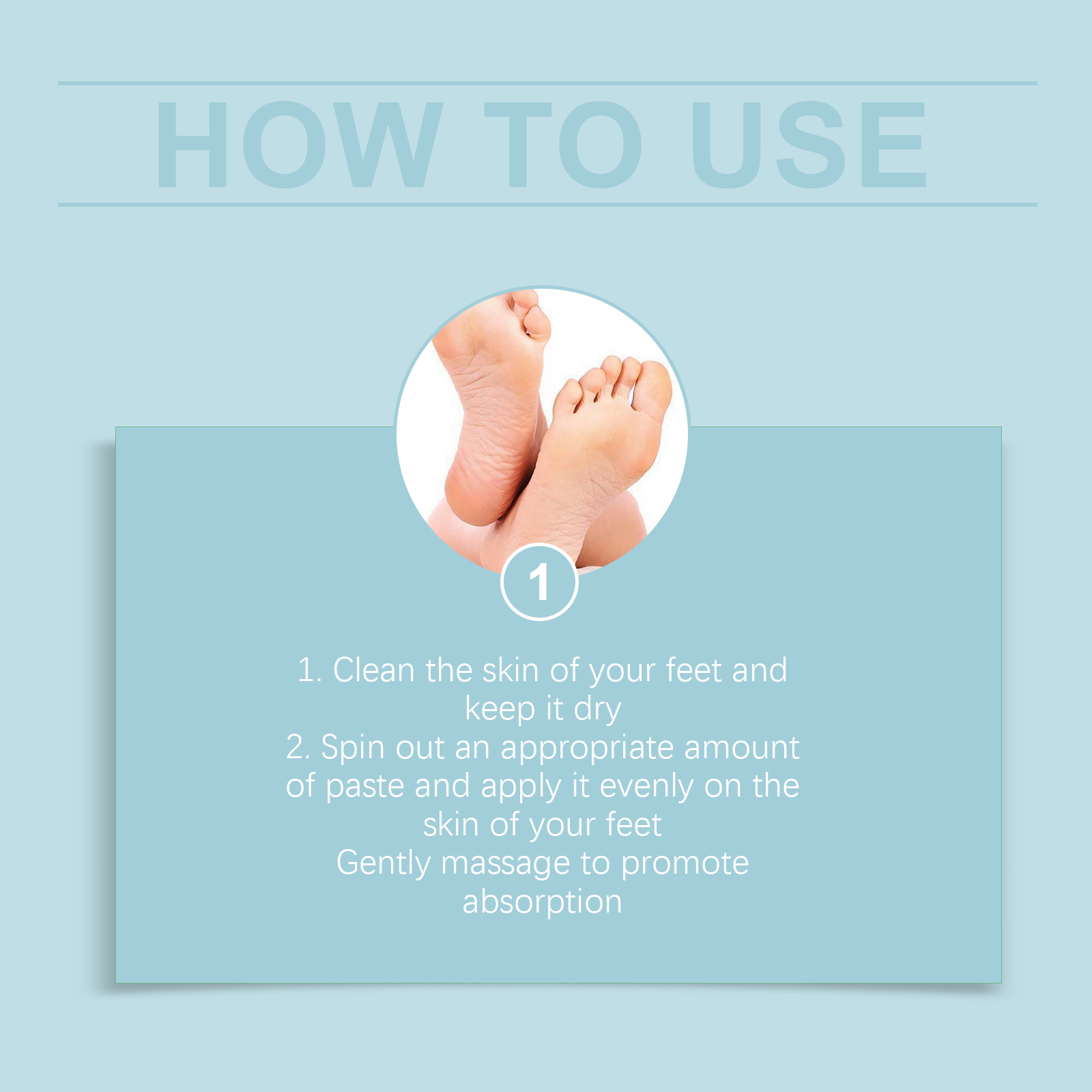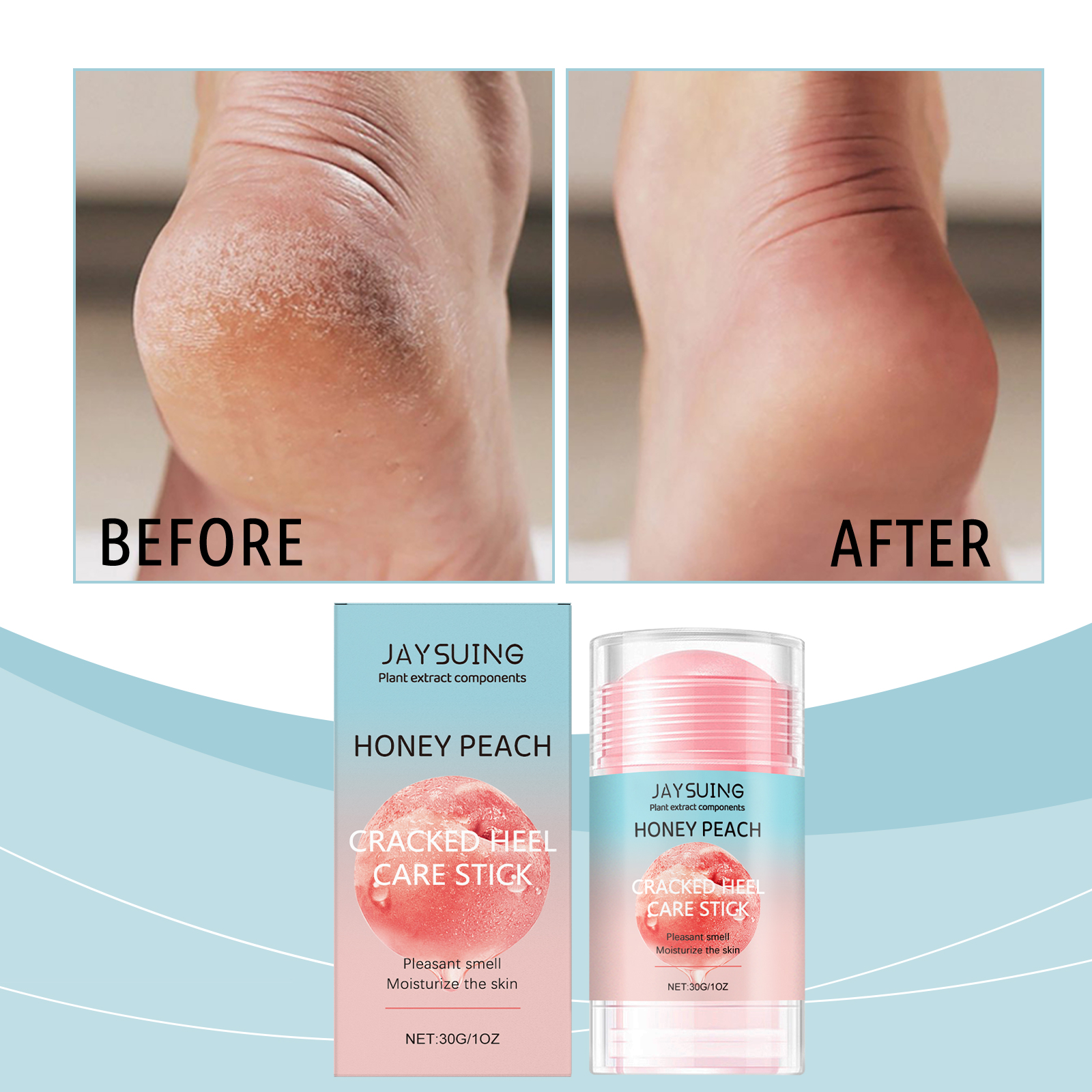 Our foot moisturizing stick is made of tocopherol (Vitamin E), allantoin and honey. Designed to strengthen the skin barrier and prevent moisture loss. Easy to use: clean your feet and keep them dry. Rub out an appropriate amount of paste and apply evenly to the skin of your feet. Massage gently to promote absorption. And it can effectively reduce itching caused by dryness.