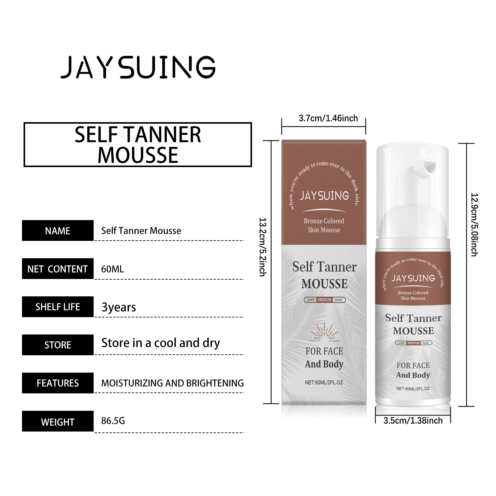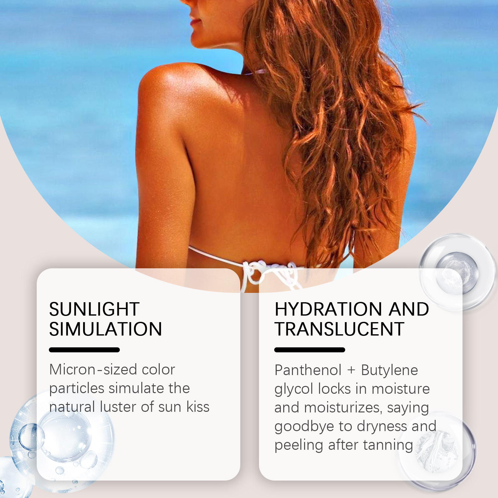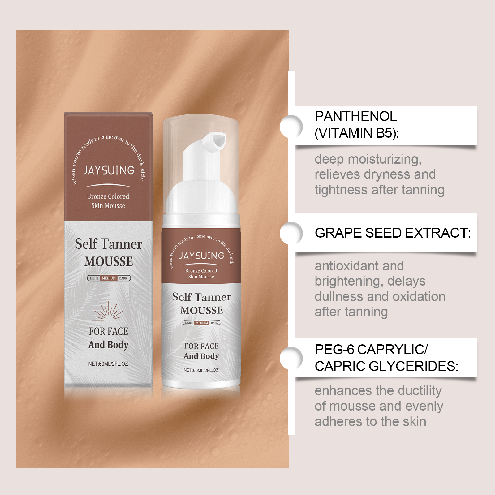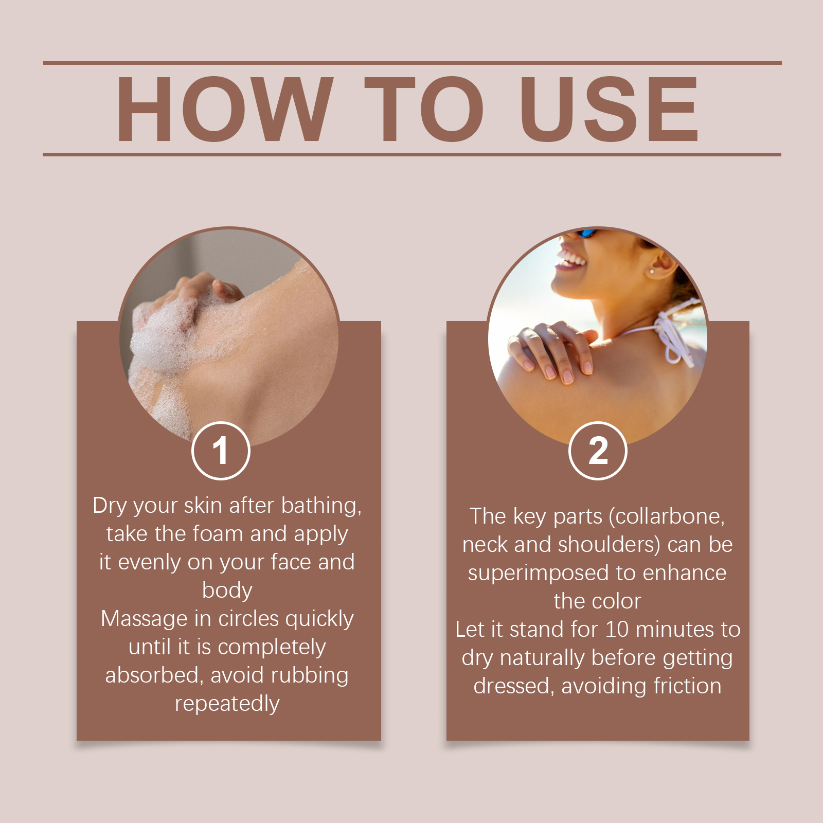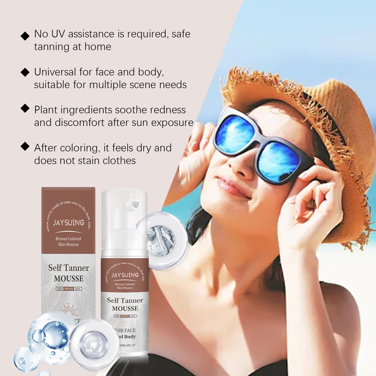Our Black foam mousse is carefully blended with panthenol (vitamin B5) and grape seed extract. Designed to moisturize skin, avoid drying and peeling after sun. Easy to use: Dry your skin after showering and apply the foam evenly to your face and body. Massage in quick circles until completely absorbed to avoid repeated rubbing. Key areas (collarbone, neck and shoulders) can be superimposed to enhance color. Let it air dry for 10 minutes before wearing, to avoid friction. And it can neutralize free radicals and delay dull oxidation reactions.