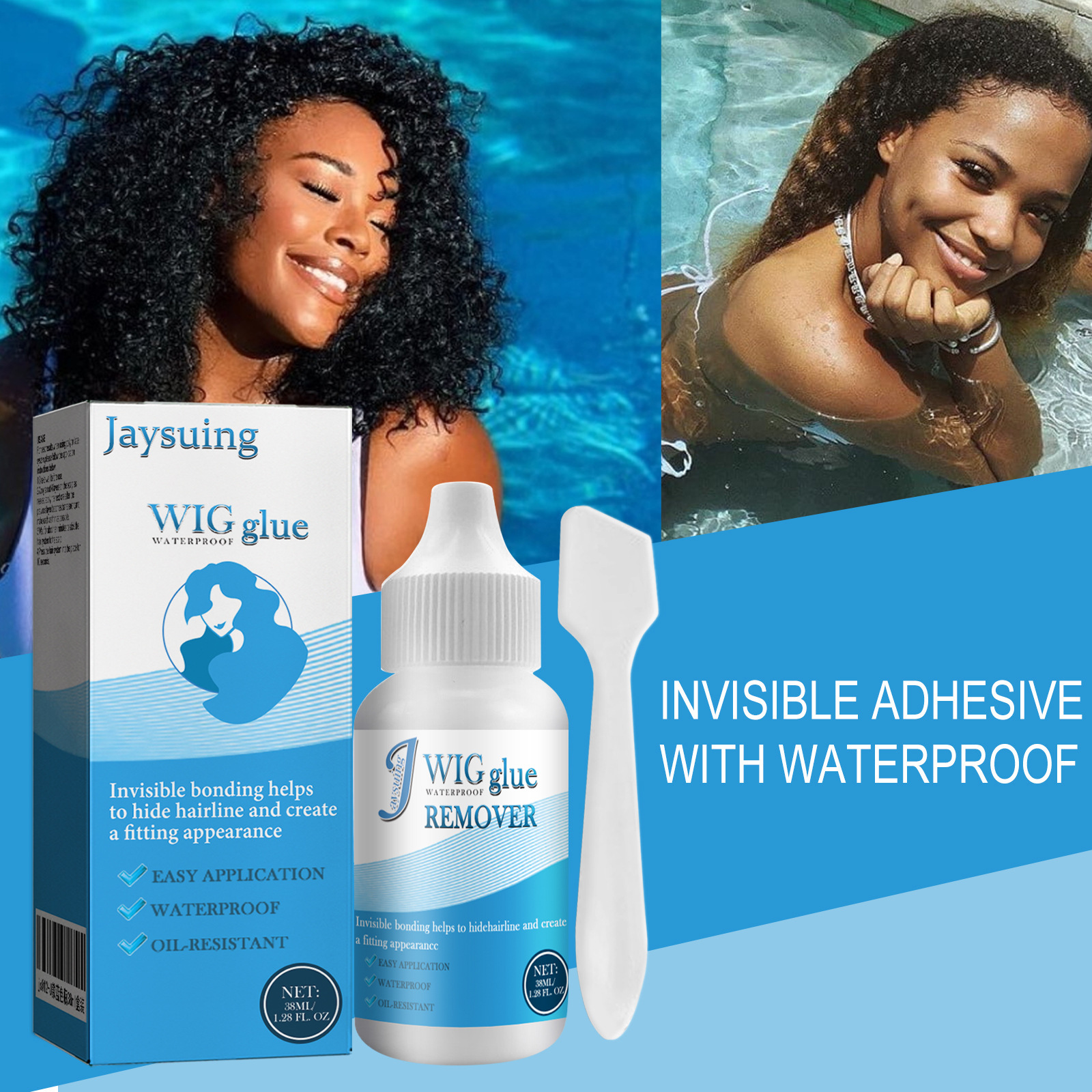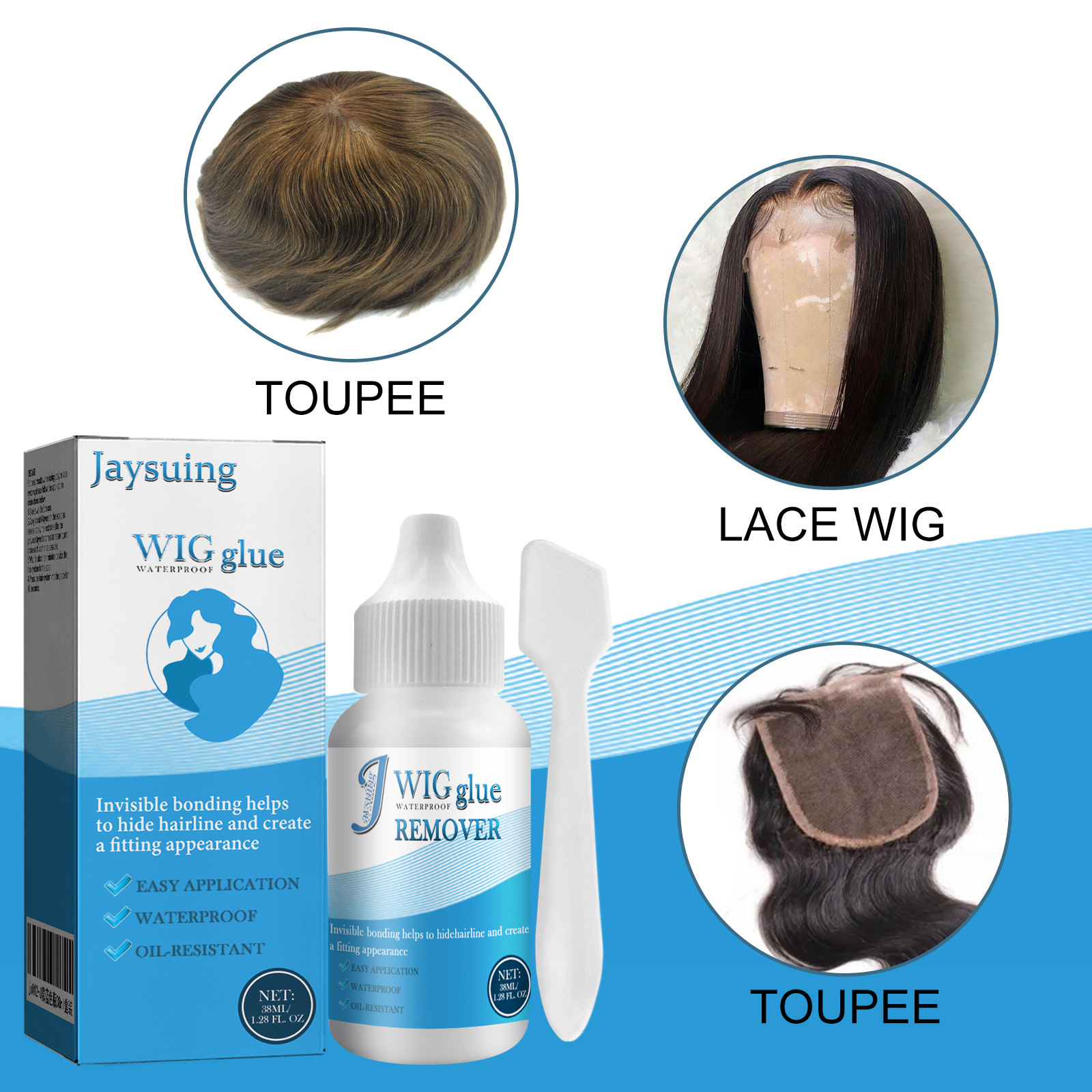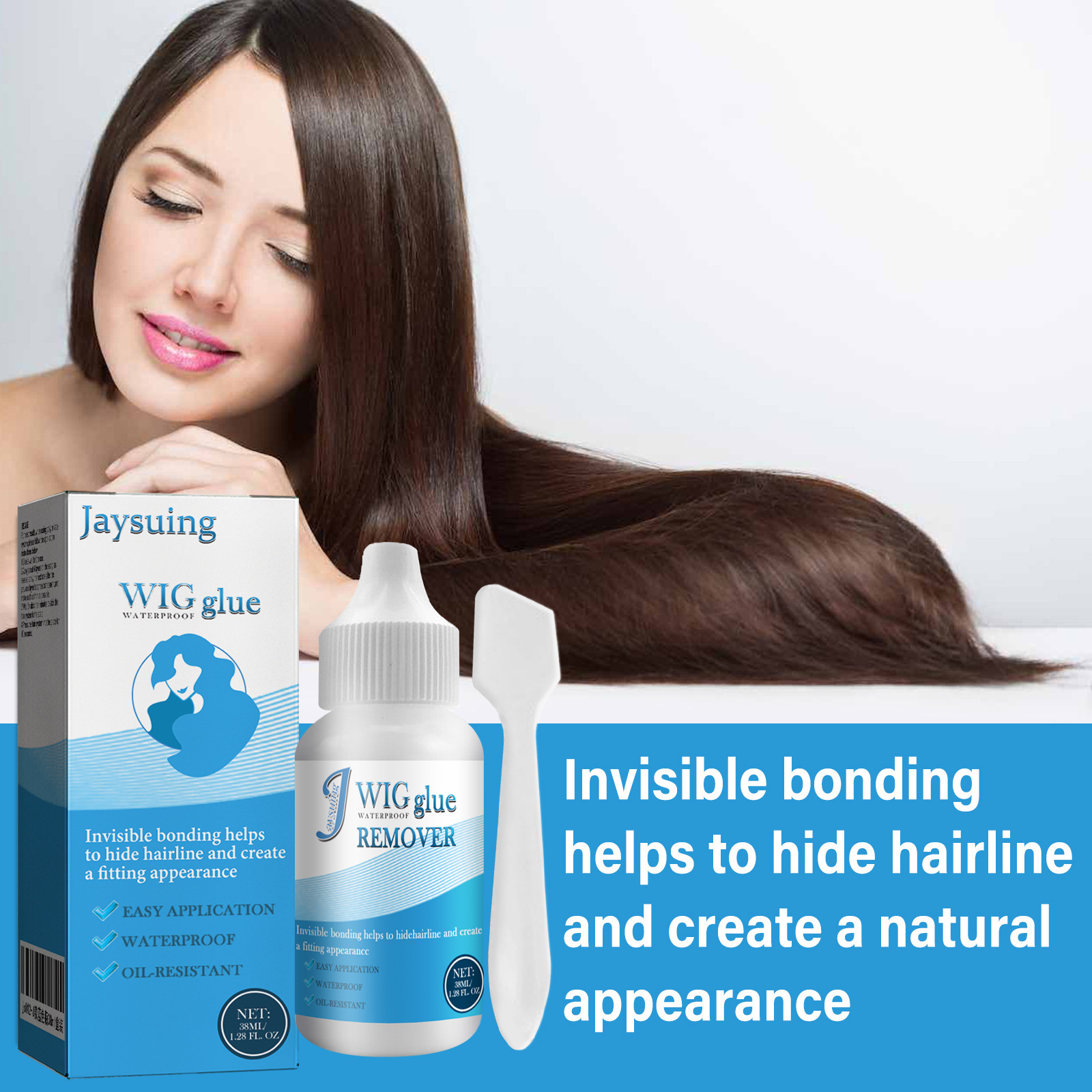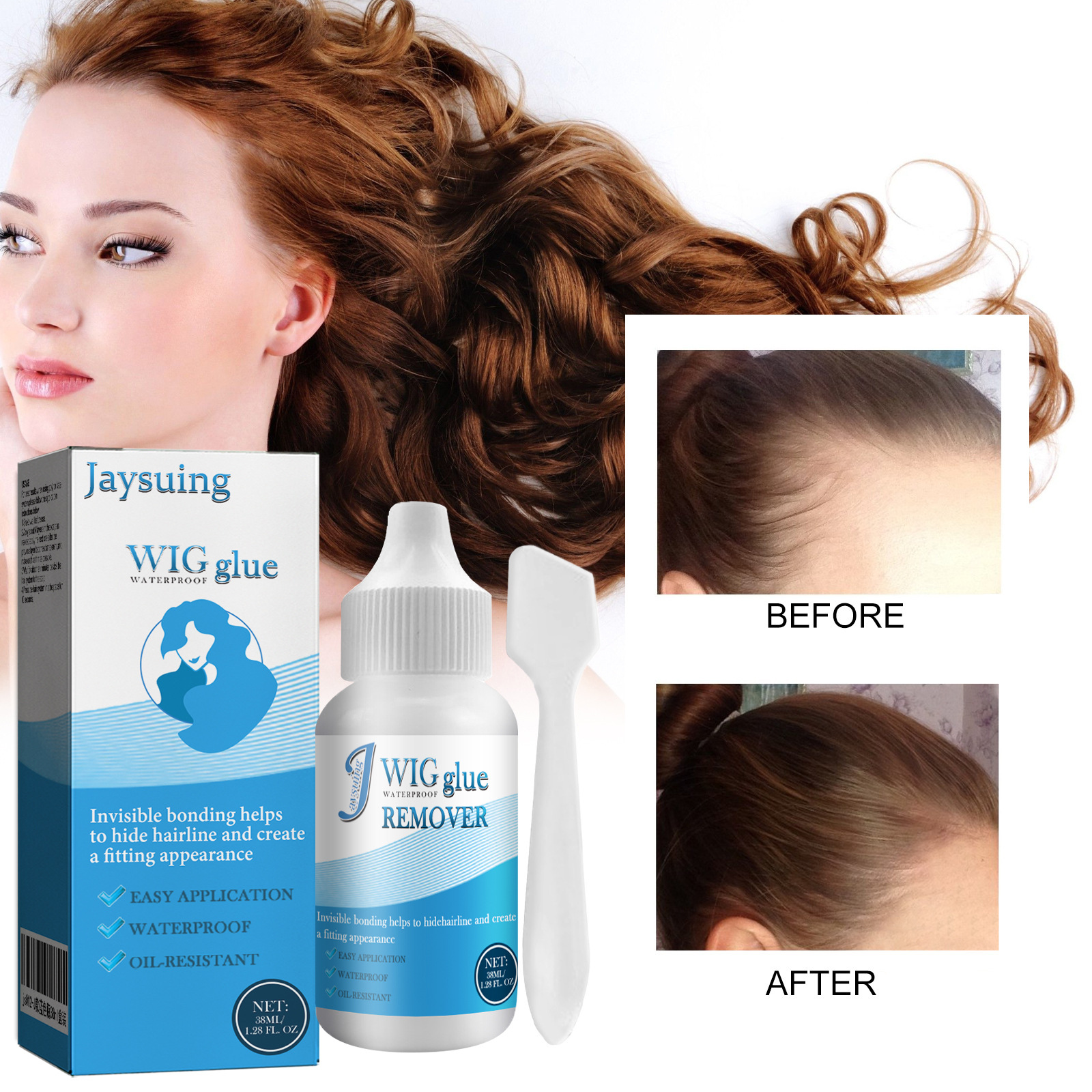 Our invisible adhesives contain alcohol, acrylic copolymer, glycerin. It can hide the hairline and create a natural look. Its application method is very simple: 1. Apply a thin layer to the skin, apply to the skin, and wait for 20-30 seconds. 2. Repeat this step up to 4 times, depending on how much strength you want to maintain. 3. After waiting and installing the last coat, wait 7 minutes and press the hair system in place. It can also make hair volume, shape.