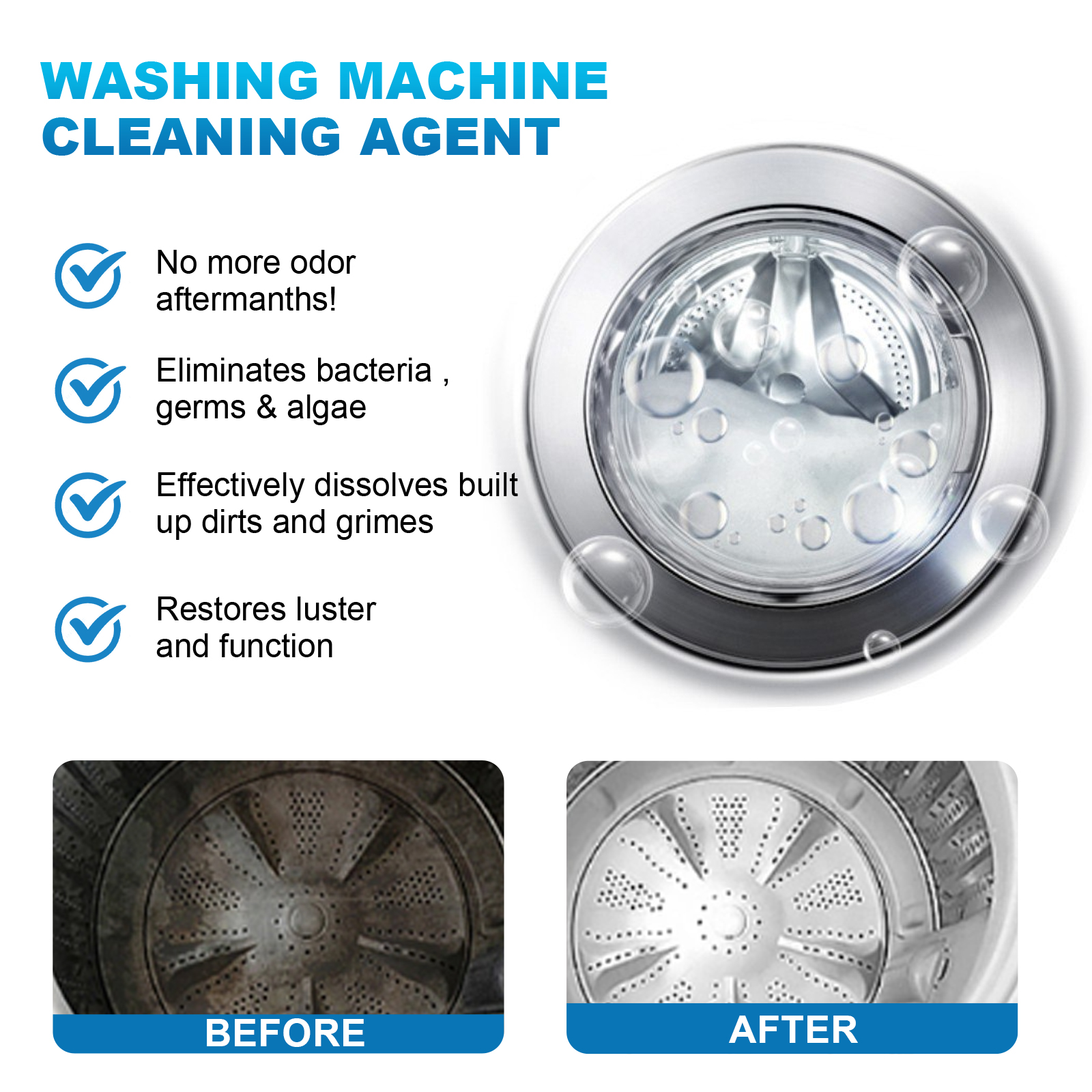 Our washing machine cleaner contains baking soda, lemon extract, bioenzyme. It can make your washing machine no longer unpleasant smell, completely remove the bacteria and algae in the washing machine, and effectively dissolve the accumulated dirt. Its use method is very simple: first wash the clothes with the washing machine, then pour the cleaning tablets into the washing machine, add an appropriate amount of warm water to dissolve the detergent, and finally start the self-cleaning mode of the washing machine to clean. After use, it helps the washing machine to remove dirt, restore luster and function, decontamination ability is strong, cleaning effect is good, and let your washing machine look new.