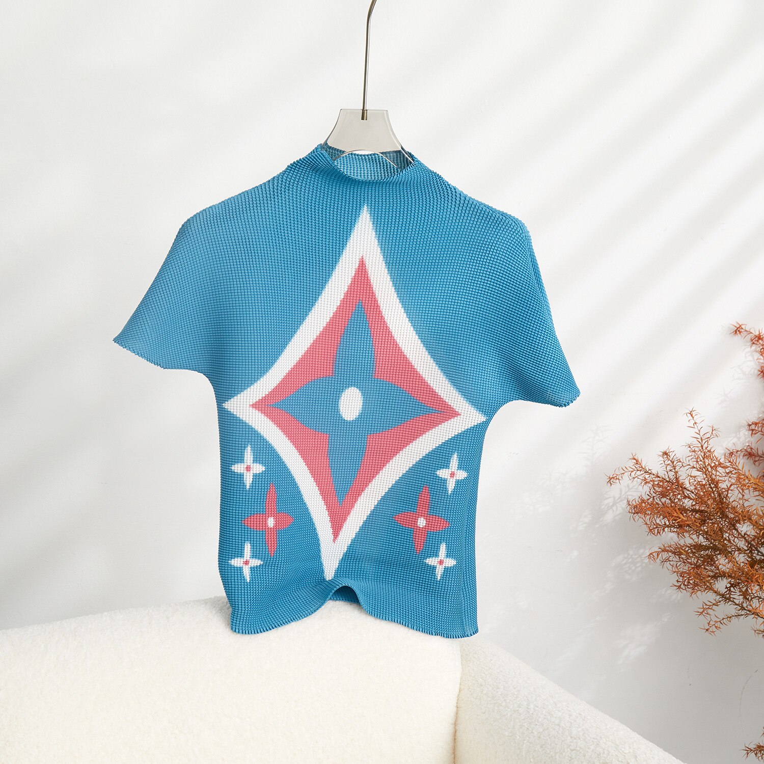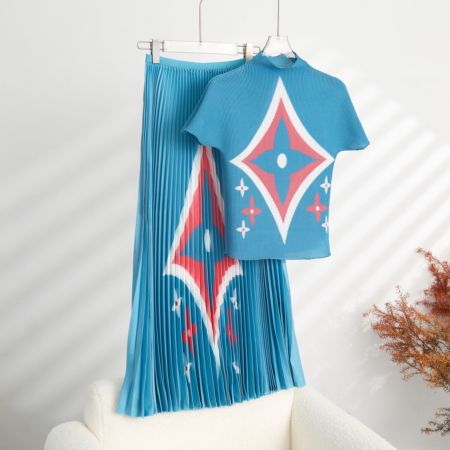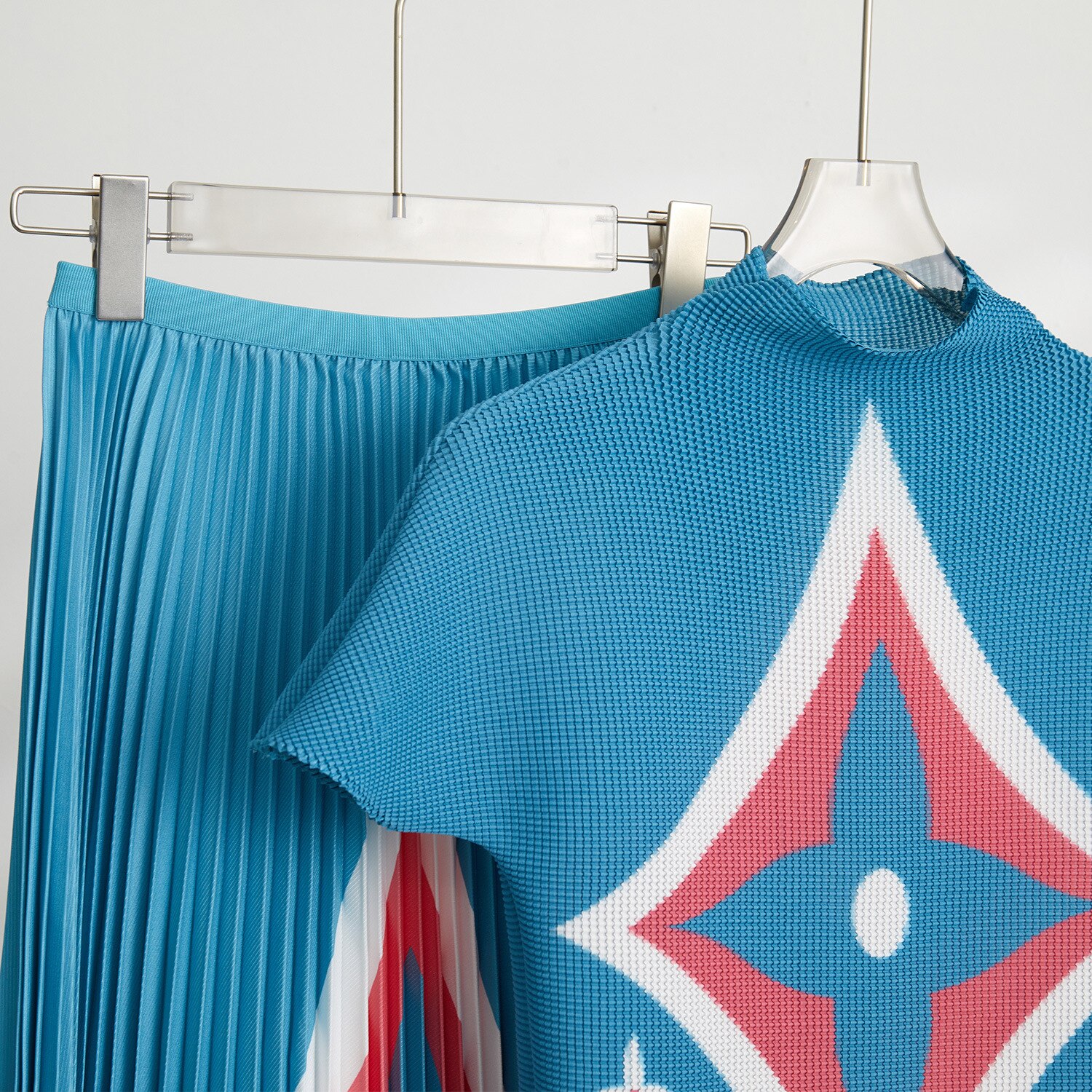 All Products Fashion & Clothing Suits & Sets Miyake Pleated Two-piece Set Women Outfit Abstract Printed Slim Top + High Waist Skirt 2023 Elastic Turtlenecks Two Peice Sets