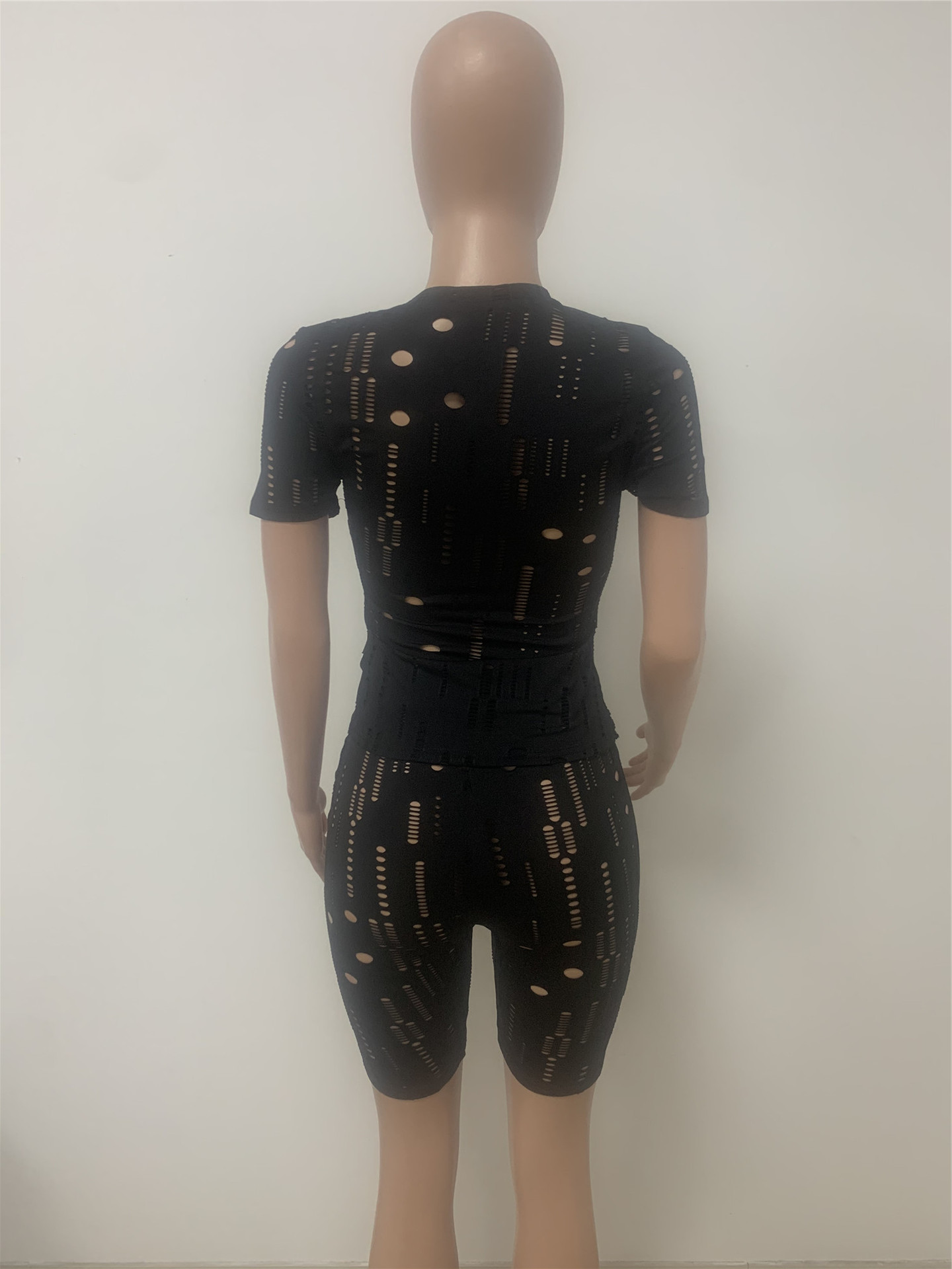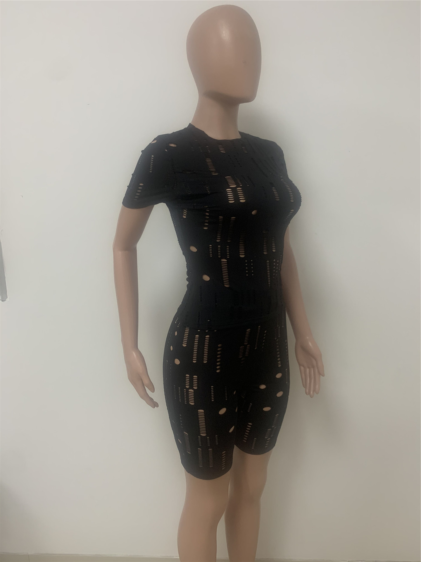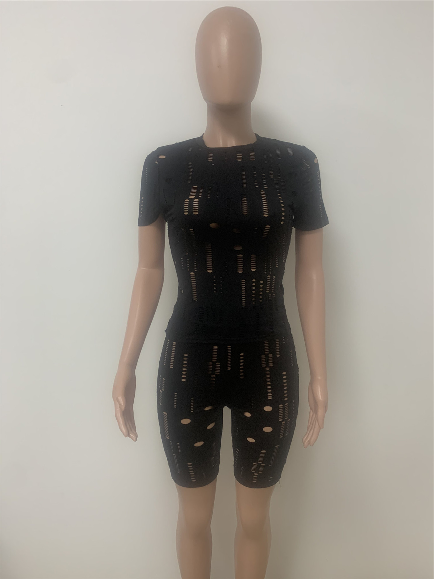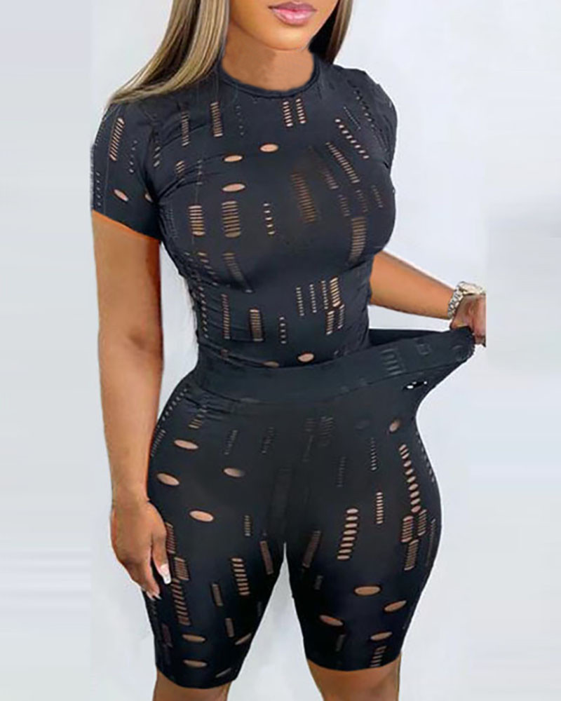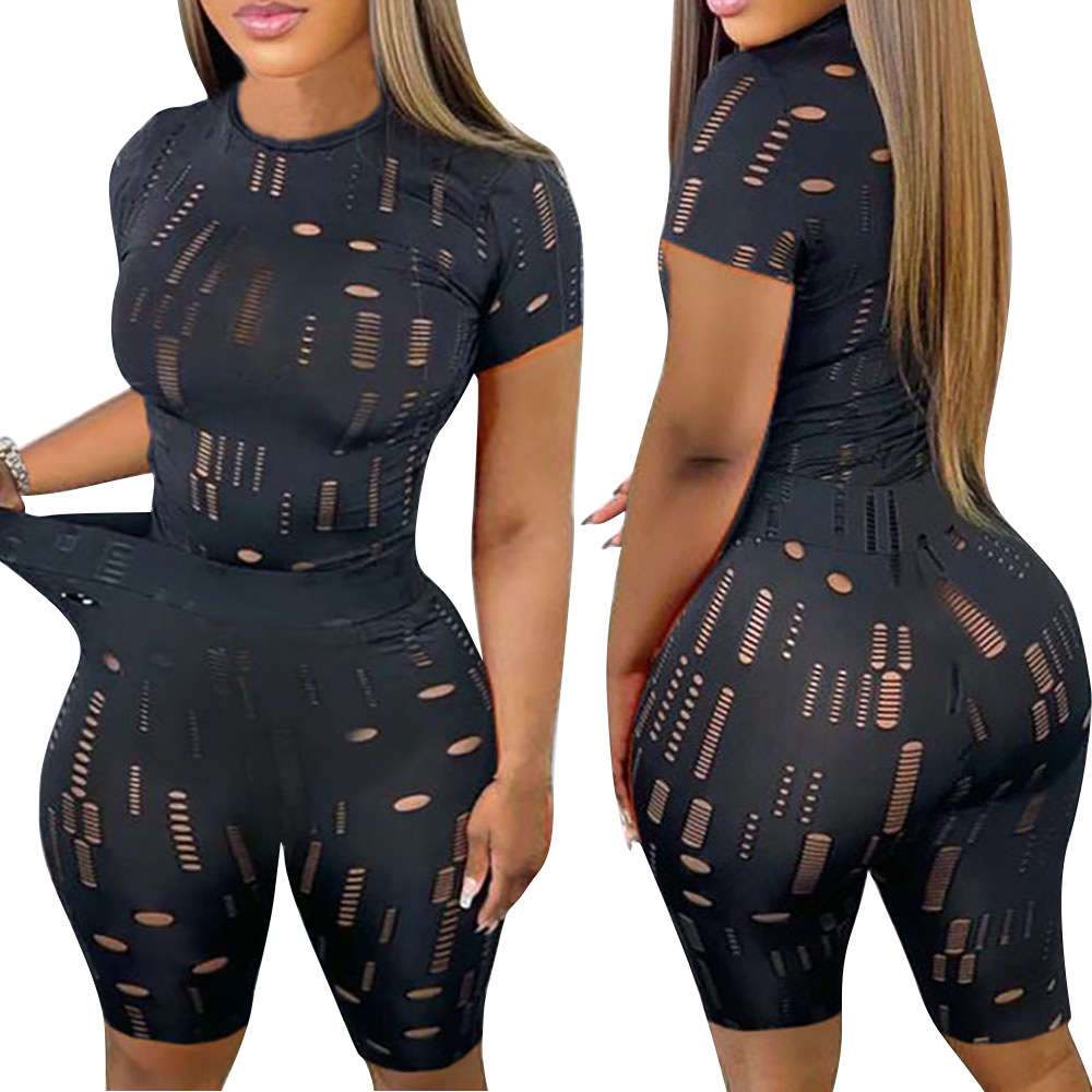 New Cross Women's Elastic Ripped Round Neck Short Sleeved Top Shorts Suit
