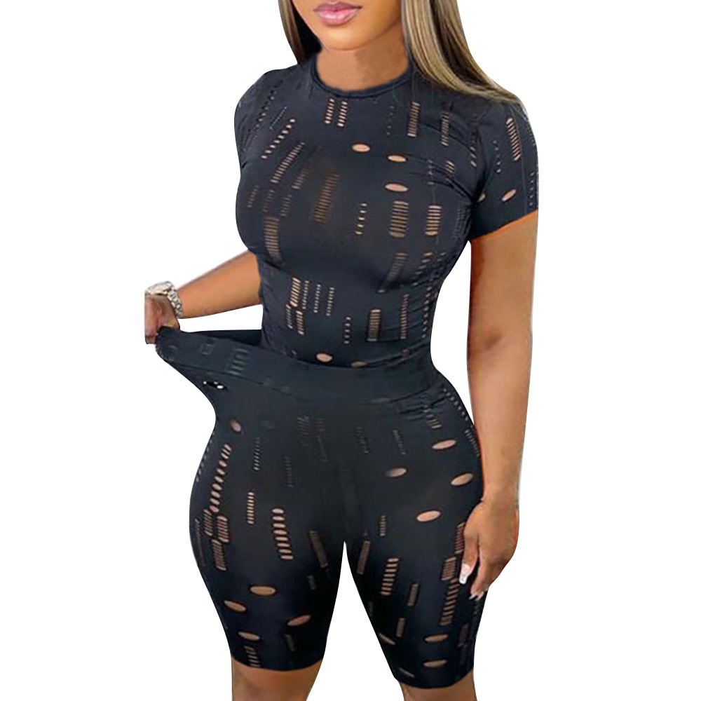 All Products Fashion & Clothing Sweaters New Cross Women's Elastic Ripped Round Neck Short Sleeved Top Shorts Suit