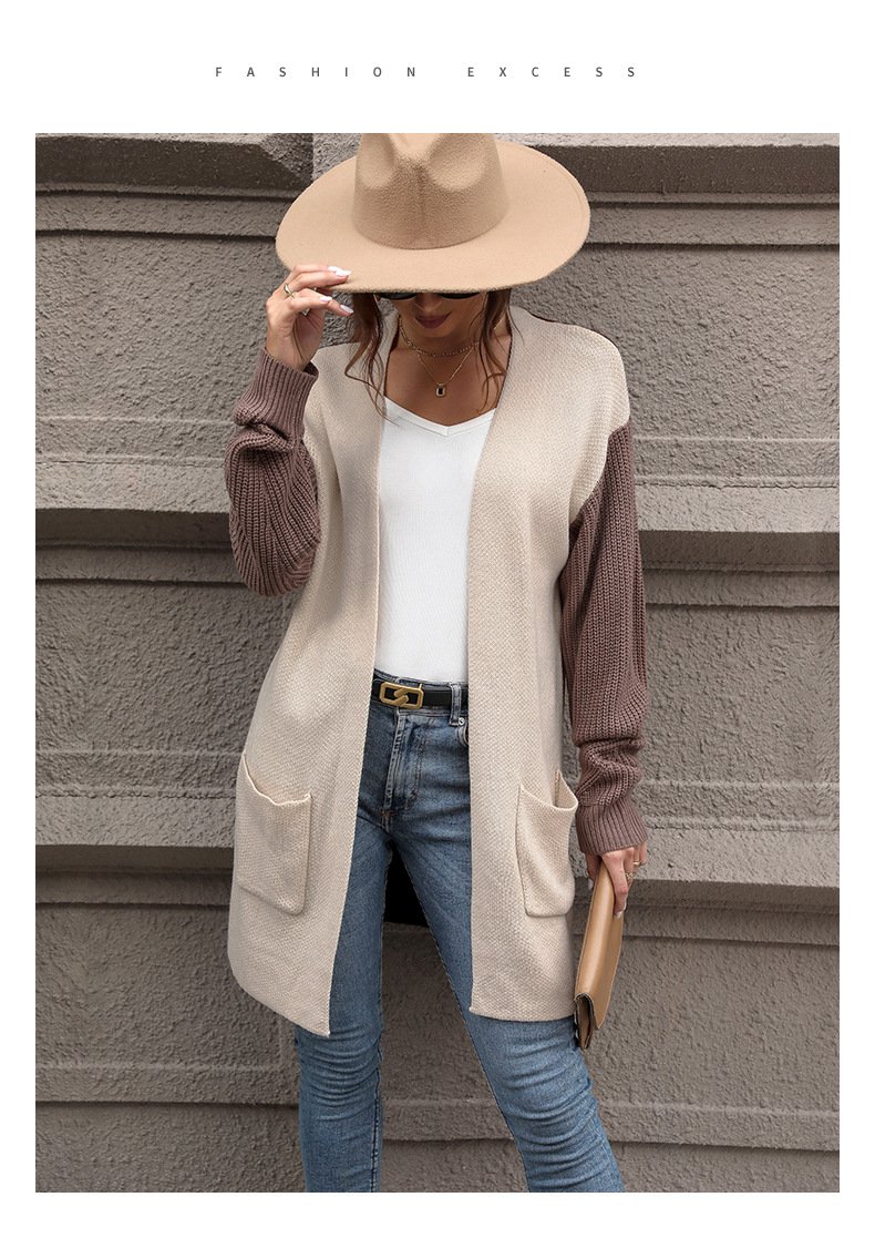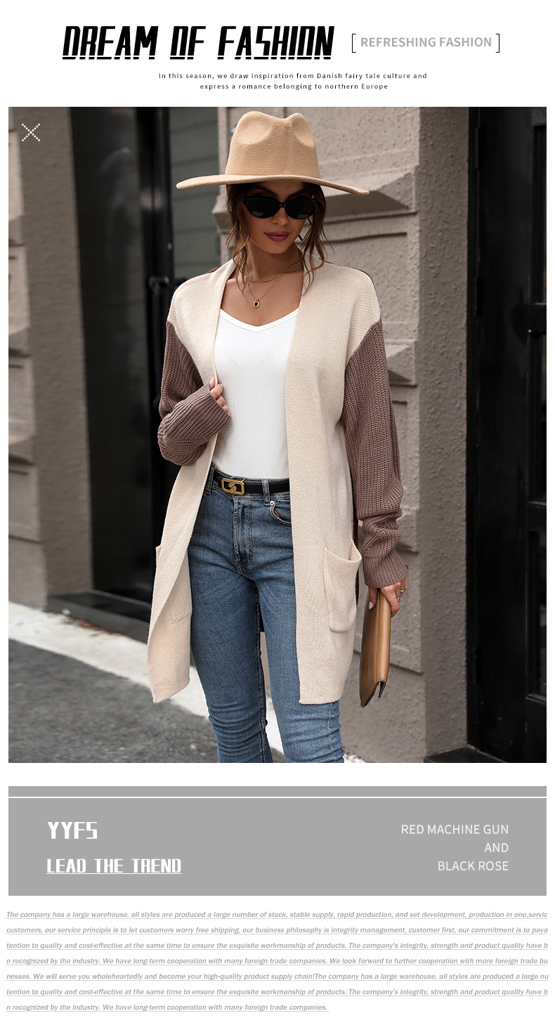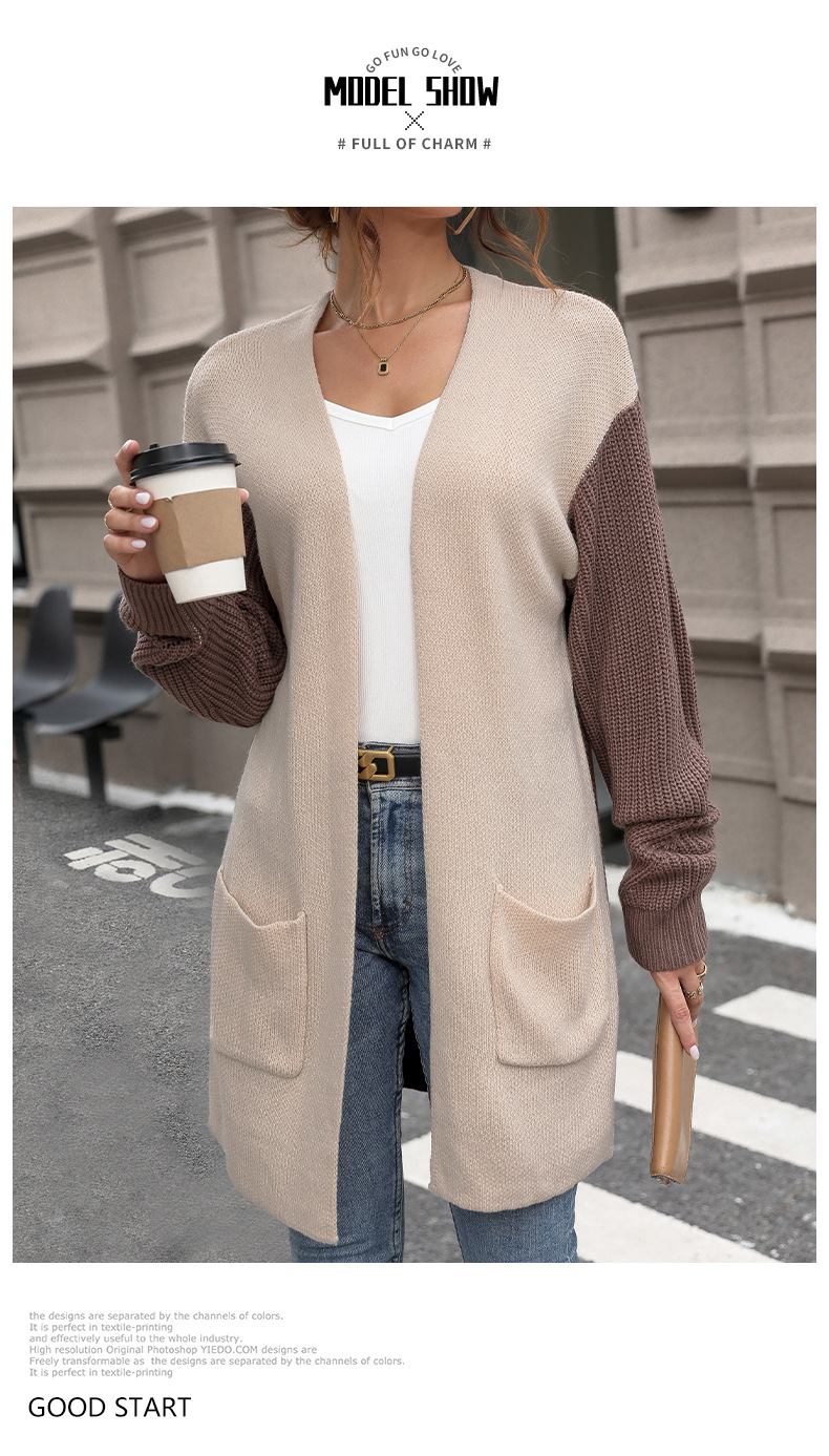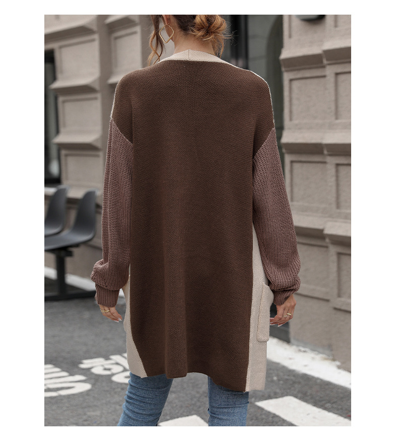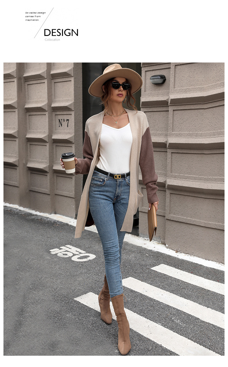 New European and American autumn women's long sleeved color blocked sweater cardigan jacket
