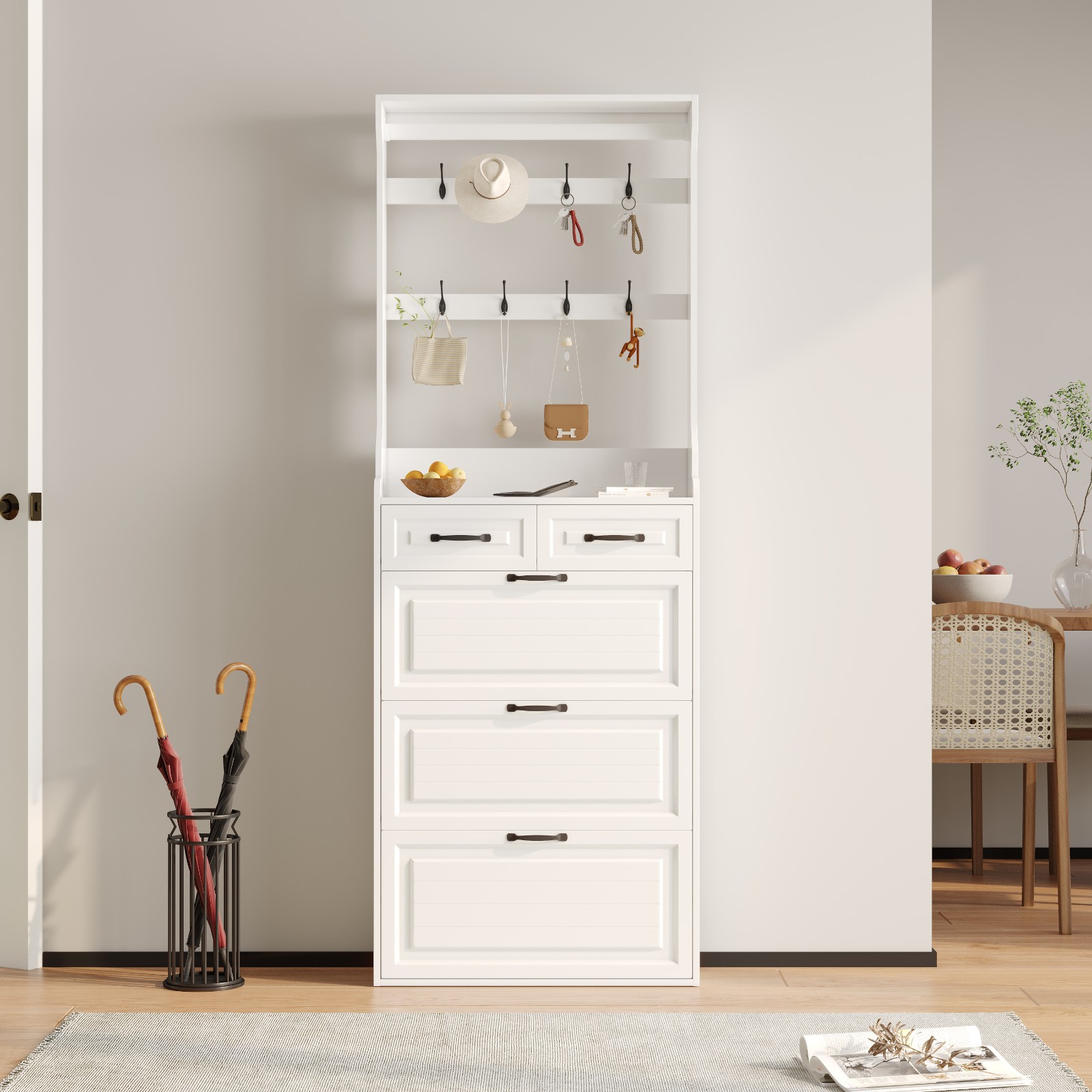 With 3 drop-down flap doors and 2 drawer storage. Perfect for keeping dust out!3 flip-drawers of the shoe cabinet provide ample storage space for your shoes.The shoe cabinet is thin enough to fit even in a narrow hallway.Material: MDF in white finish.Item comes in a flat pack and requires self-assembly. Detailed instructions supplied.