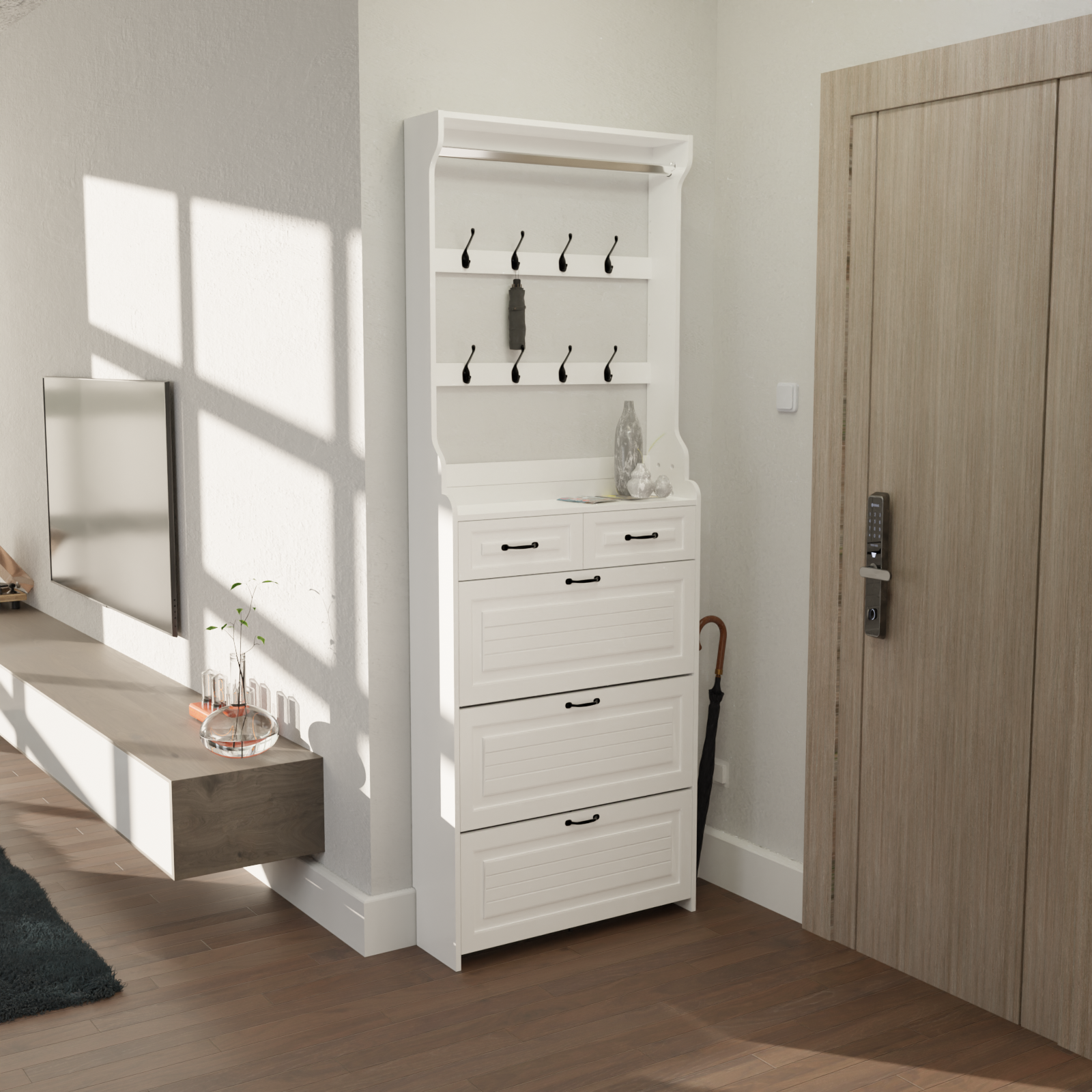 White shoe cabinet with hanger